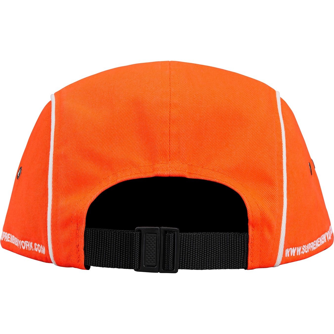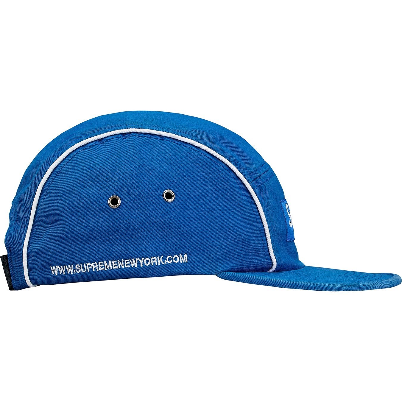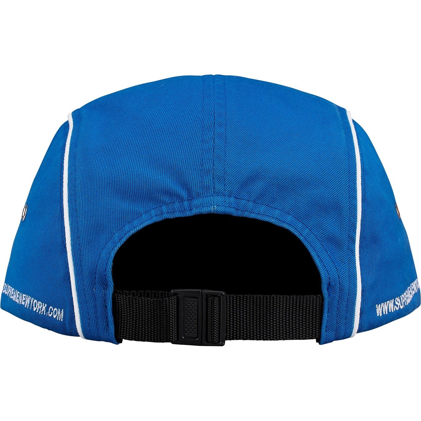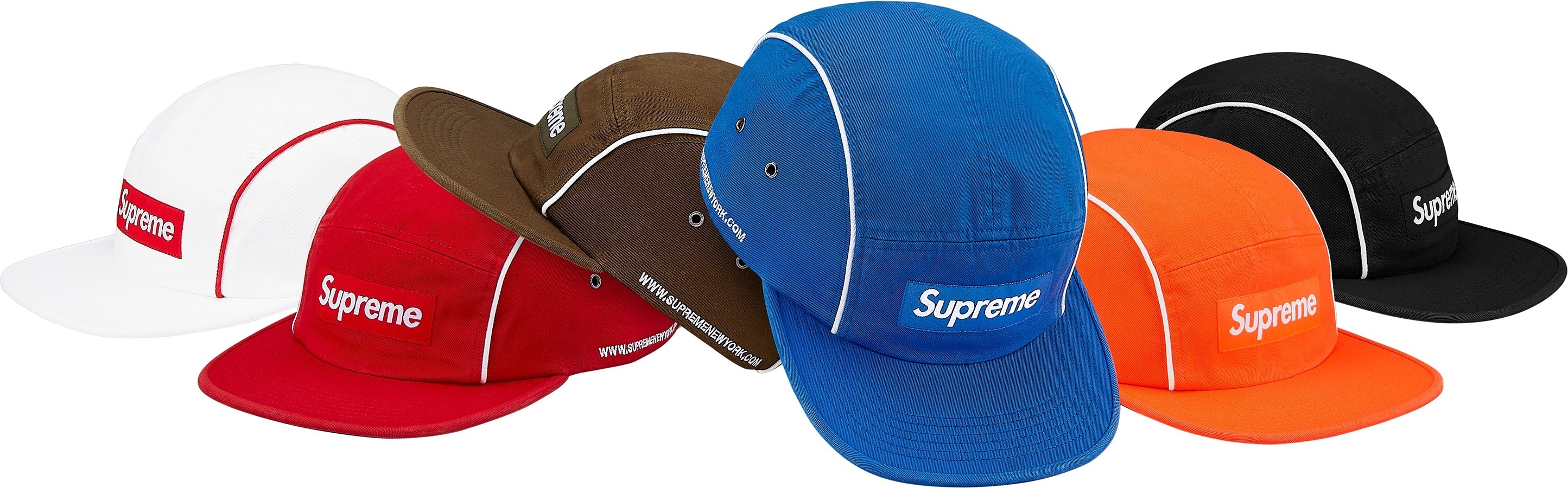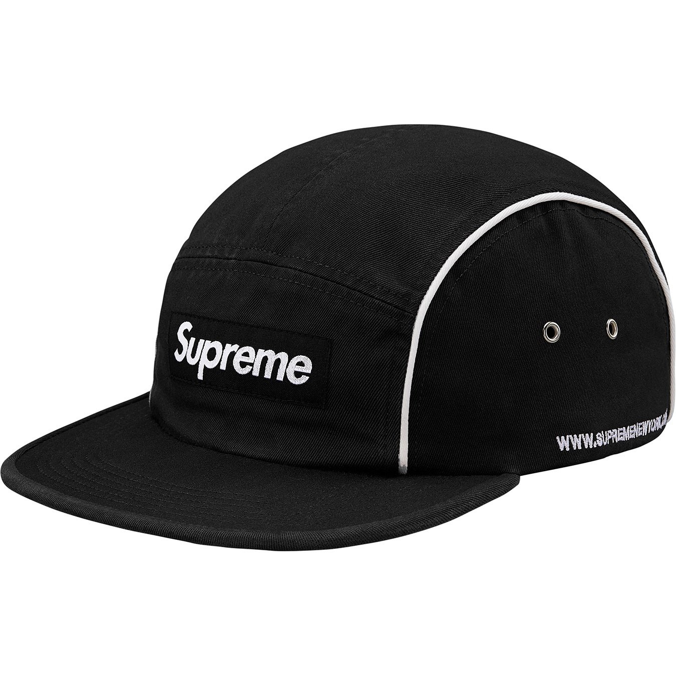 All cotton twill Supreme camp cap with contrast piping and embroidered graphic on side.