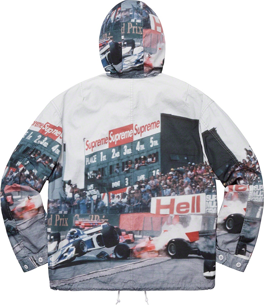 All cotton with printed graphic and cotton lining. Full zip closure with hidden snap placket and snap flap hand pockets at lower front. Drawcord at hood and hem with two-button tab adjusters at cuffs.