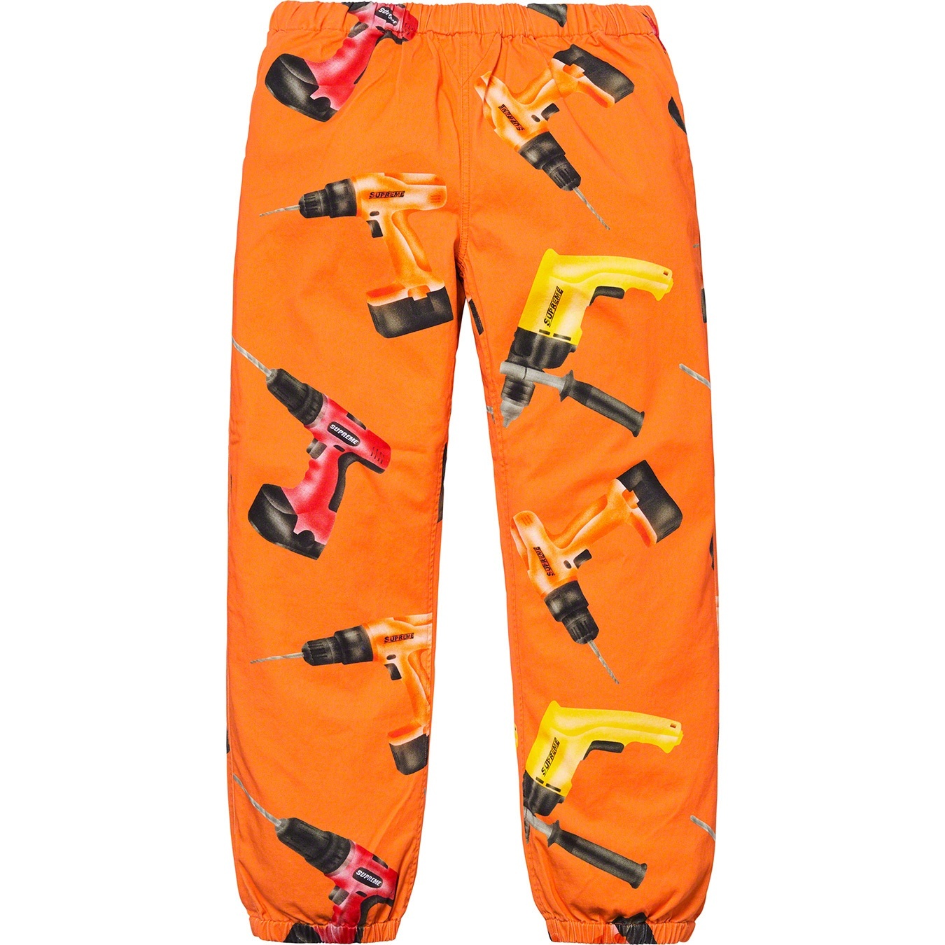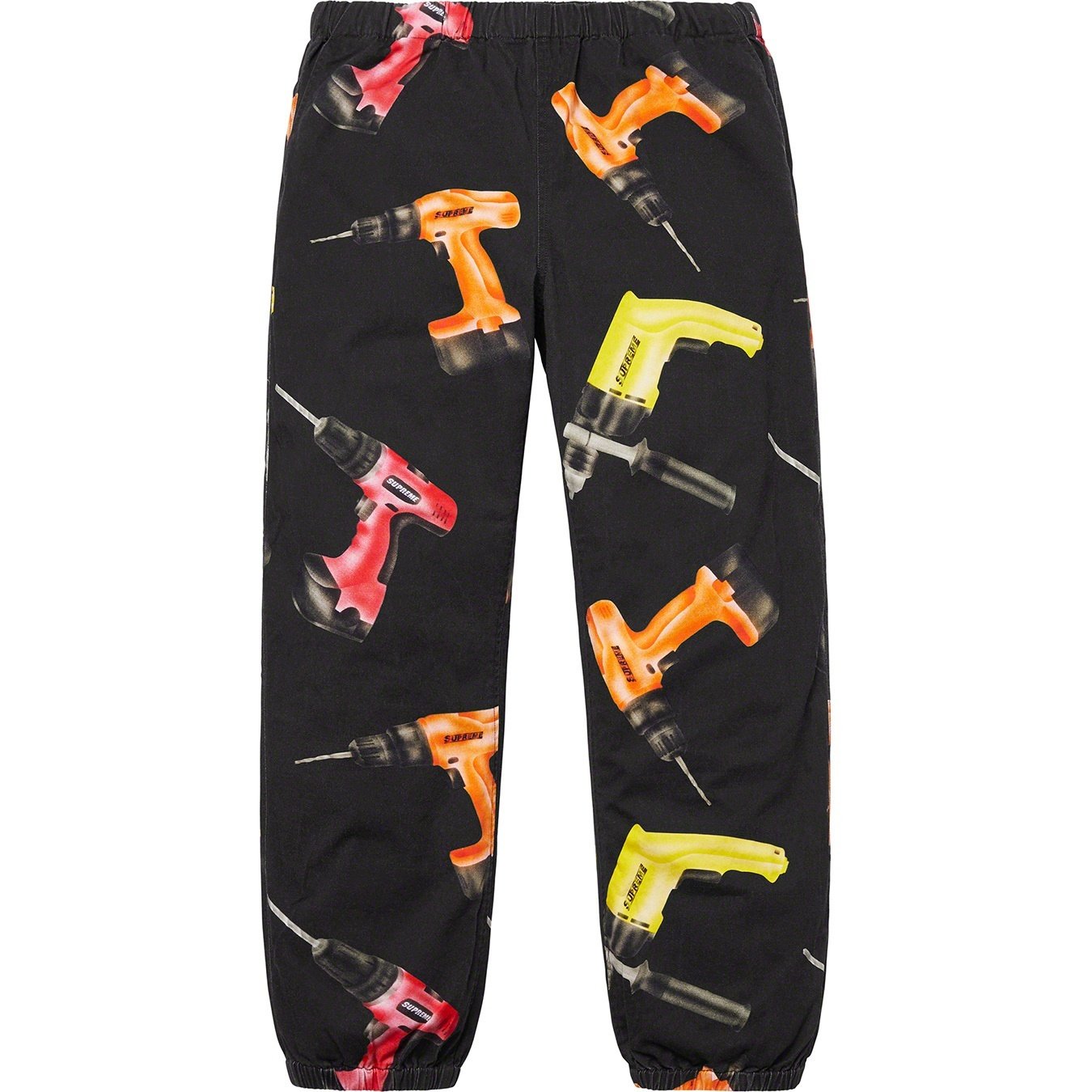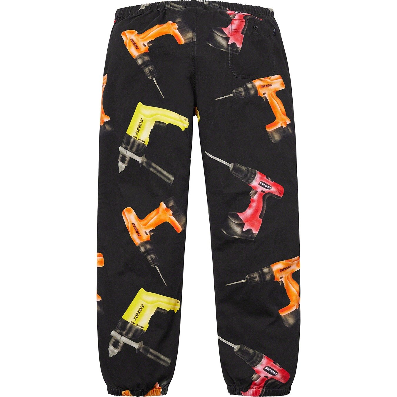 All cotton twill with printed pattern, slanted front pockets and back patch pocket with button closure. Elastic cuffs and waistband with interior drawcord.