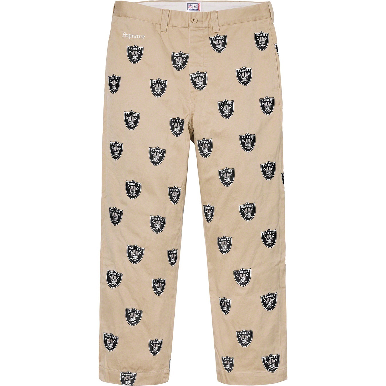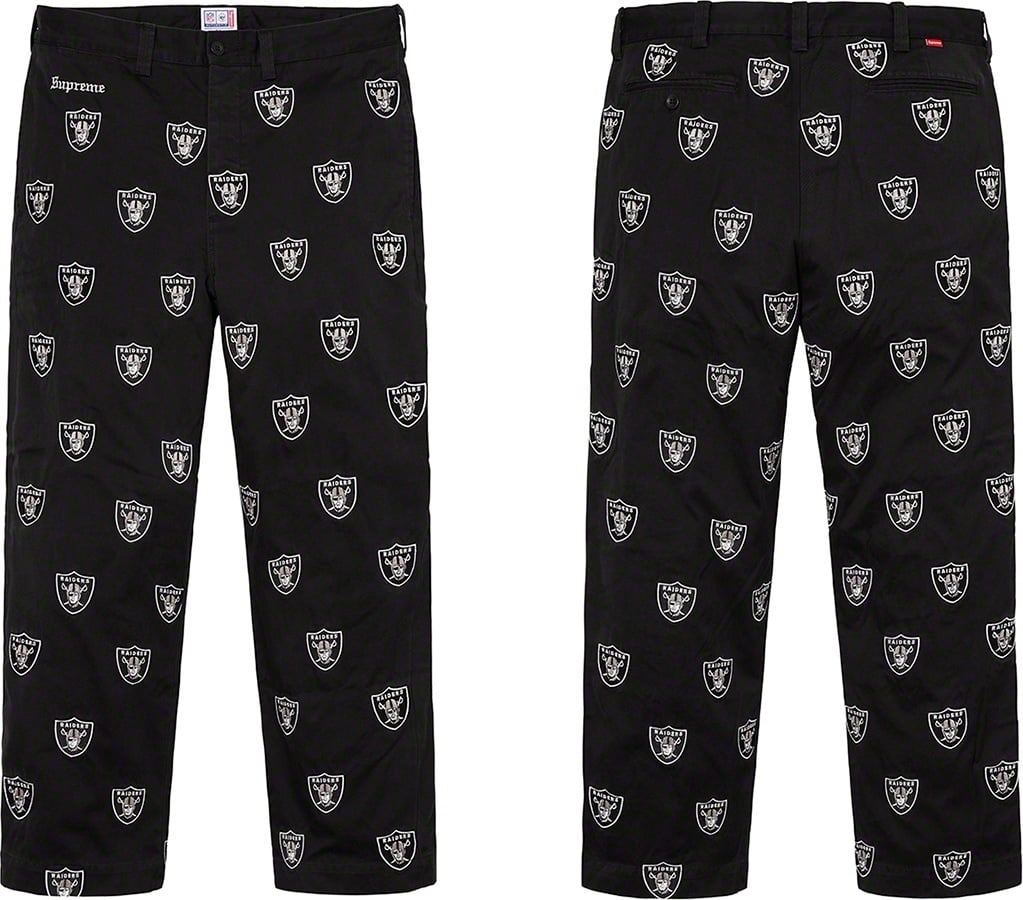 All cotton twill with embroidered logo pattern and enzyme wash. Relaxed fit with on seam hand pockets, welt back pockets and button fly closure. Embroidered logo at waist. Official Raiders merchandise made exclusively for Supreme.
