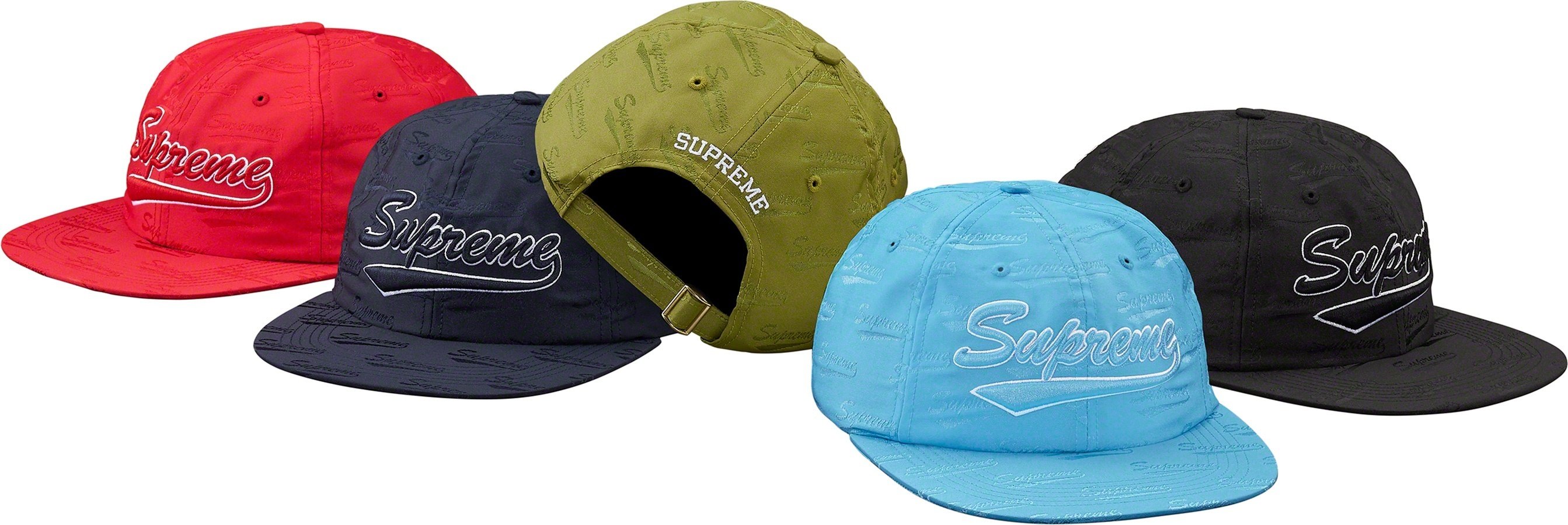Poly 6-Panel hat with jacquard logo pattern and self strap closure. Embroidered logos on front and back.