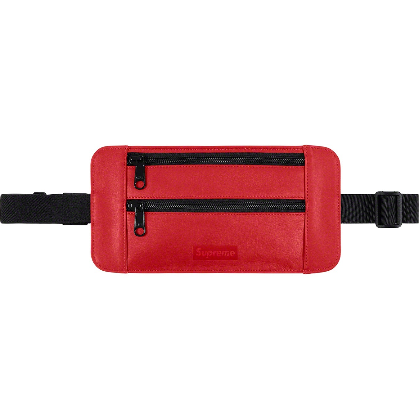 Cowhide leather with taffeta lining and adjustable webbing strap closure. Two front zip pockets and single back zip pocket. Debossed logo on front.