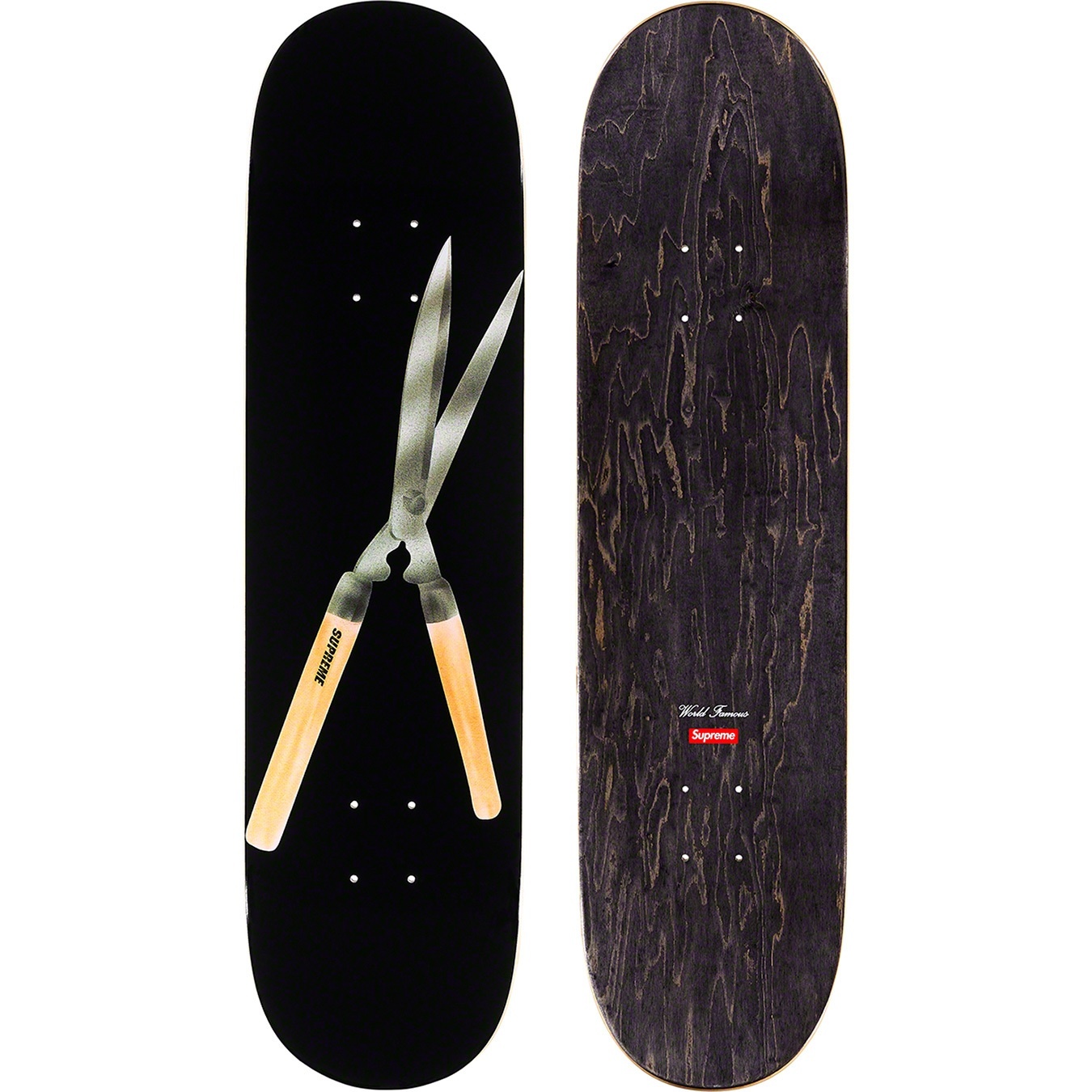 Supreme skate deck with natural veneers and black top ply. Printed graphic on bottom with printed World Famous and box logo on top.