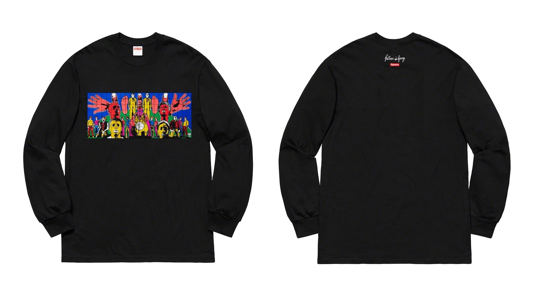 All cotton classic Supreme long sleeve t-shirt with printed graphic on front and back. Original artwork by Gilbert & George.