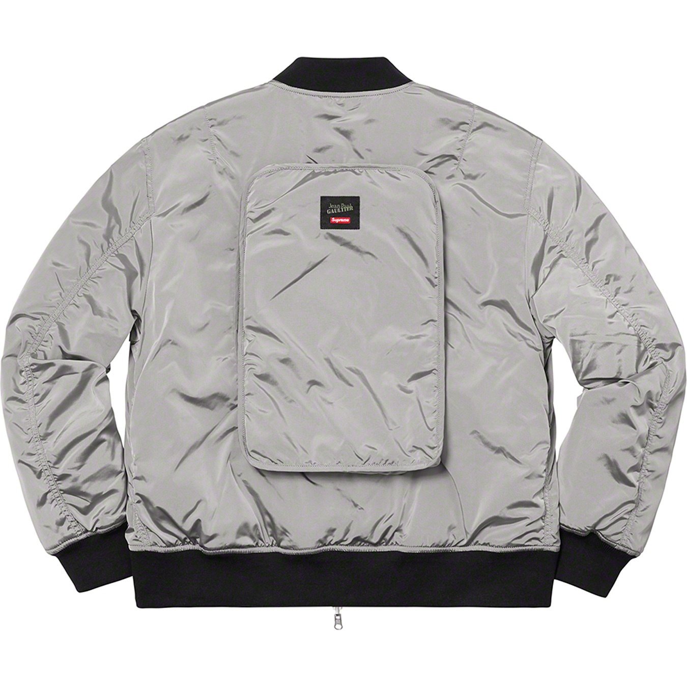 Water resistant poly with fill and full zip closure. Hand pockets with snap closures at lower front. Knit rib collar, cuffs and hem. Enamel logo plate on chest and printed graphic on reverse side. Packable backpack construction.