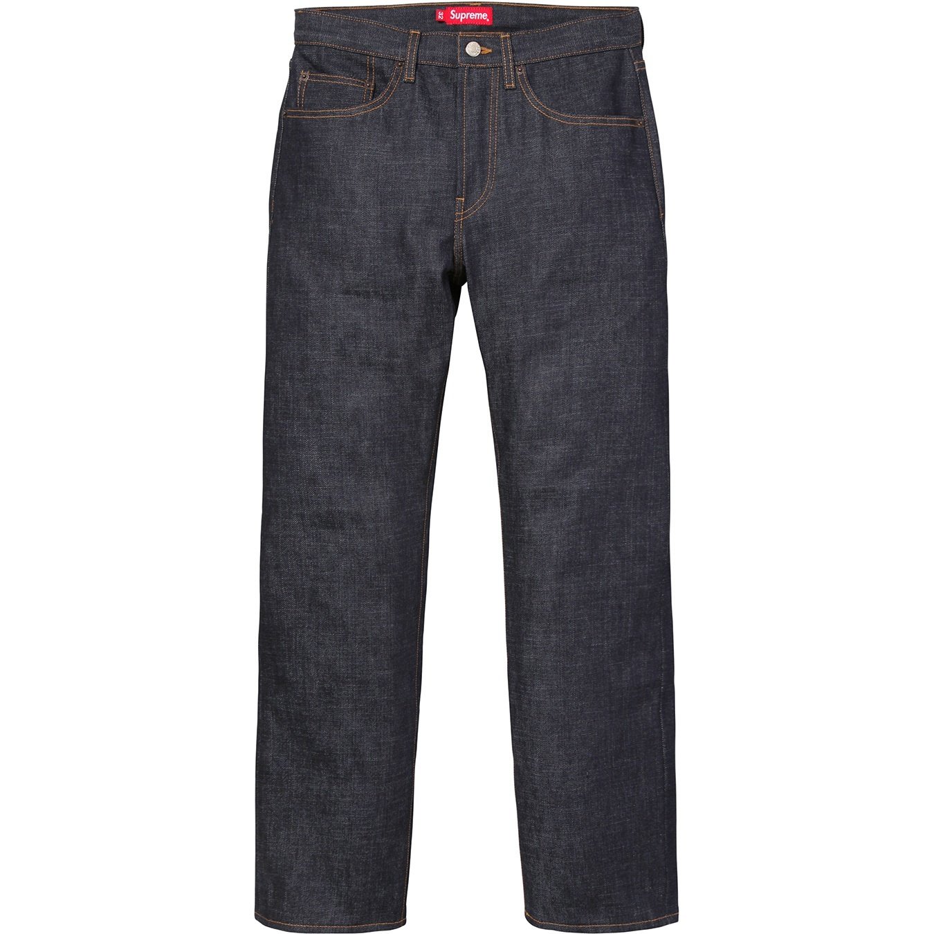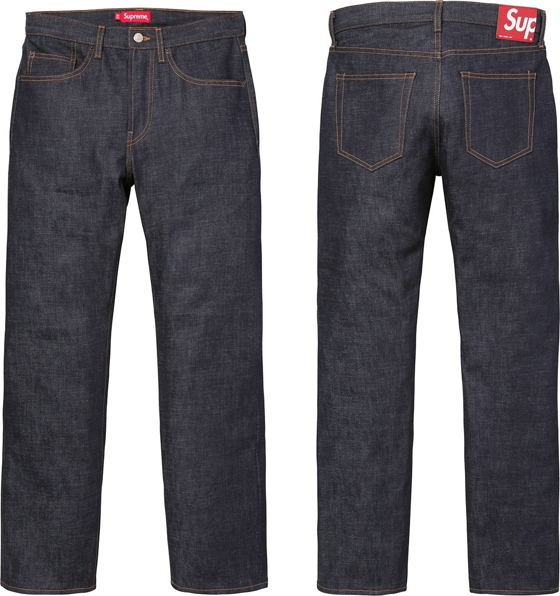 All cotton 14 oz. selvedge denim. Classic 5-pocket style with red leather patch on back.