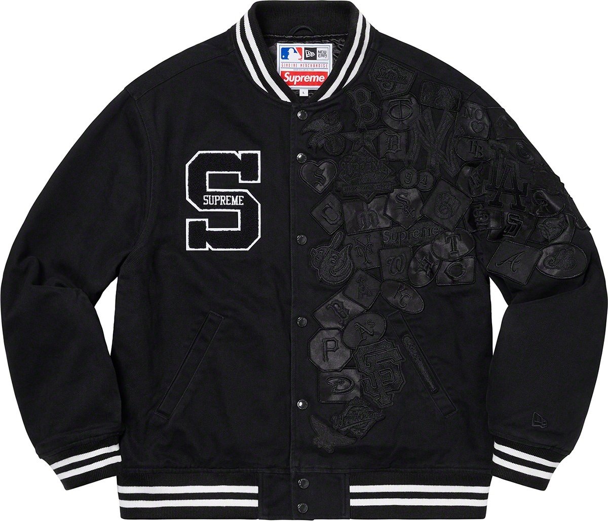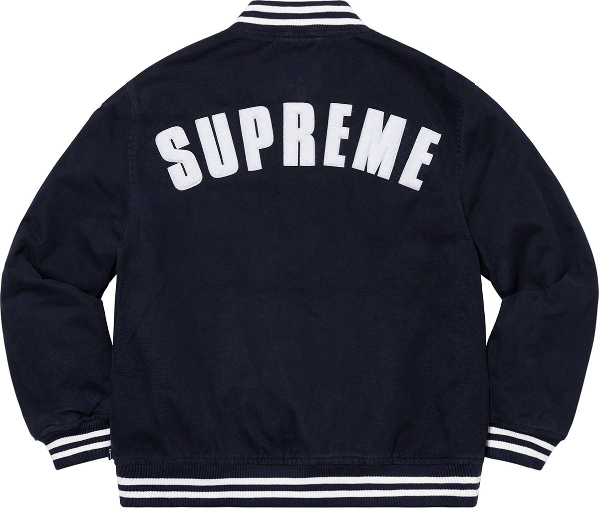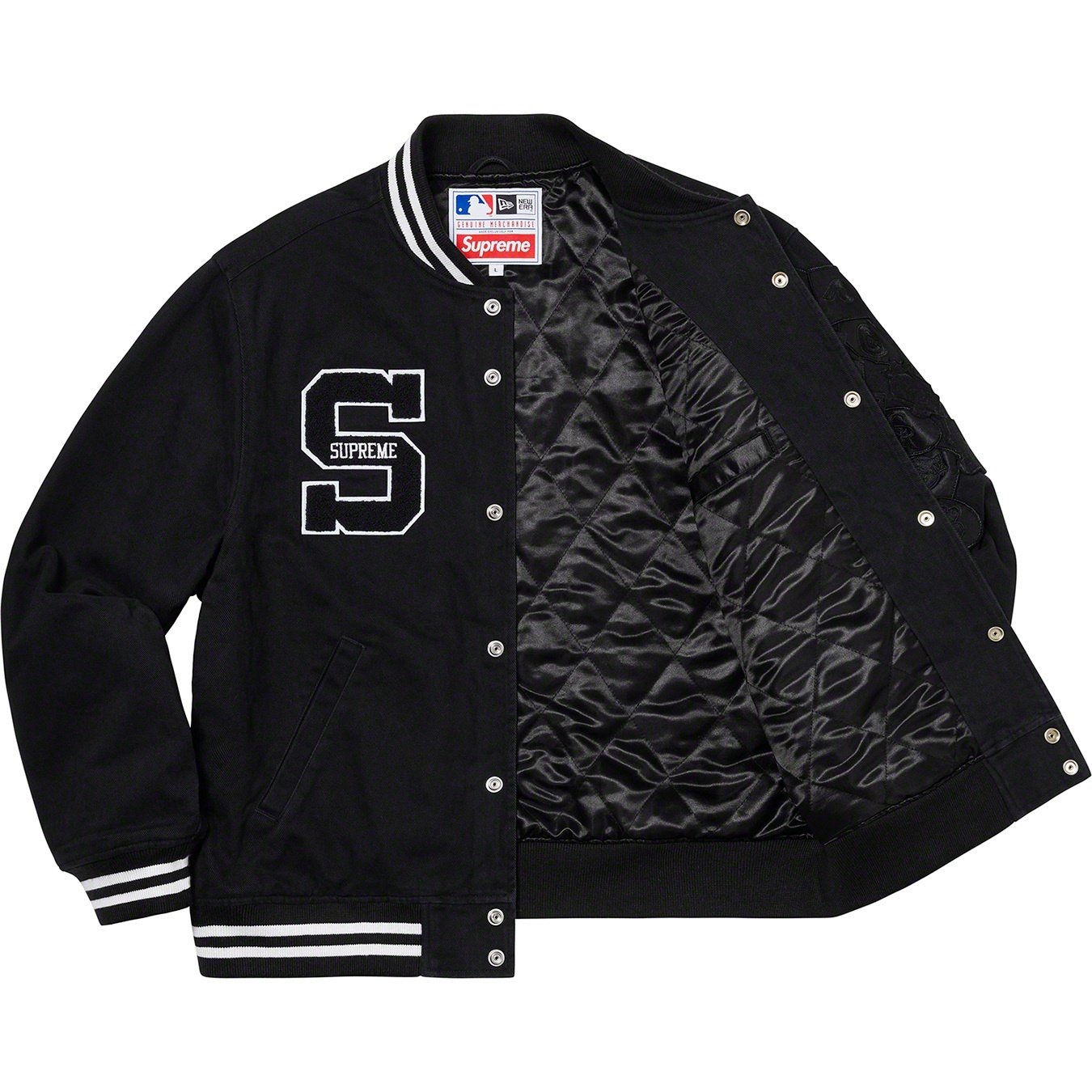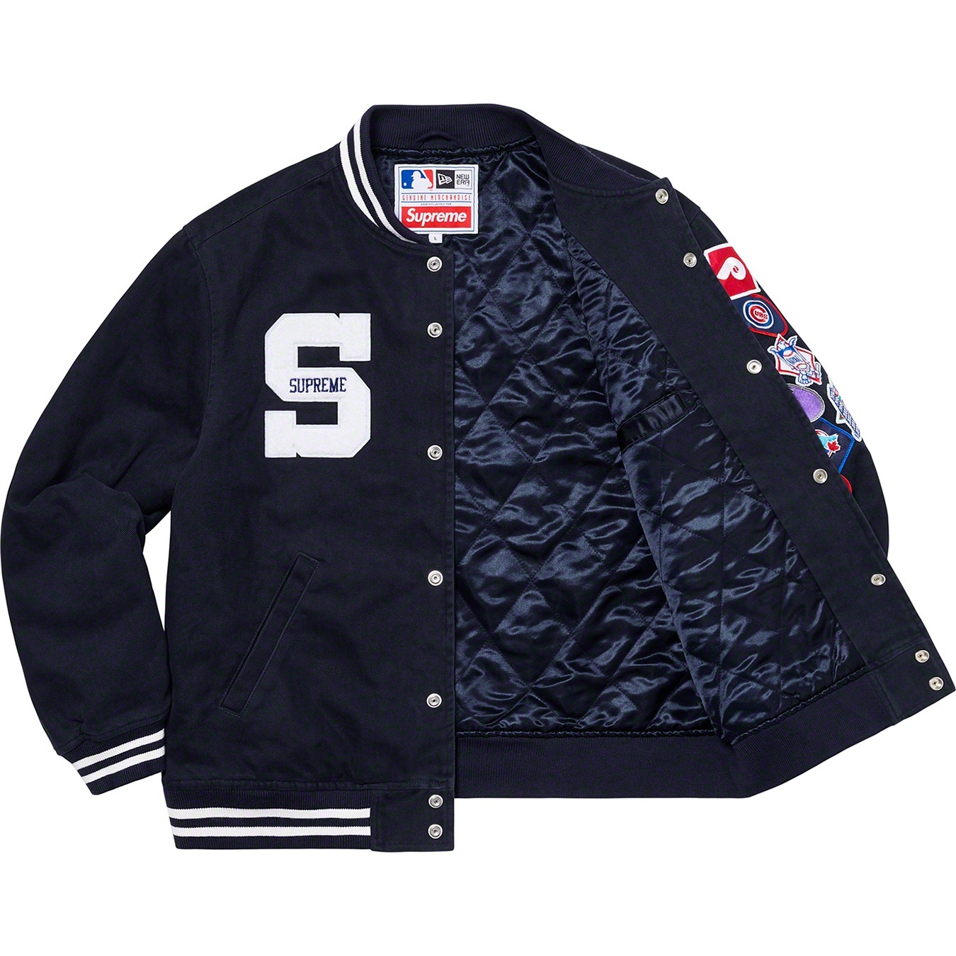 All cotton twill with fill and quilted satin lining. Snap front closure with welt hand pockets at lower front and interior chest pocket. Stripe rib collar, cuffs and hem. Chenille appliqué logos at chest and back with embroidered logo on sleeve. New E...