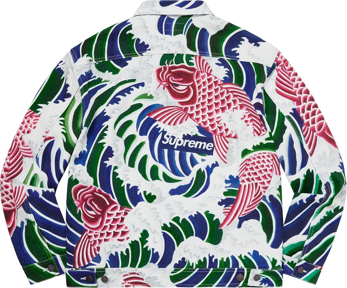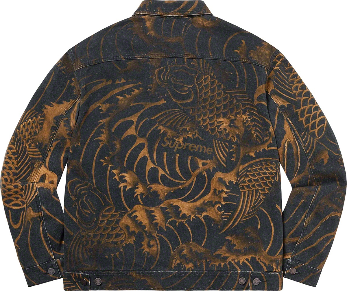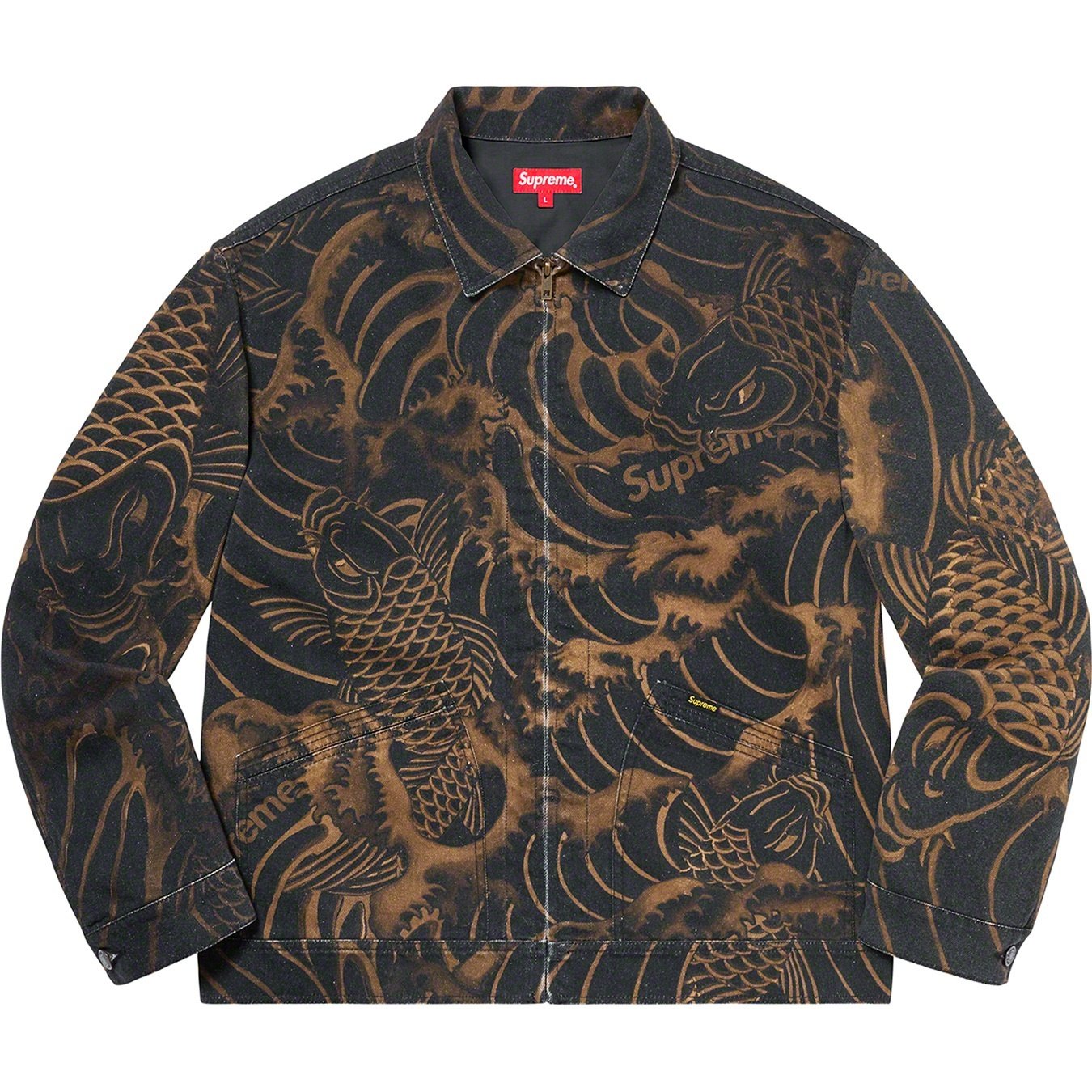 All cotton 13 oz. denim with printed pattern and full zip closure. Double welt patch pockets at lower front and button adjusters at cuff and hem.