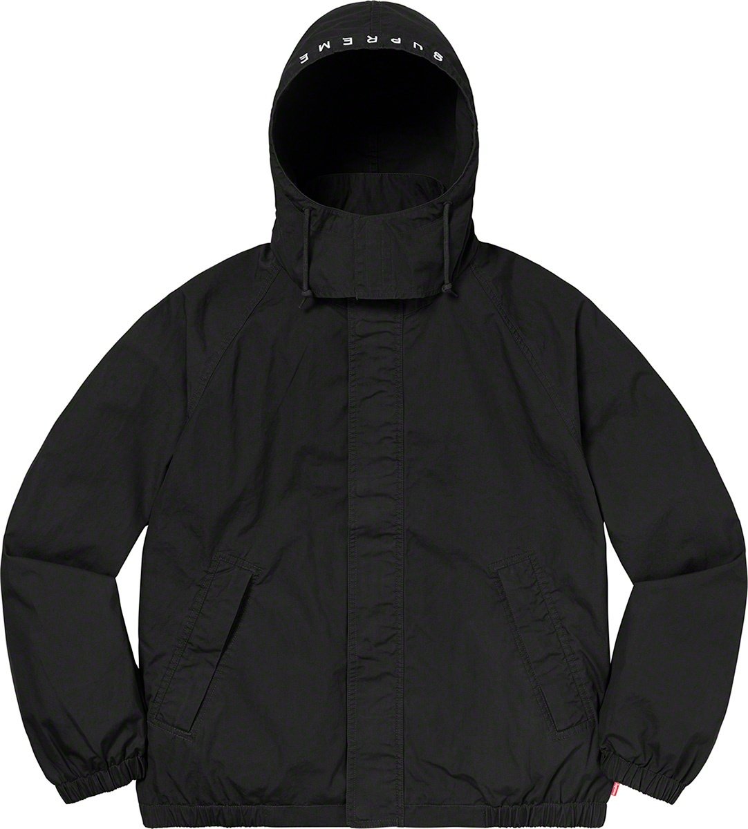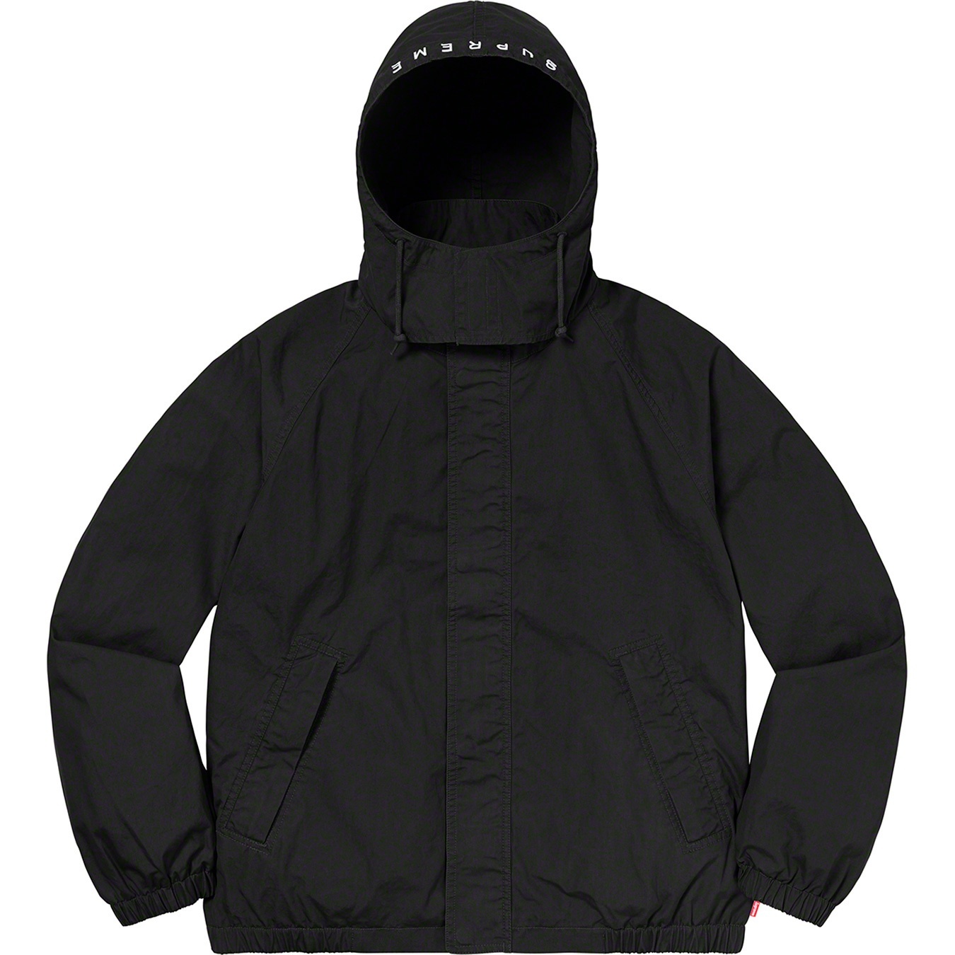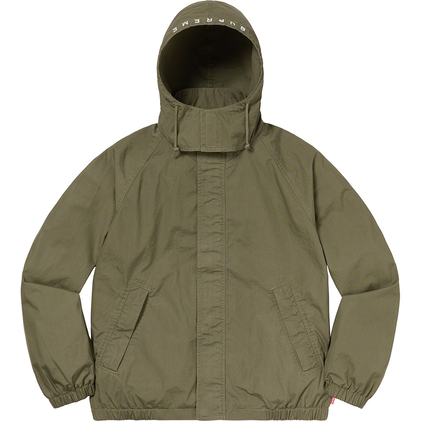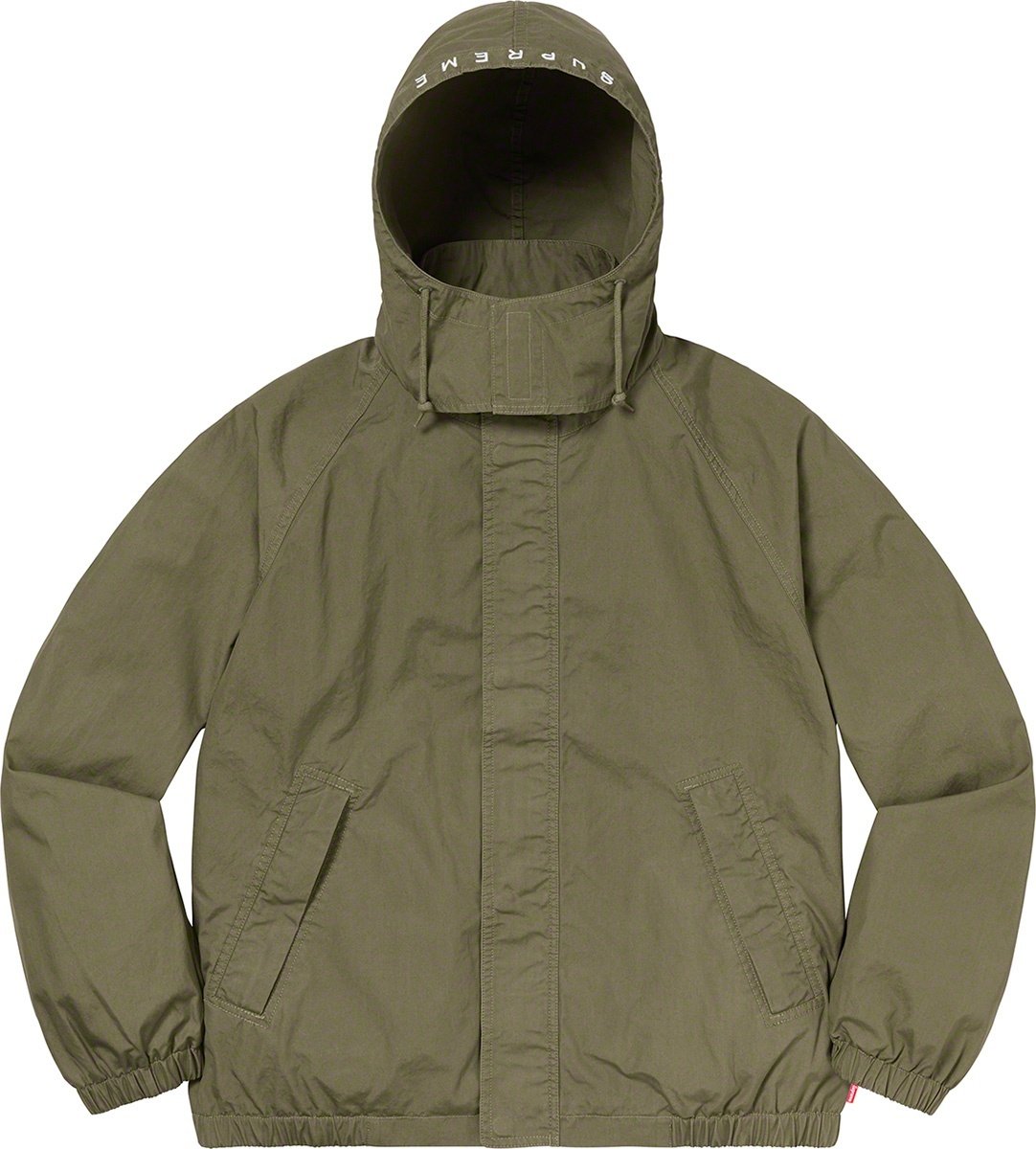 Water resistant cotton with mesh lining. Full zip closure with hidden snap placket. Zip hand pockets at lower front with interior chest pocket and zip pocket at back. Packable hood with interior drawcord and elastic cuffs and hem. Embroidered logo on ...