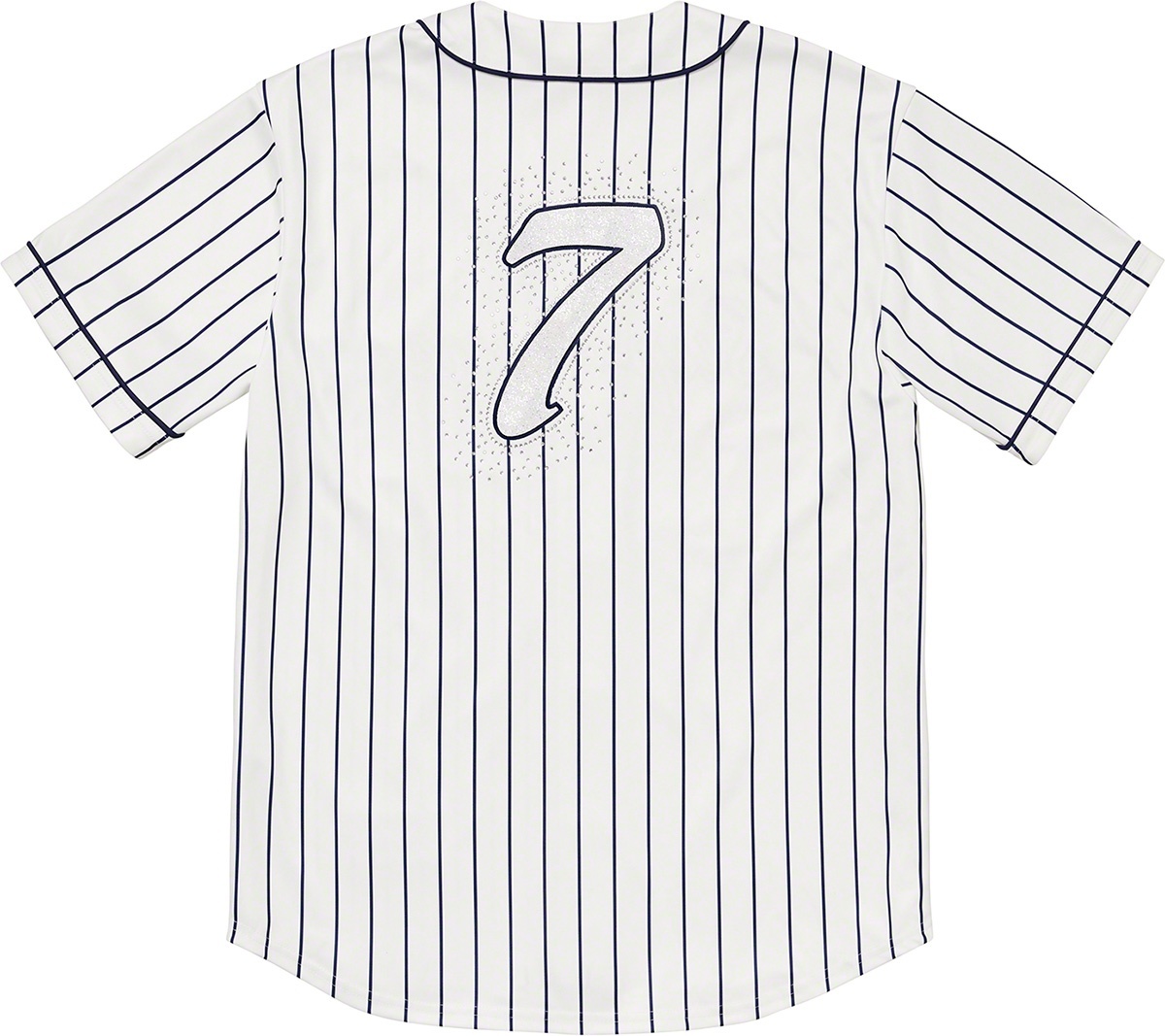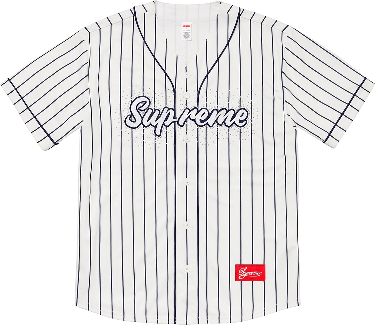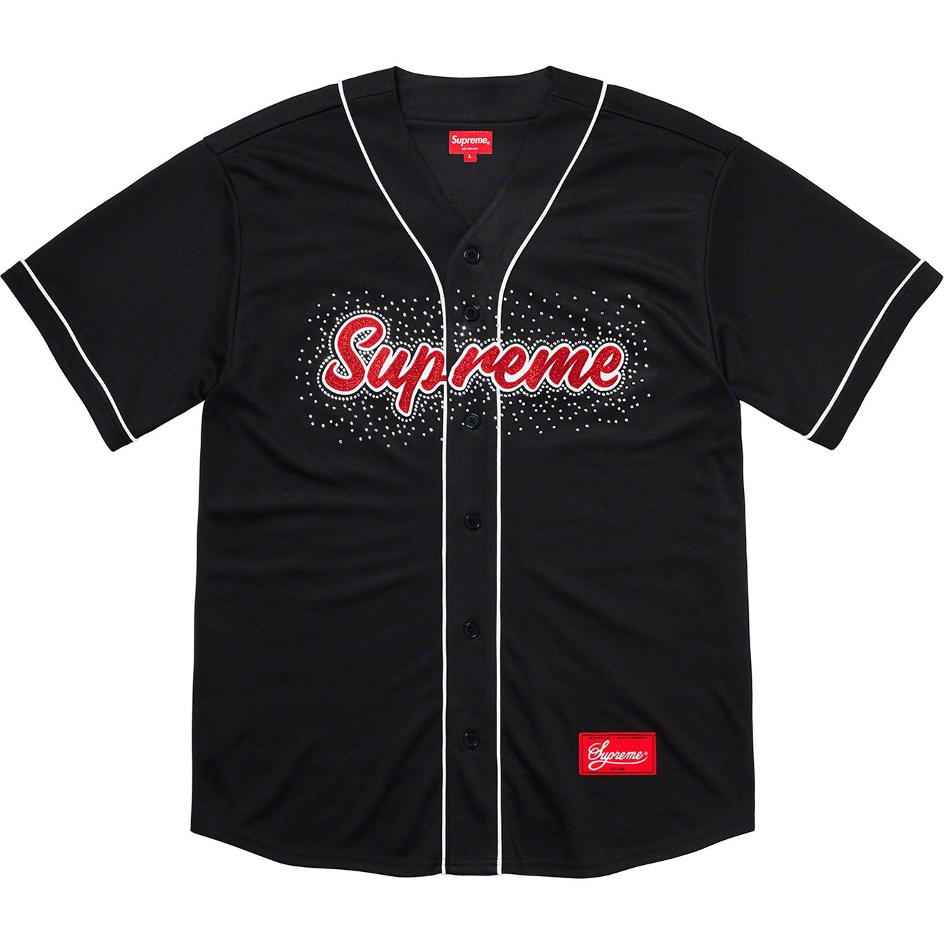 Poly with button front closure. Tackle twill and rhinestone appliqué logo at chest and graphic at back. Athletic label at lower front.