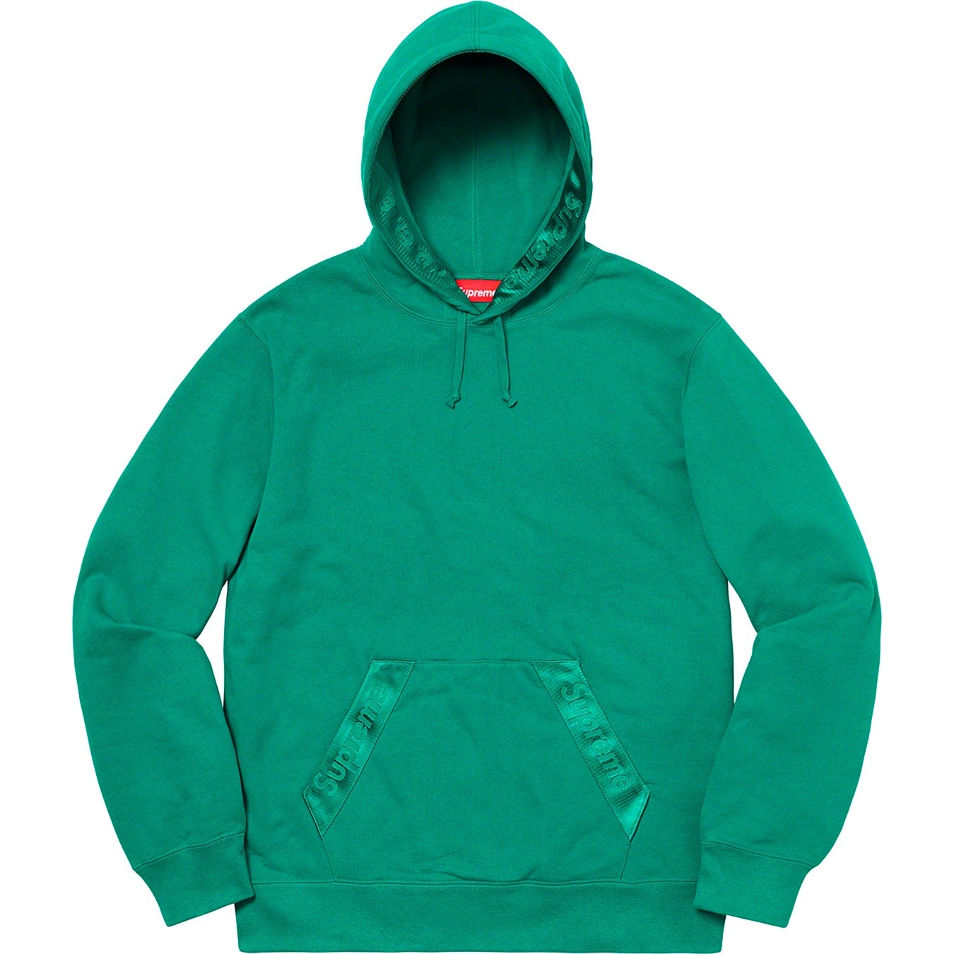 Cotton fleece with debossed logo webbing at pouch pocket and hood.
