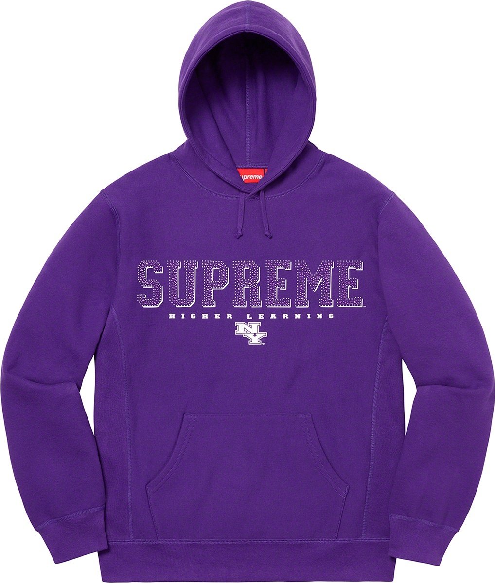 Cotton fleece with rib gussets, pouch pocket and gem appliqué logo on chest.