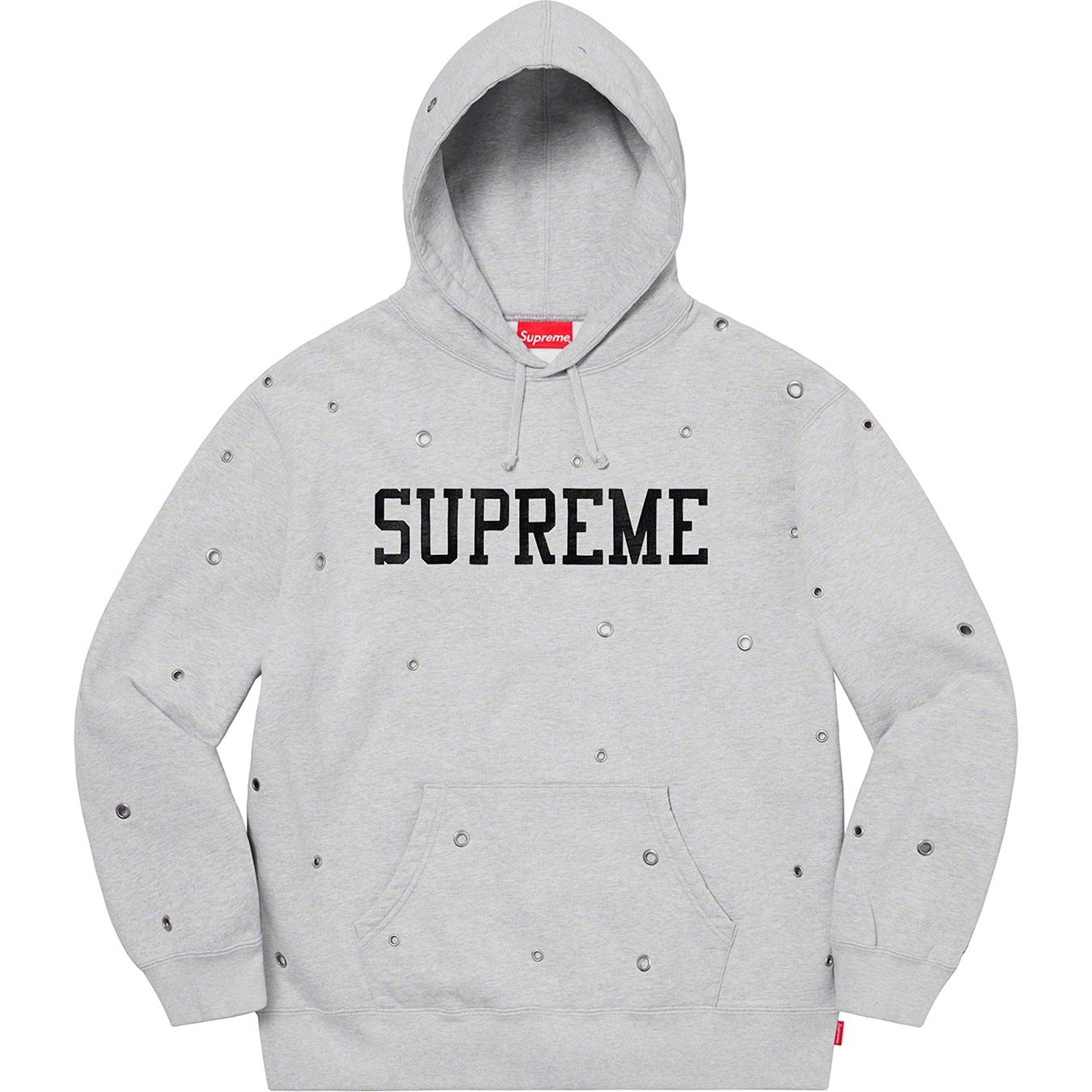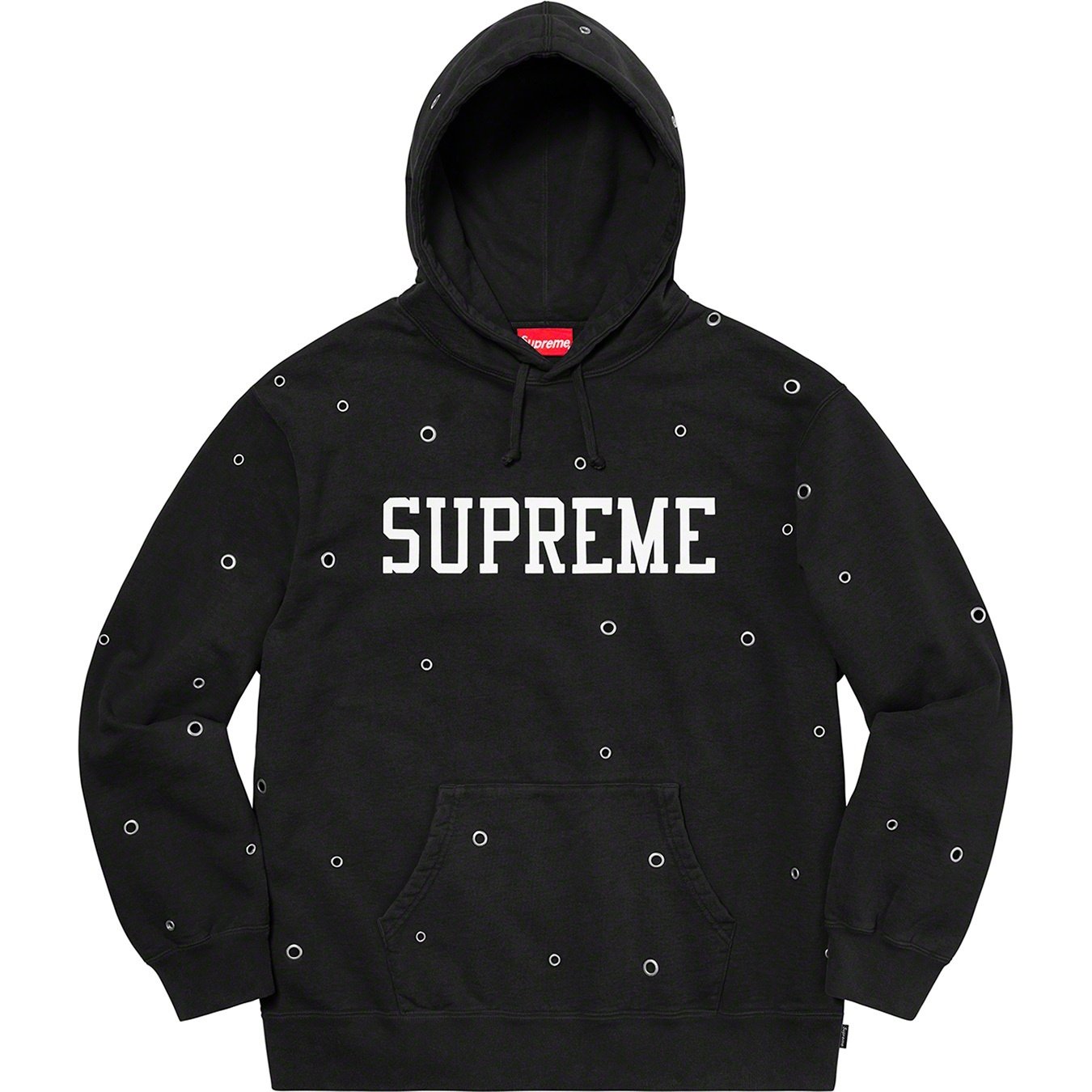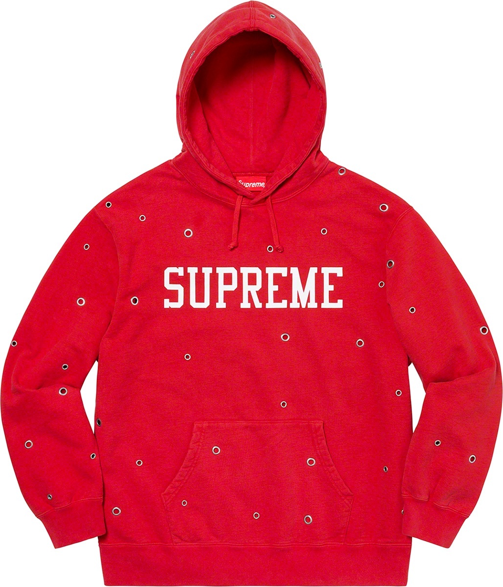 Cotton fleece with grommet pattern, pouch pocket and printed logo on chest.
