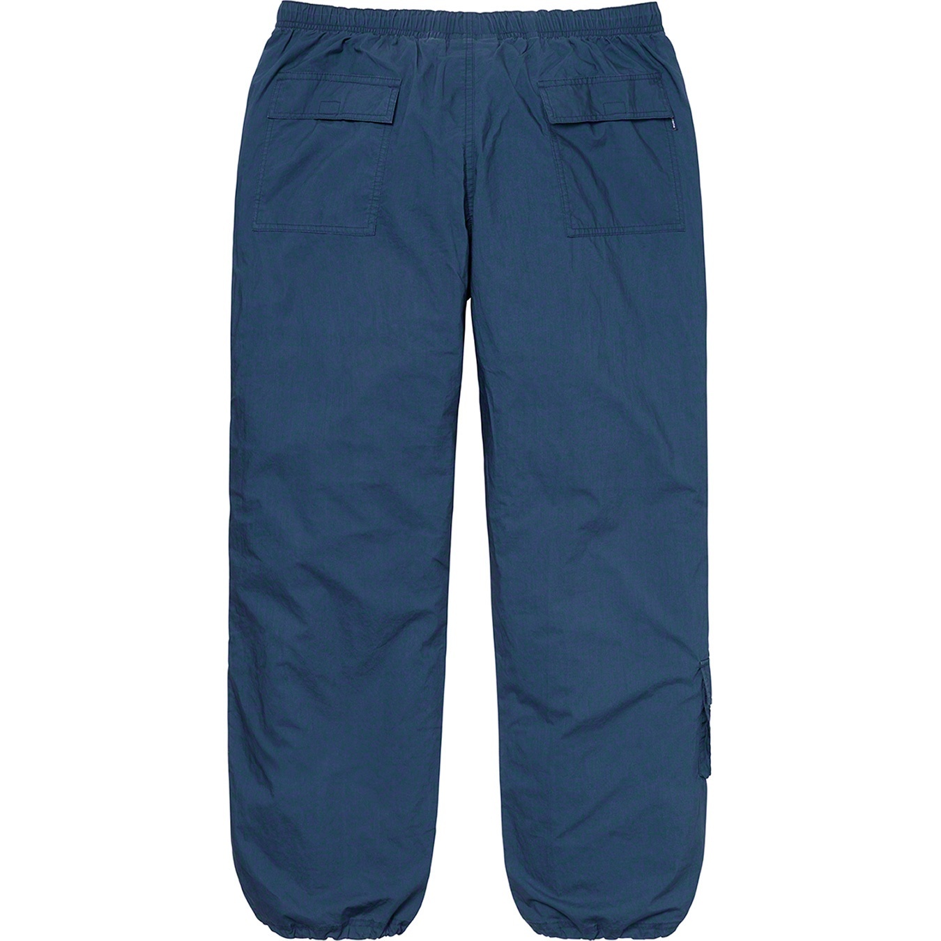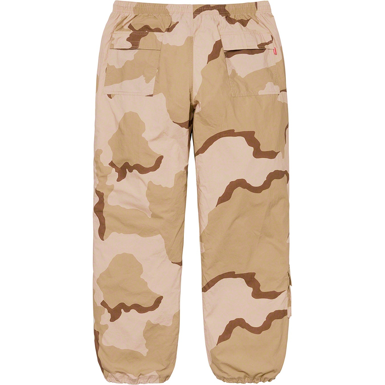 All cotton with slanted front pockets. Velcro flap patch pockets at seat and lower leg with utility pocket at thigh. Elastic waistband and cuffs with interior elastic shockcords. Embroidered logo on pocket flap.