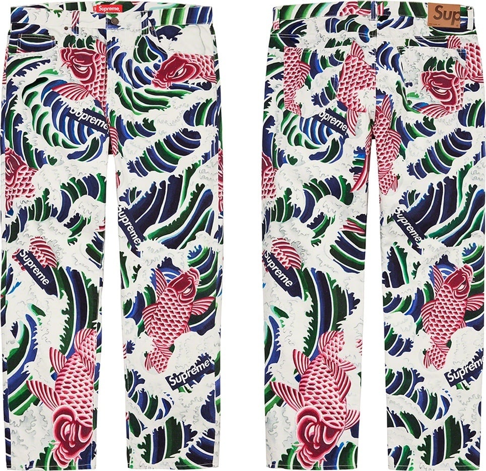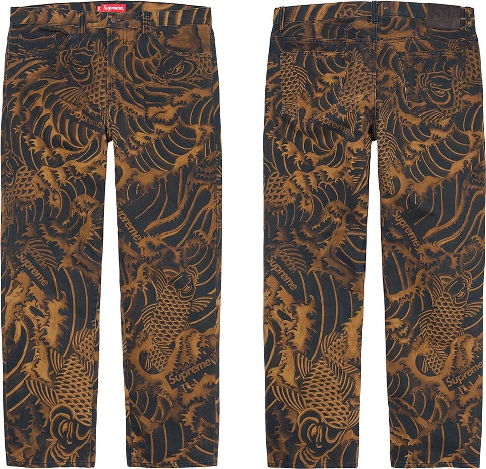 All cotton 13 oz. denim with printed pattern and enzyme wash. Classic 5-pocket style with button fly, single coin pocket, copper oxide rivets and leather logo patch on back.