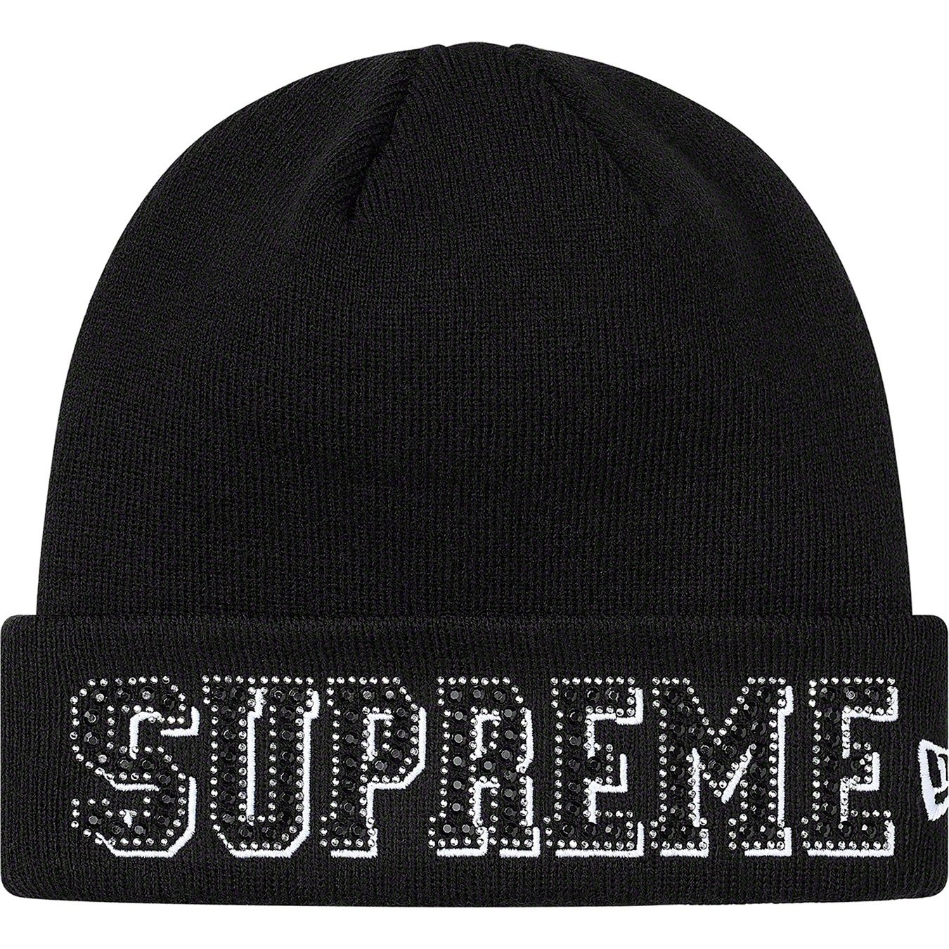 Acrylic cuffed beanie with gem appliqué and embroidered logos on cuff.