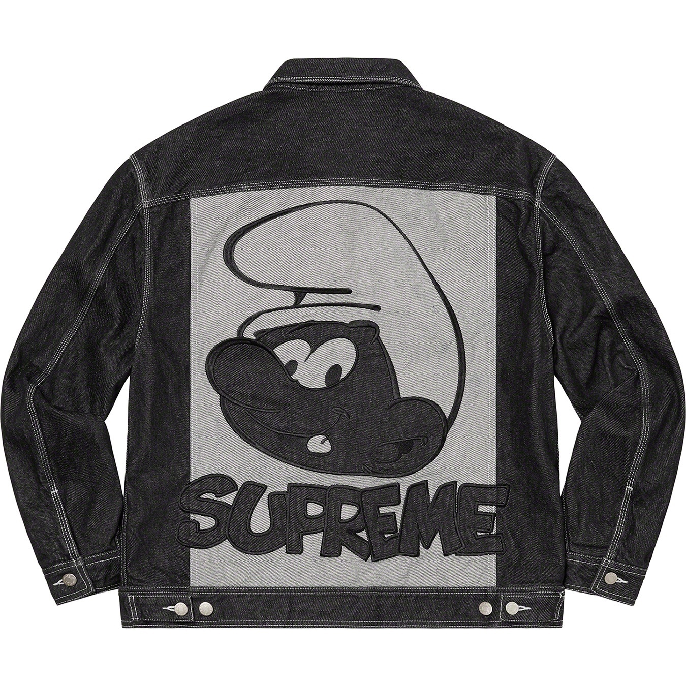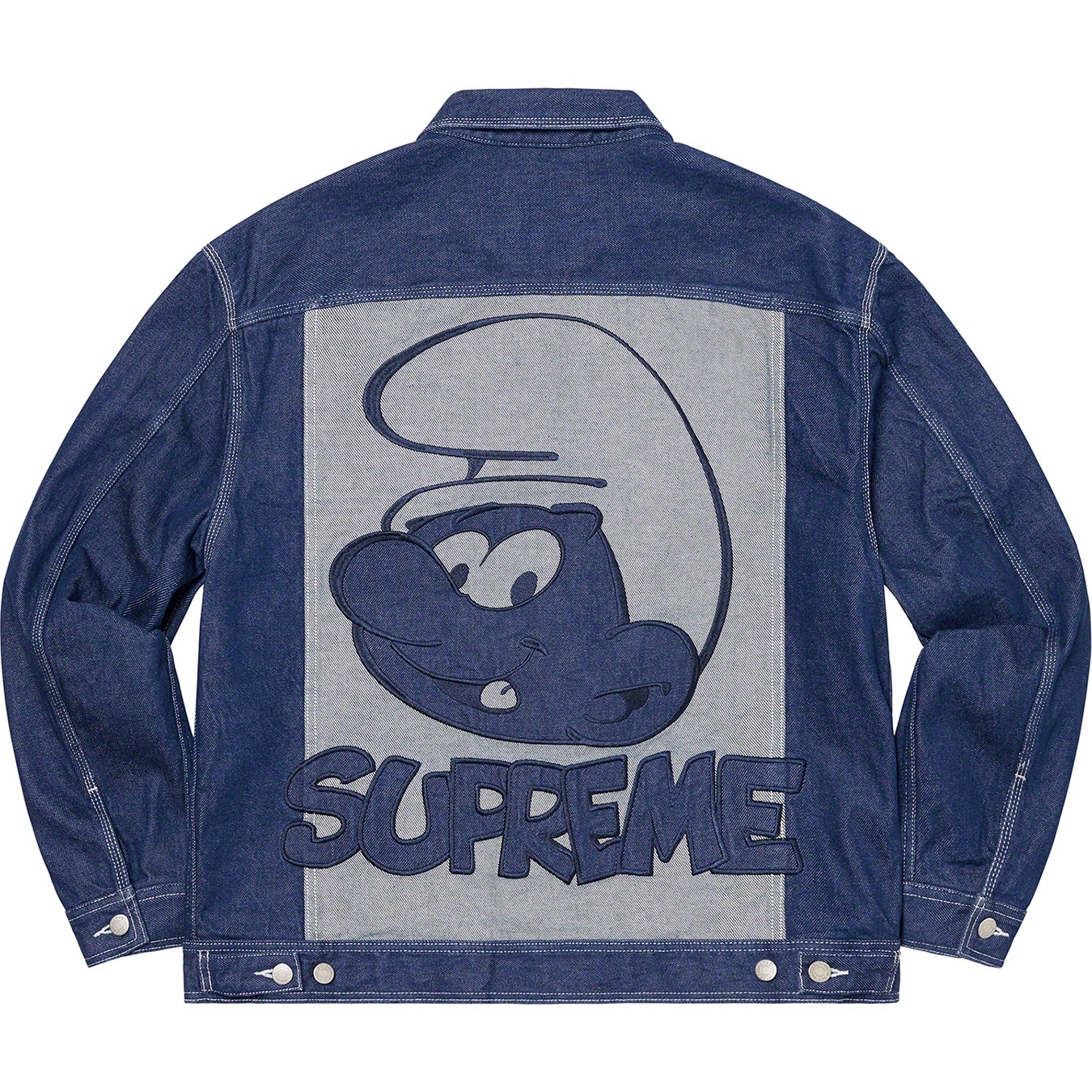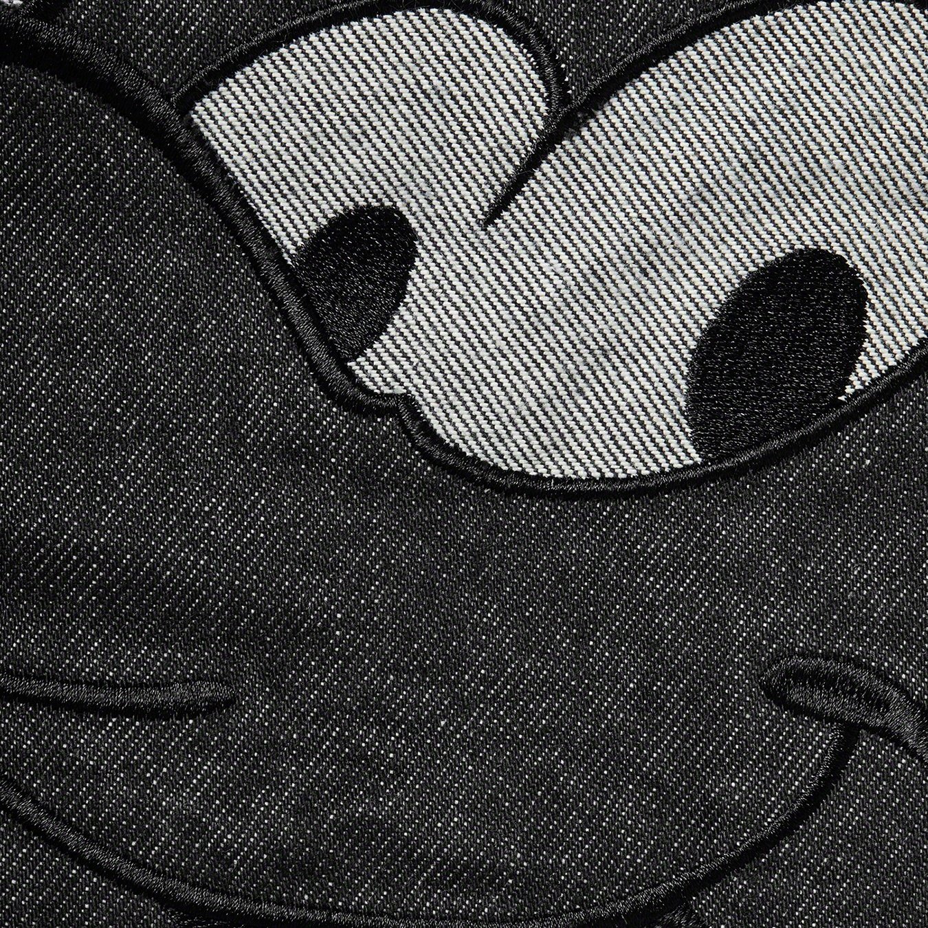 All cotton 15 oz. denim with button front closure. On seam hand pockets at lower front and chest pockets with button closures. Button tab adjusters at back hem. Appliqué logo at chest and appliqué graphic at back.