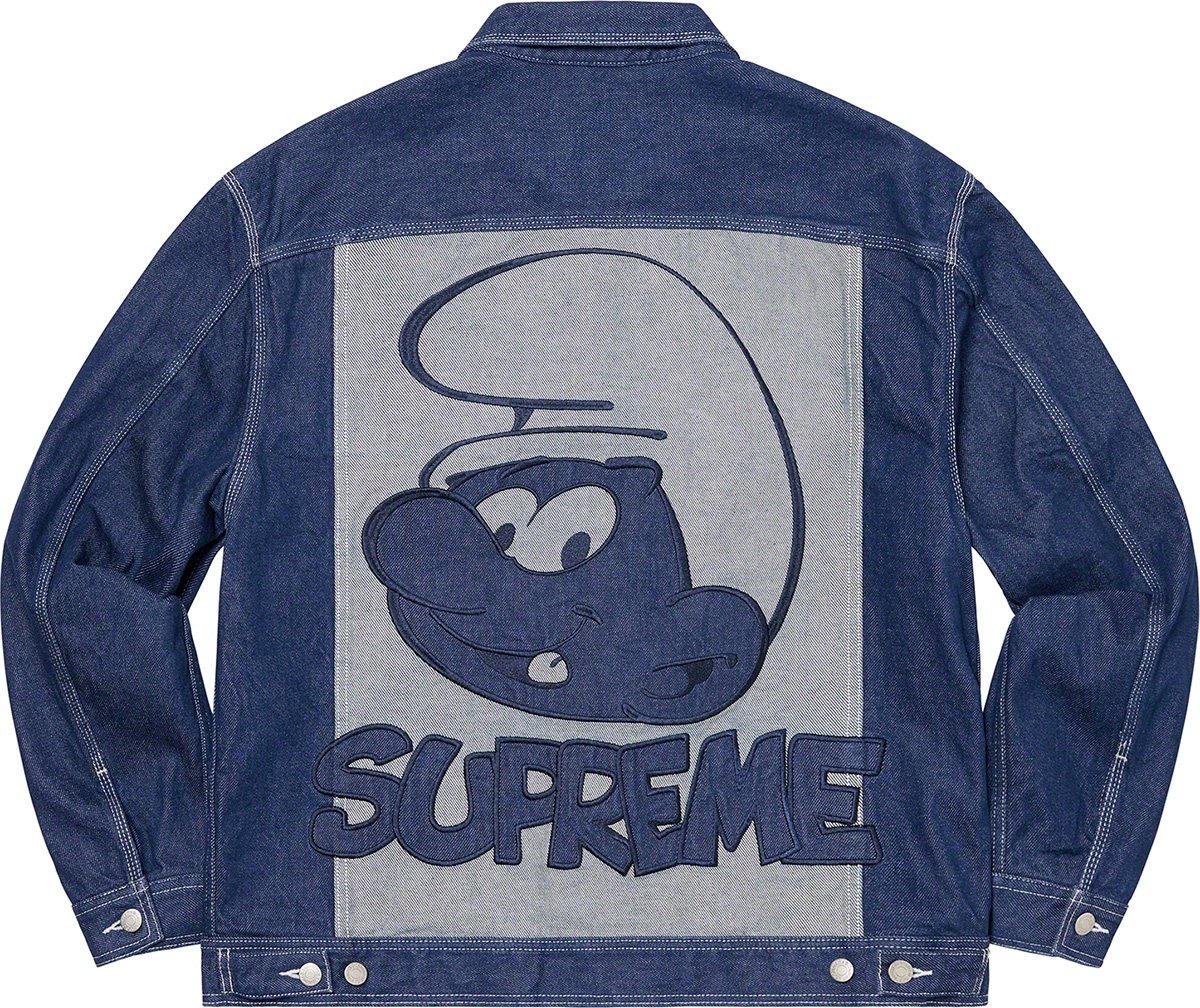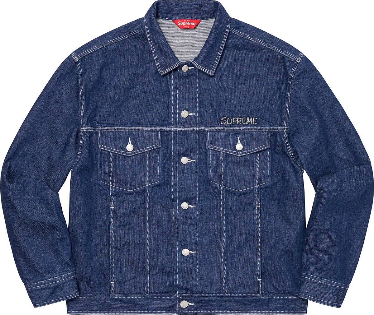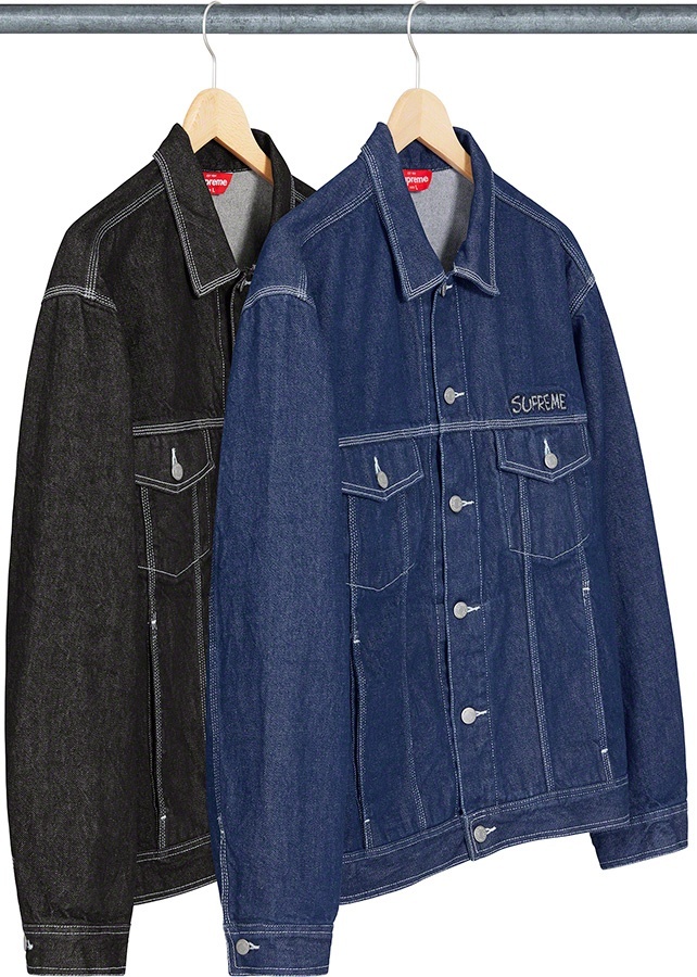 All cotton 15 oz. denim with button front closure. On seam hand pockets at lower front and chest pockets with button closures. Button tab adjusters at back hem. Appliqué logo at chest and appliqué graphic at back.
