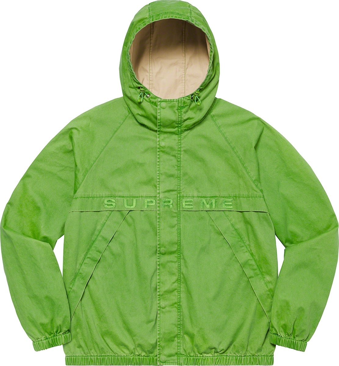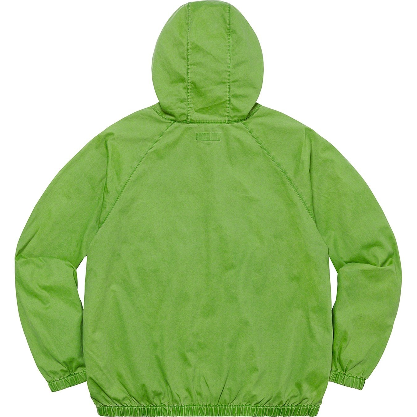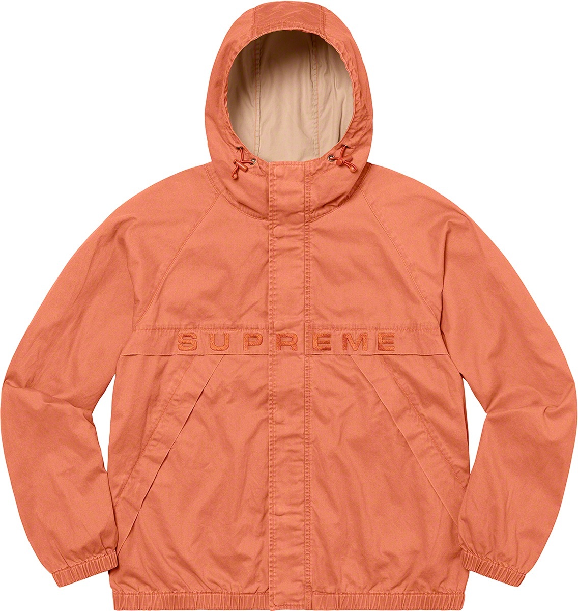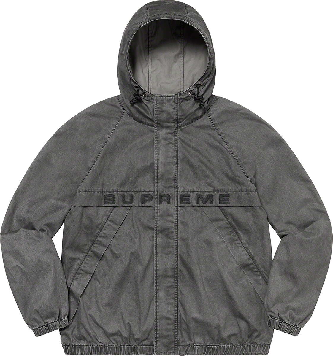 All cotton with full zip closure and hidden snap placket. Welt hand pockets at lower front. Interior elastic shockcord at hood with elastic cuffs and hem. Embroidered logo on chest.