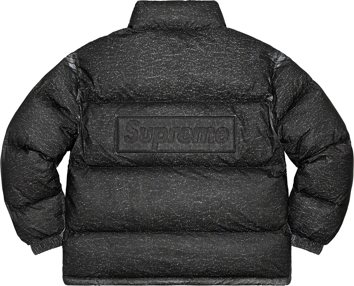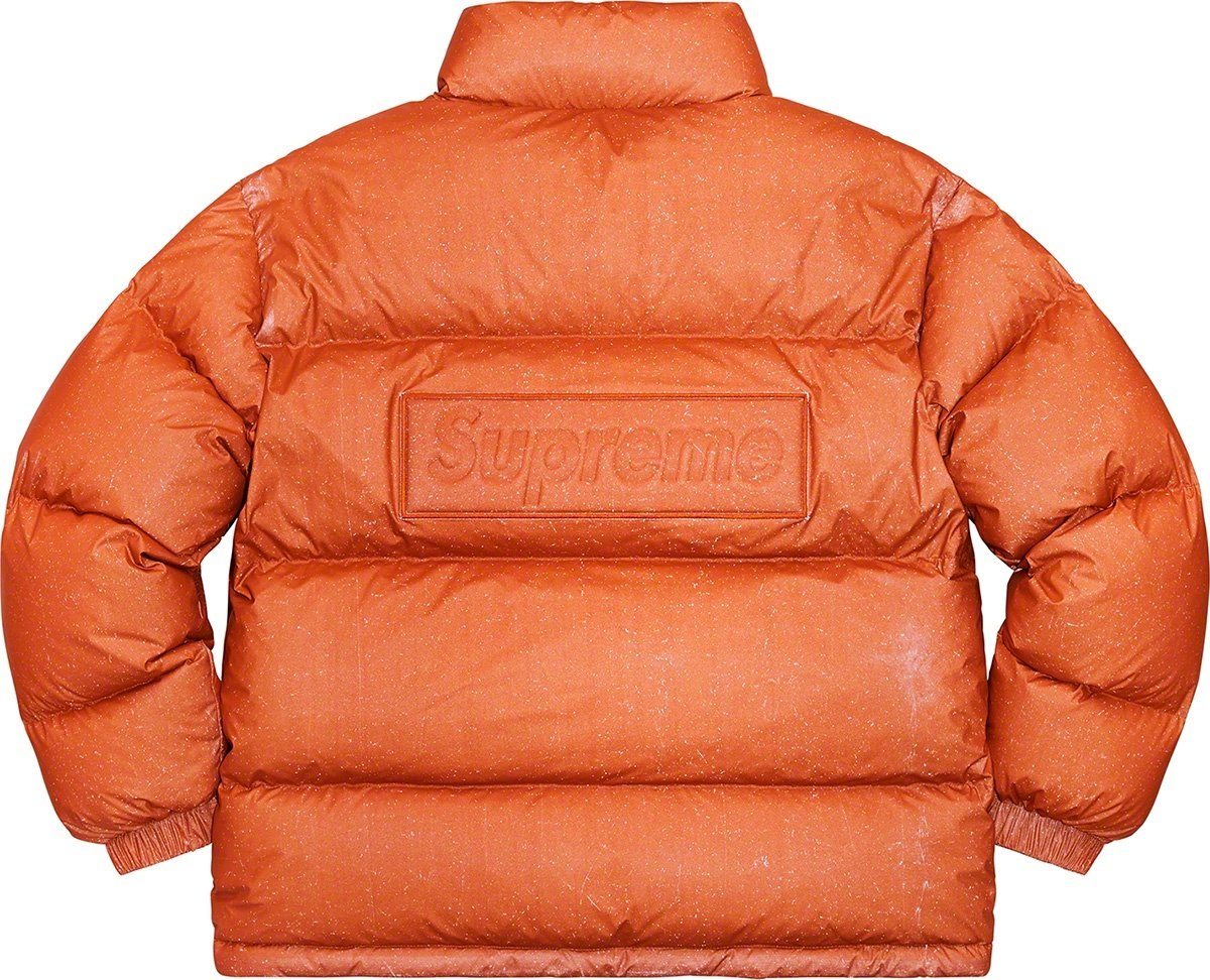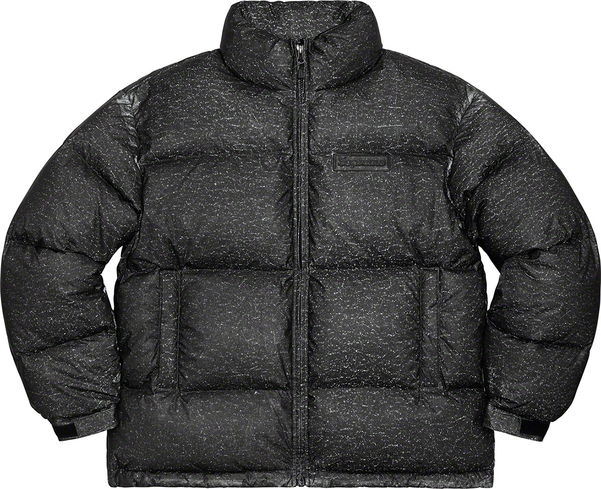 Water resistant reflective shell with distressed print. Down filled quilted baffles and taffeta lining. Full zip closure with zip hand pockets at lower front and interior zip pocket. Interior elastic shockcord at hem and elastic cuffs with velcro tab ...