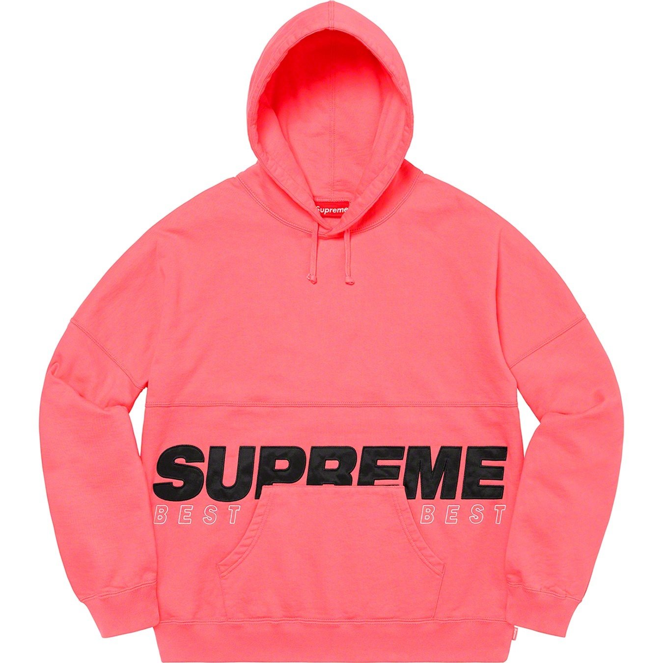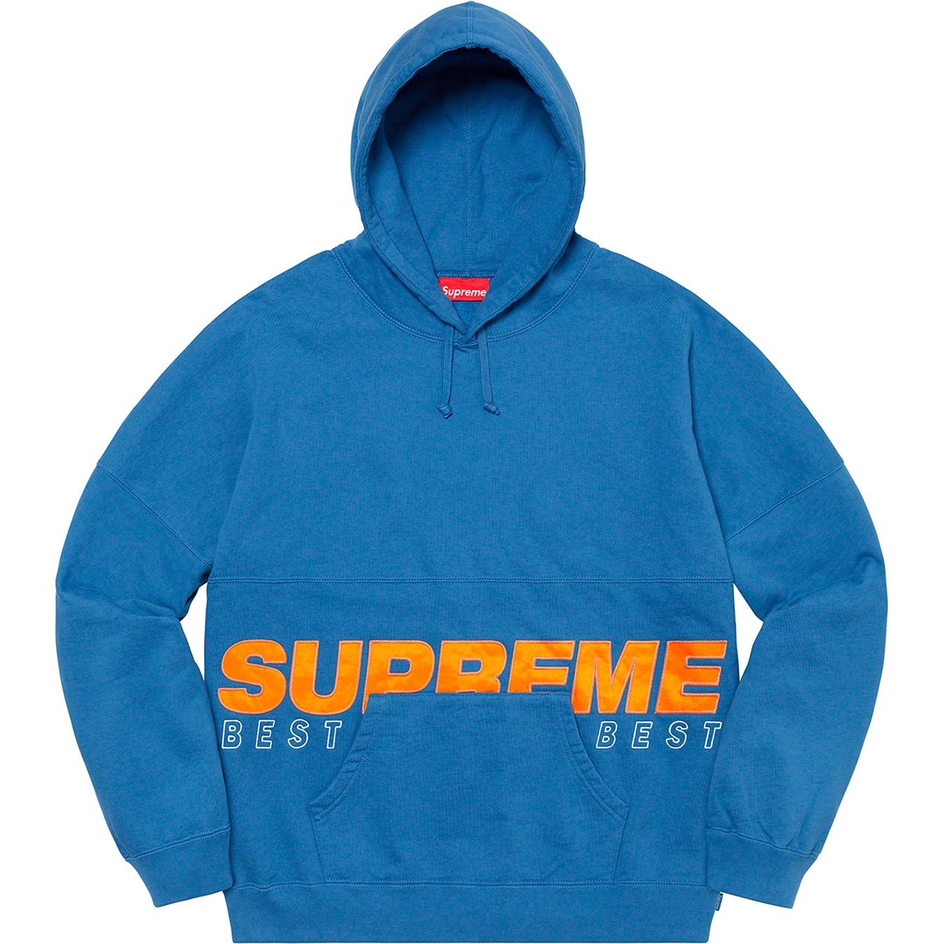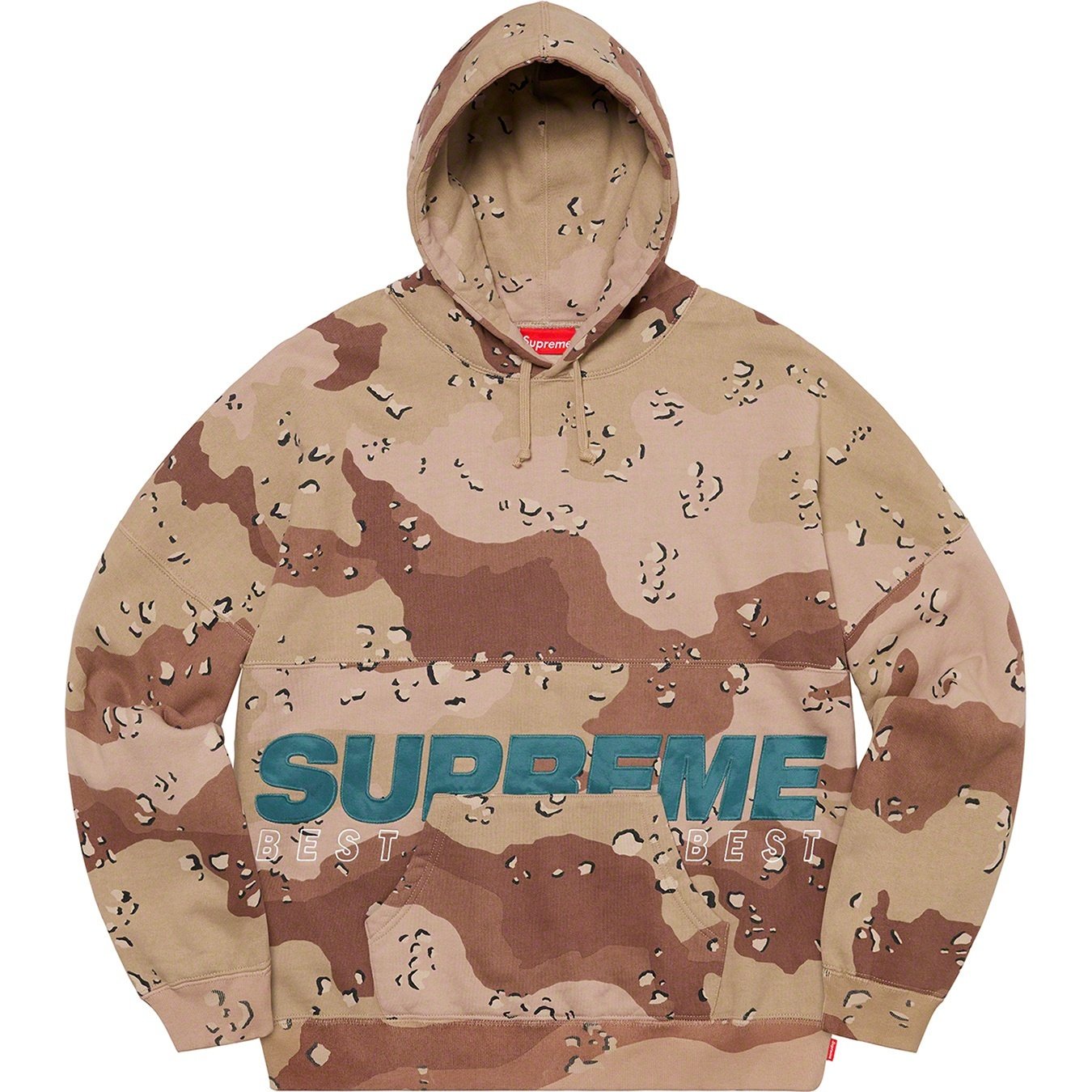 Cotton fleece with pouch pocket. Tackle twill appliqué logo and embroidered graphic at front.