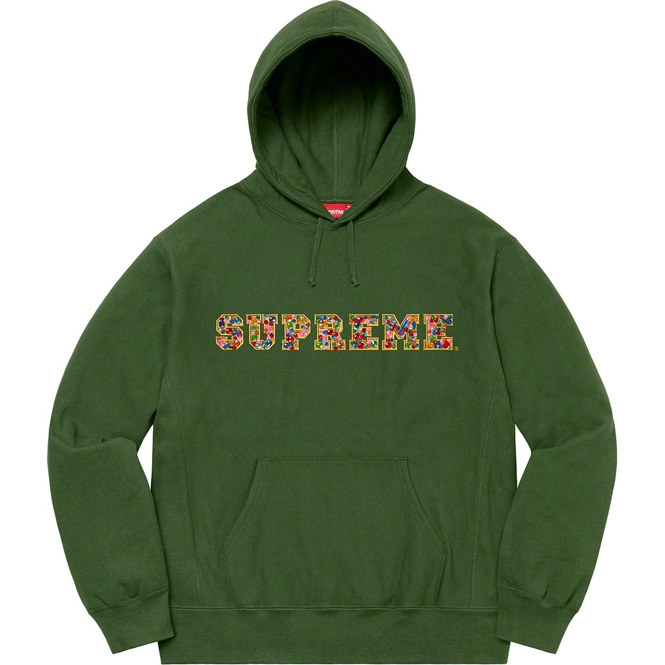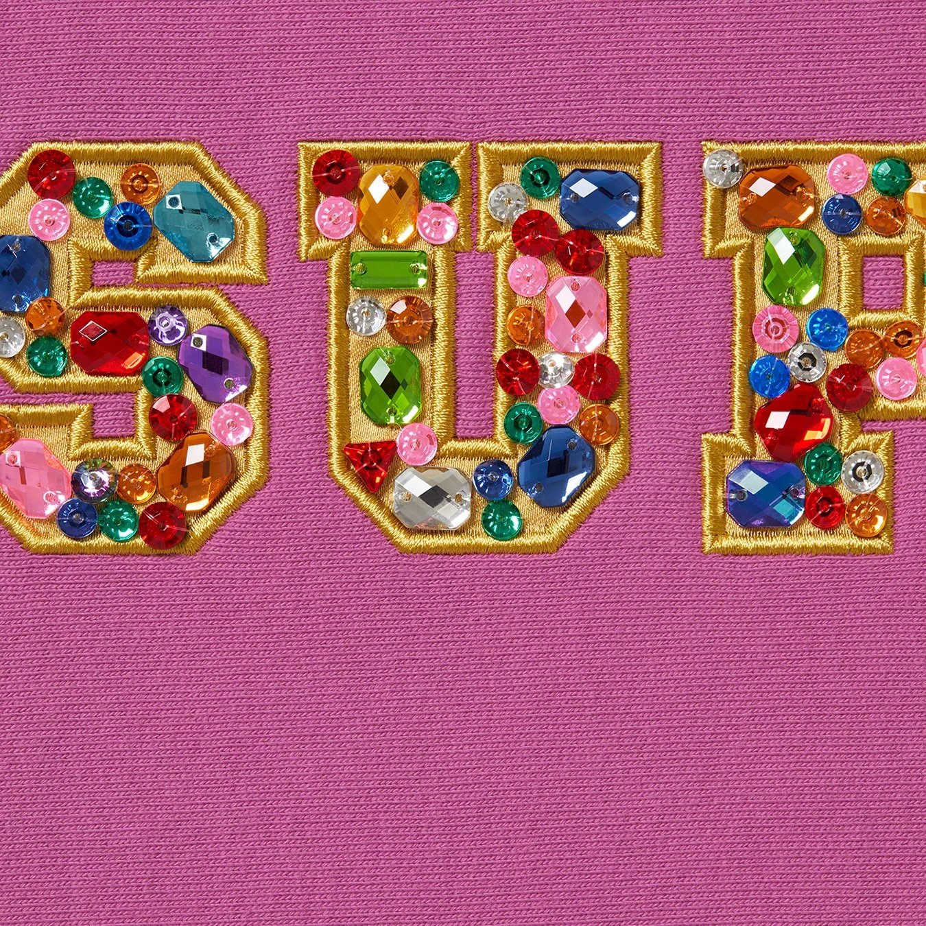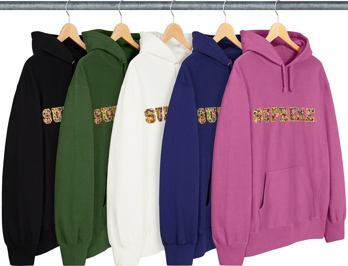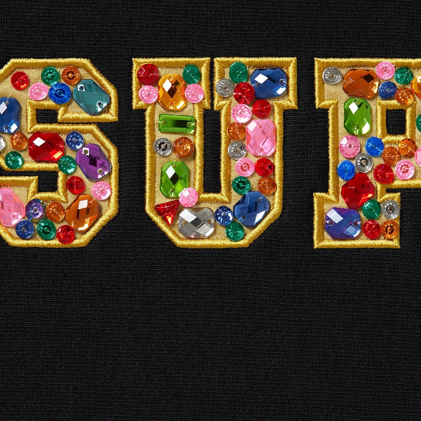 Cotton fleece with rib gussets and pouch pocket. Satin and jewel appliqué logo on chest.
