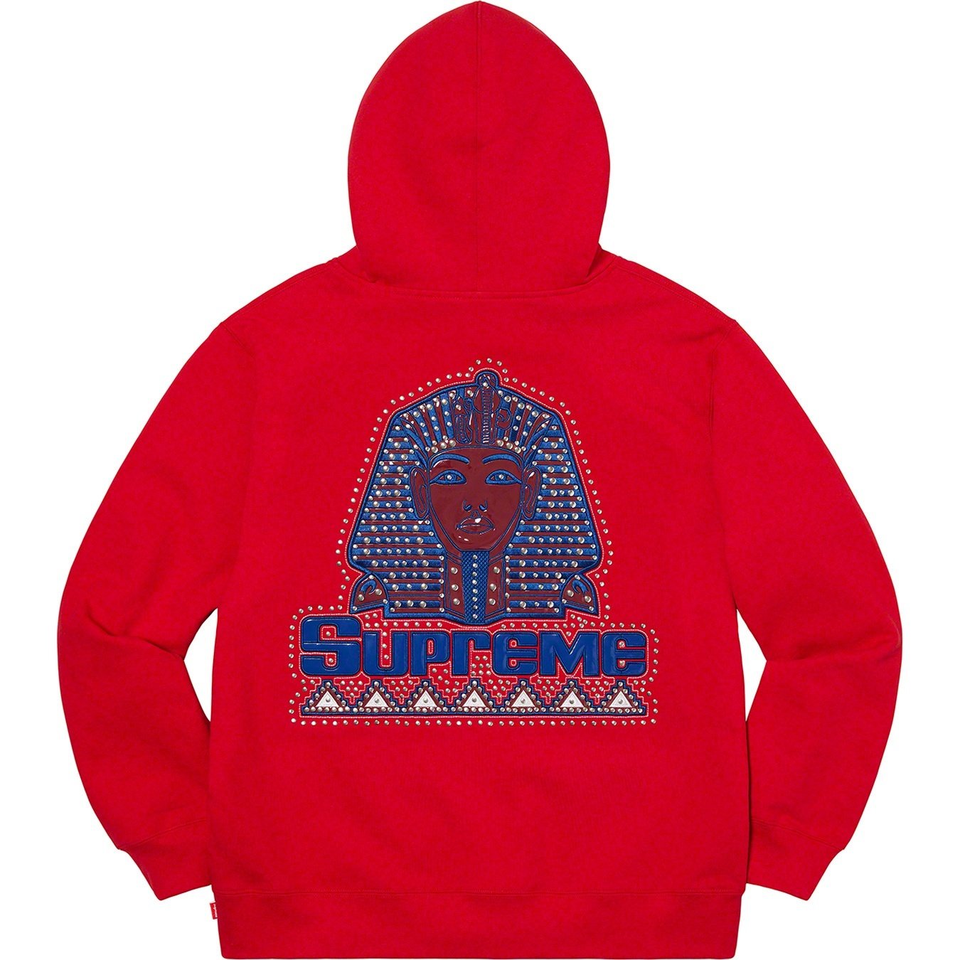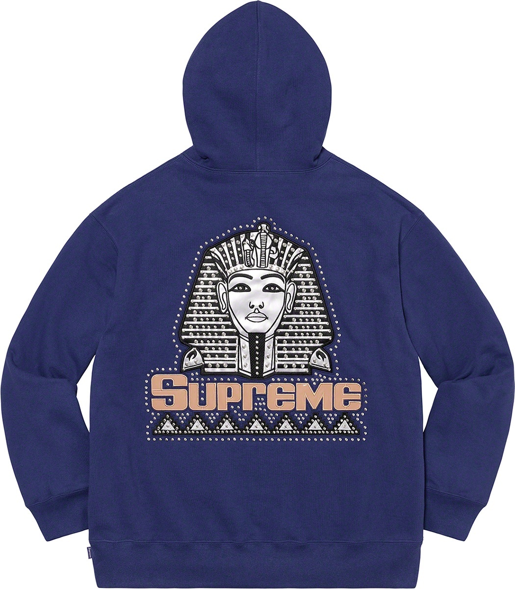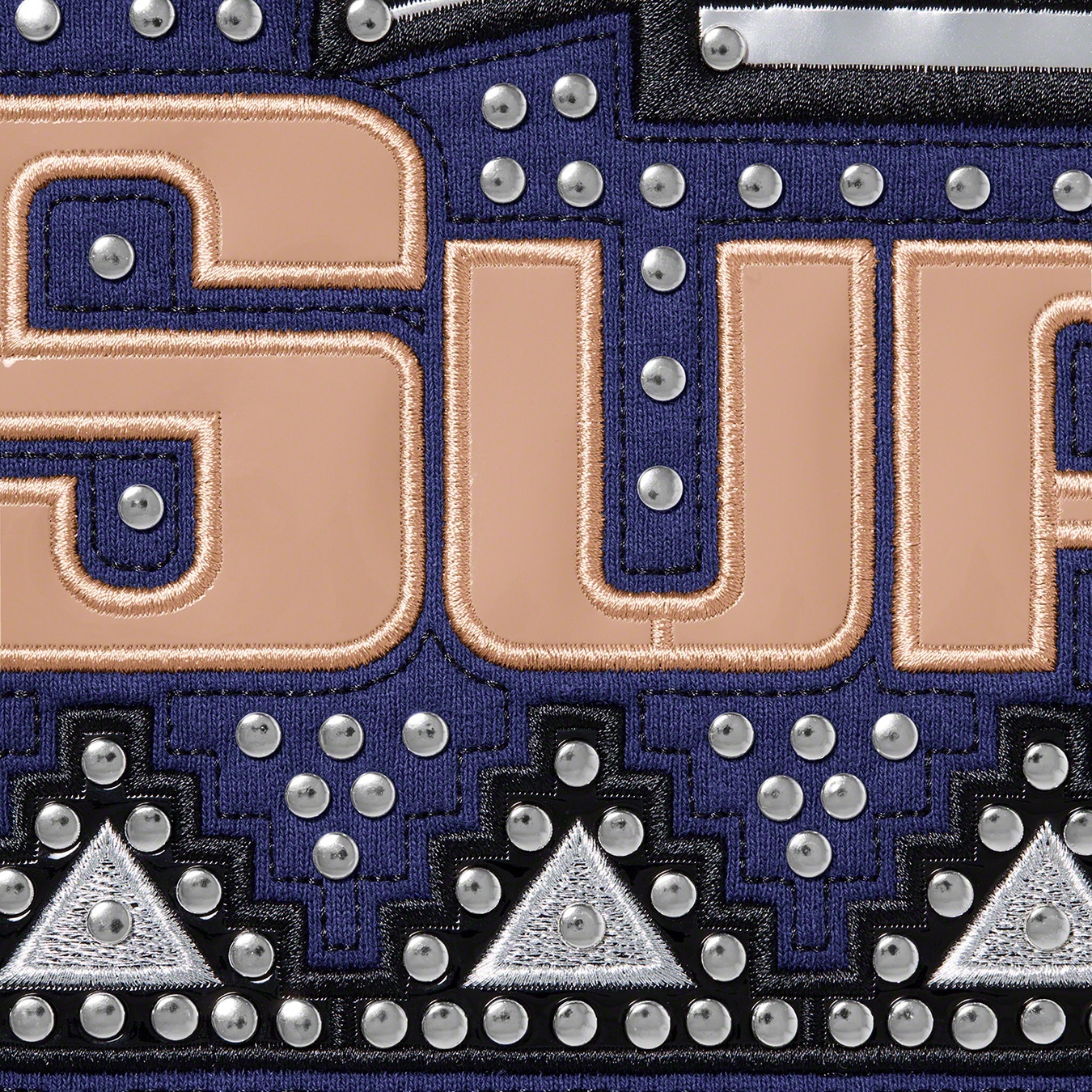 Heavyweight cotton crossgrain fleece with pouch pocket. Vinyl appliqué logo at chest. Vinyl appliqué graphics with studs at hood at back.
