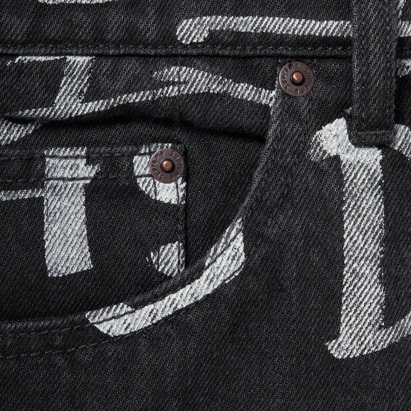 All cotton 14 oz. denim with printed graphic. Classic 5-pocket style with button fly, single coin pocket, copper oxide rivets and leather logo patch on back. Original artwork by Lee Scratch Perry.