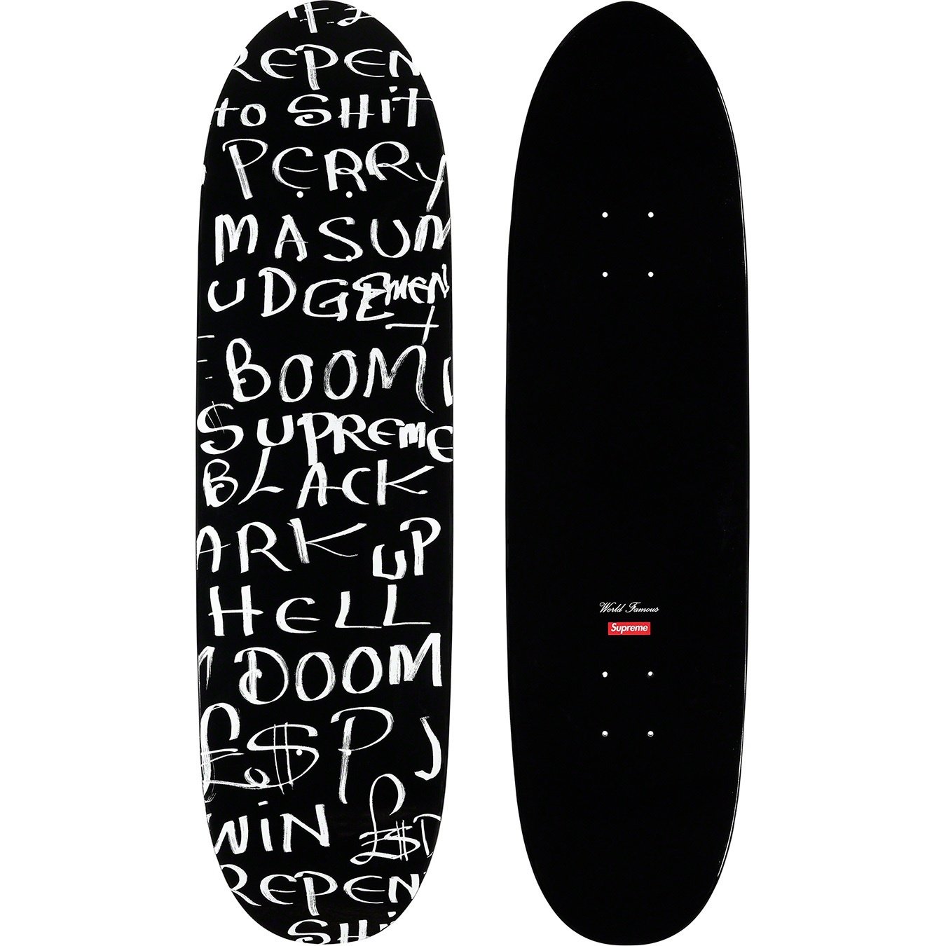 Full dipped Supreme shaped skate deck with printed graphic on bottom. Printed World Famous and box logo on top. Original artwork by Lee Scratch Perry.