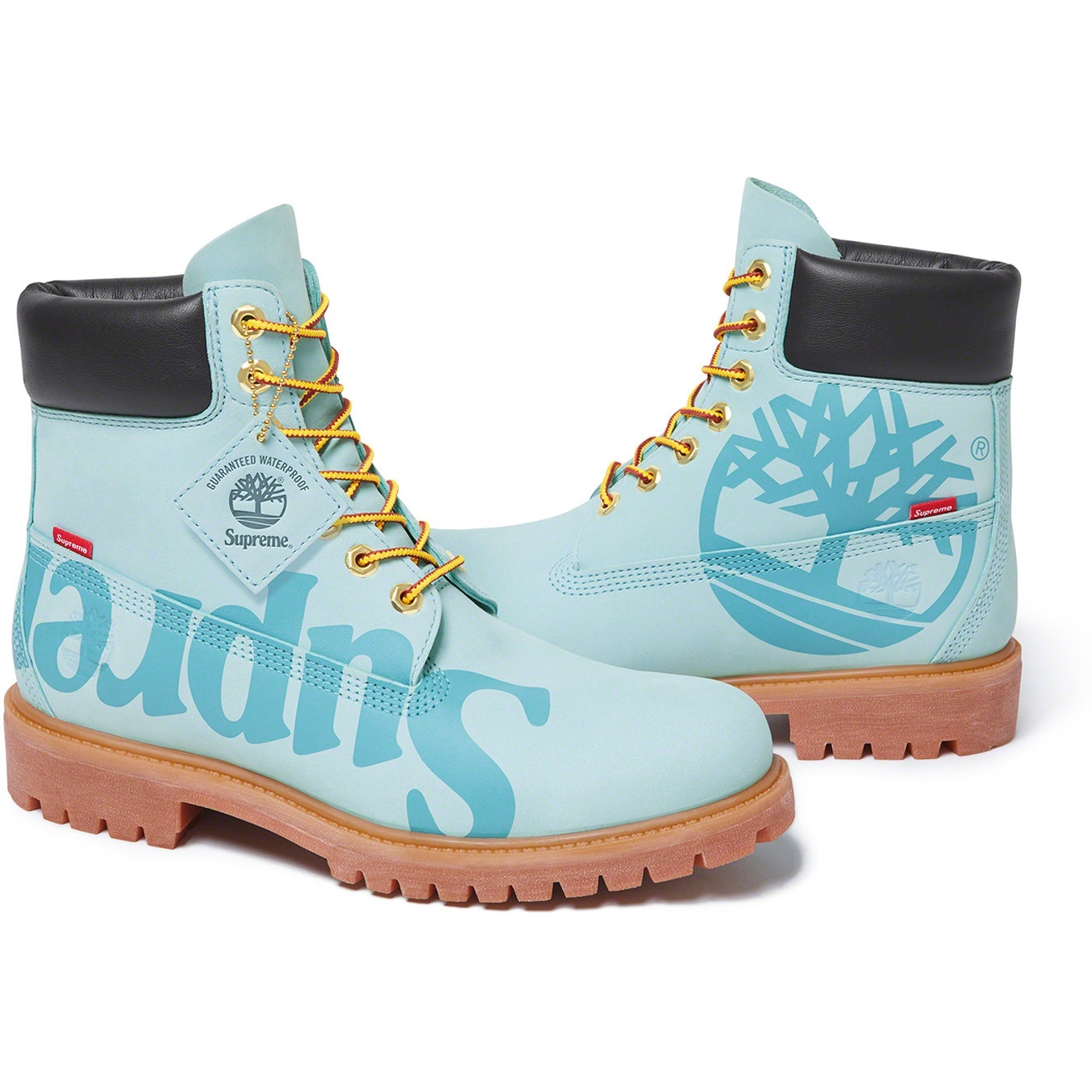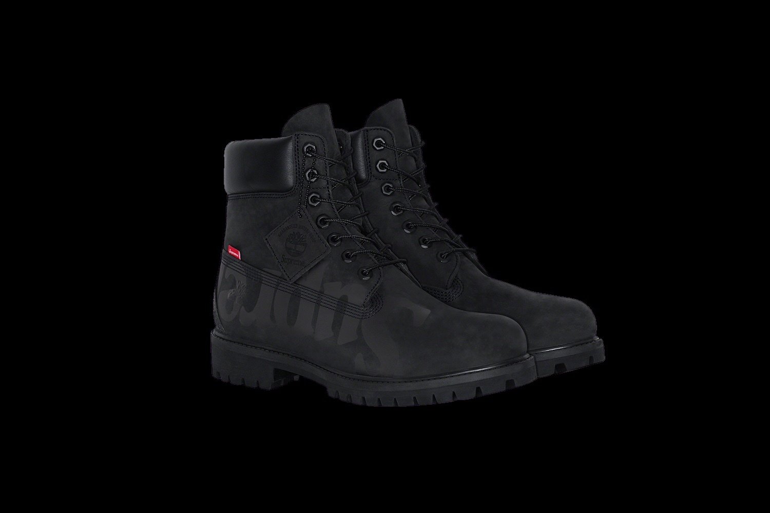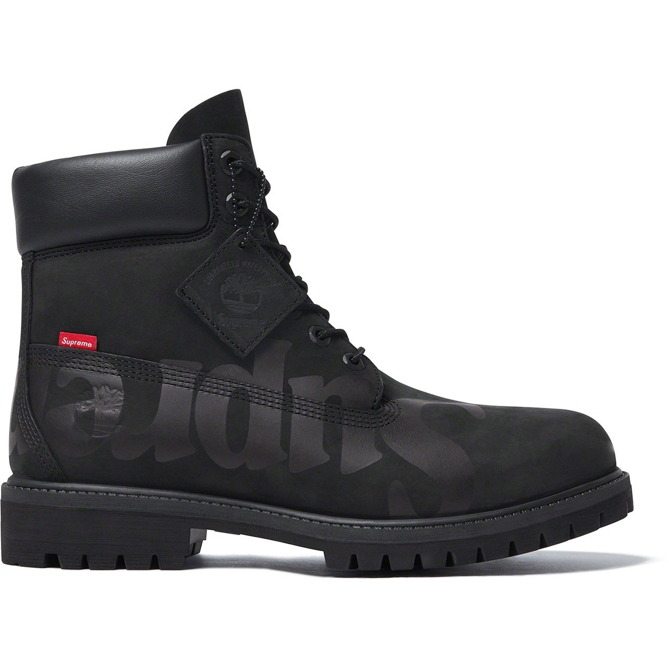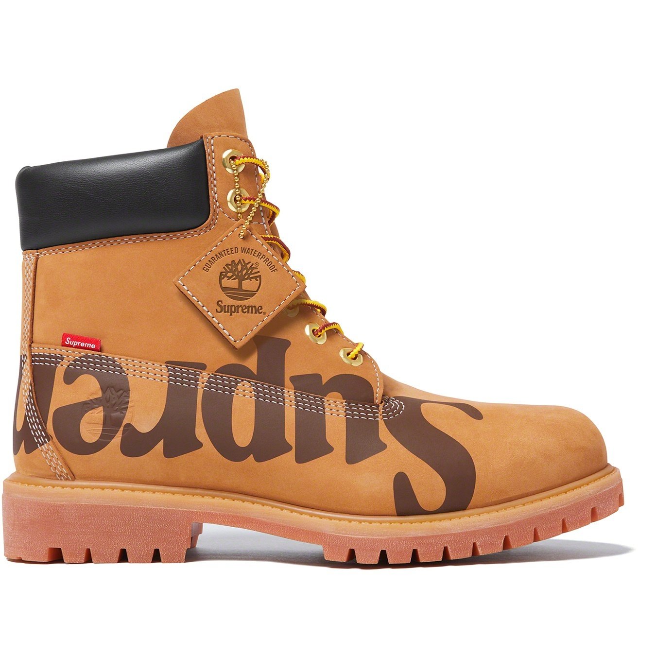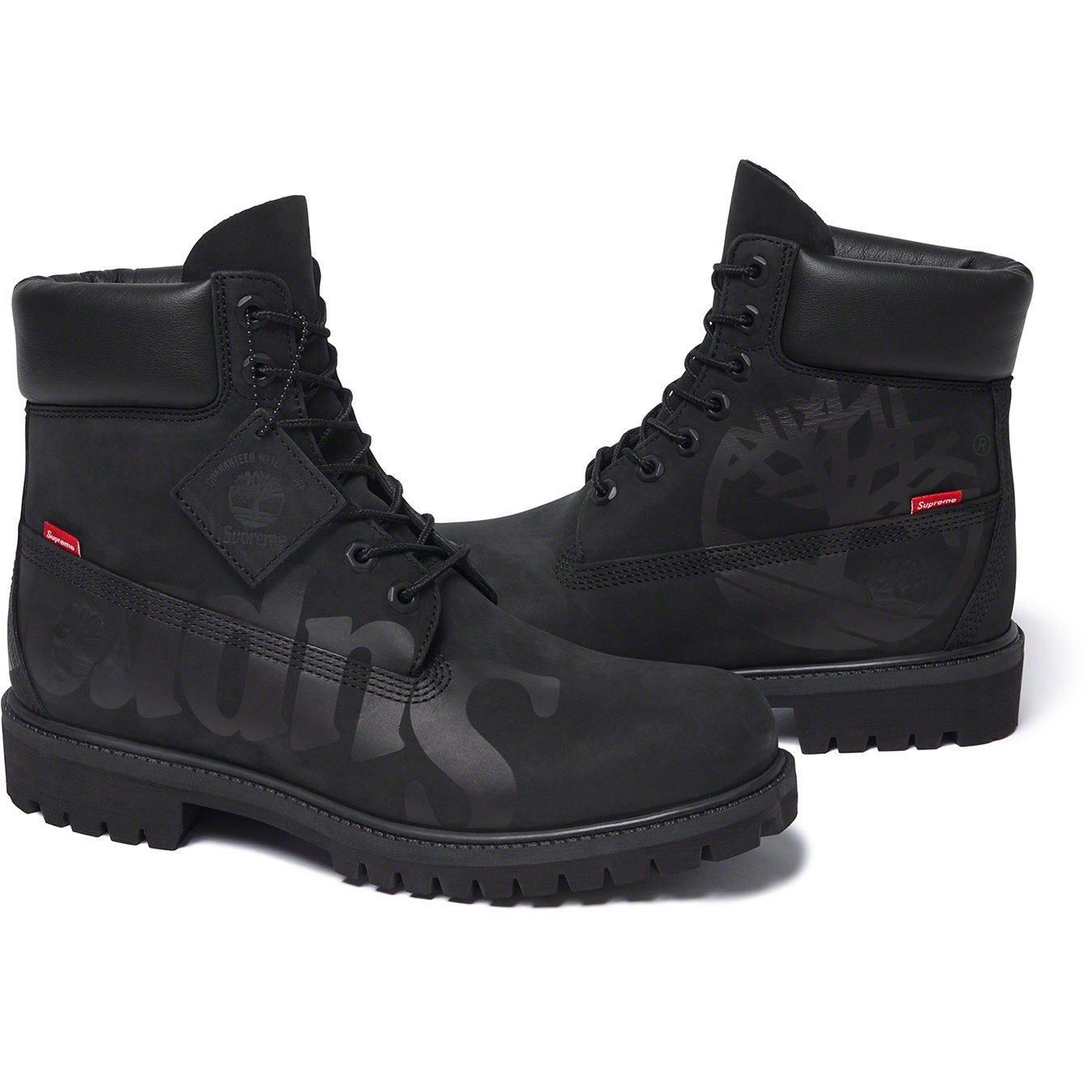 Waterproof premium nubuck with printed logos. Padded leather collar with rubber outsoles. Debossed Timberland® logo at heel with logo tab at side. Made exclusively for Supreme.