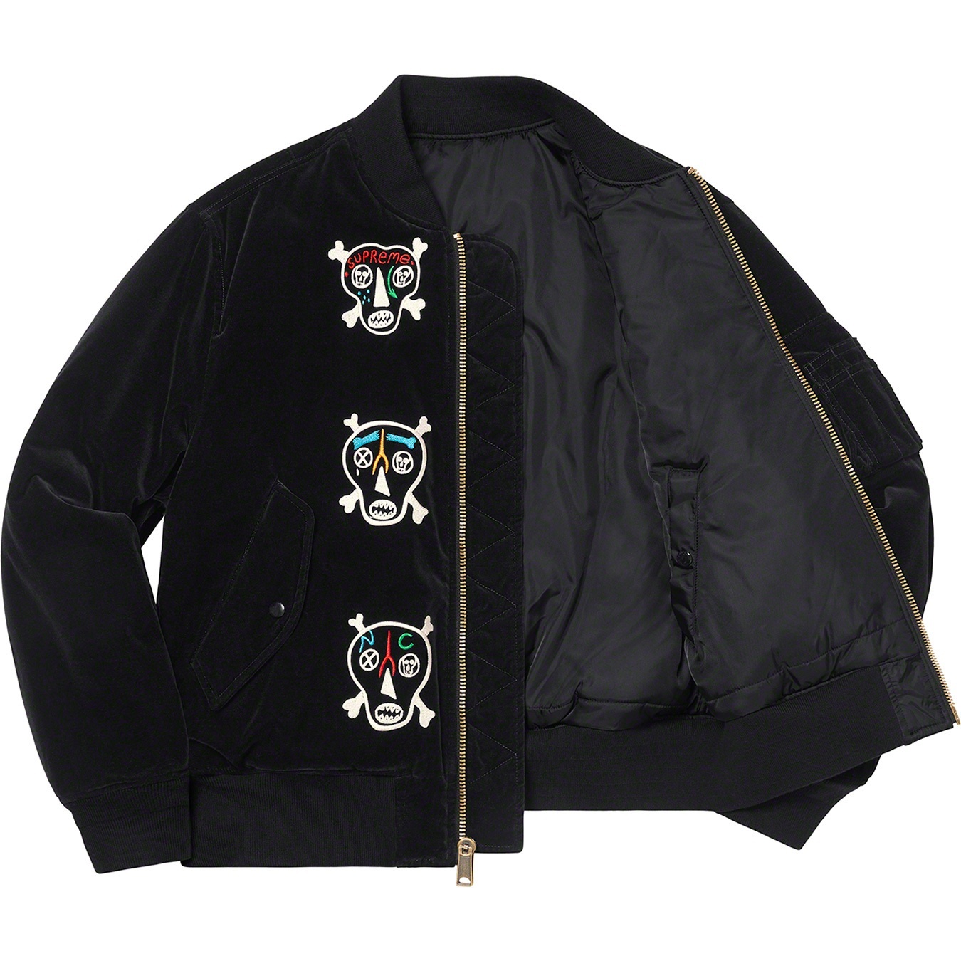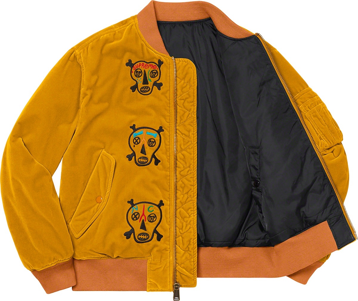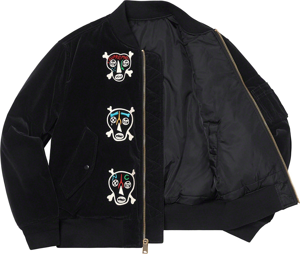 All cotton velvet with fill and full zip closure. Snap flap hand pockets at lower front with utility pocket at sleeve. Embroidered graphics at front and back. Flight satin twill reverse side with snap hand pockets. Knit rib collar, cuffs and hem. Orig...