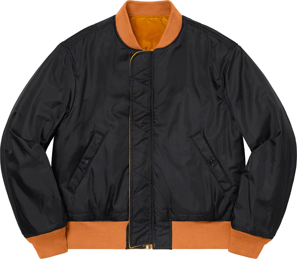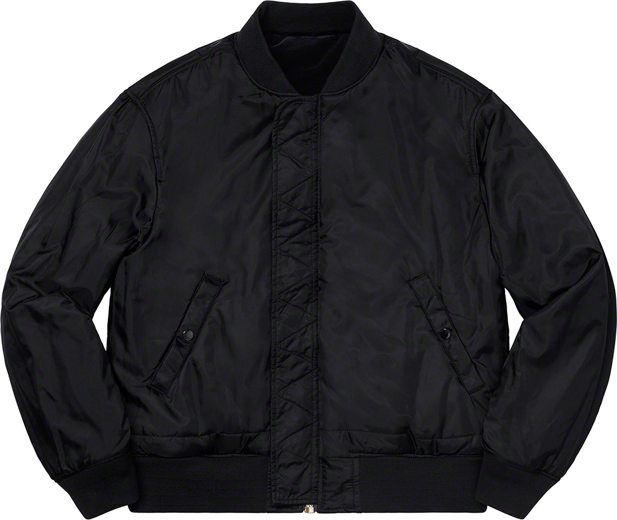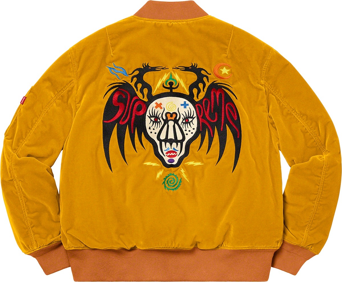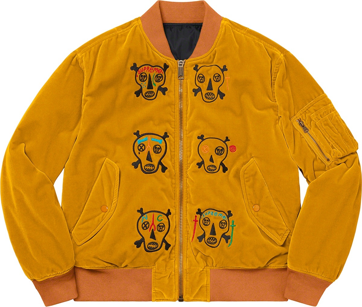 All cotton velvet with fill and full zip closure. Snap flap hand pockets at lower front with utility pocket at sleeve. Embroidered graphics at front and back. Flight satin twill reverse side with snap hand pockets. Knit rib collar, cuffs and hem. Orig...