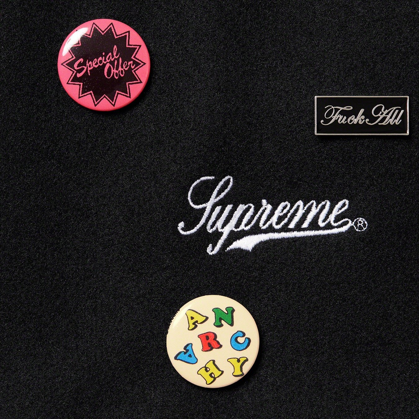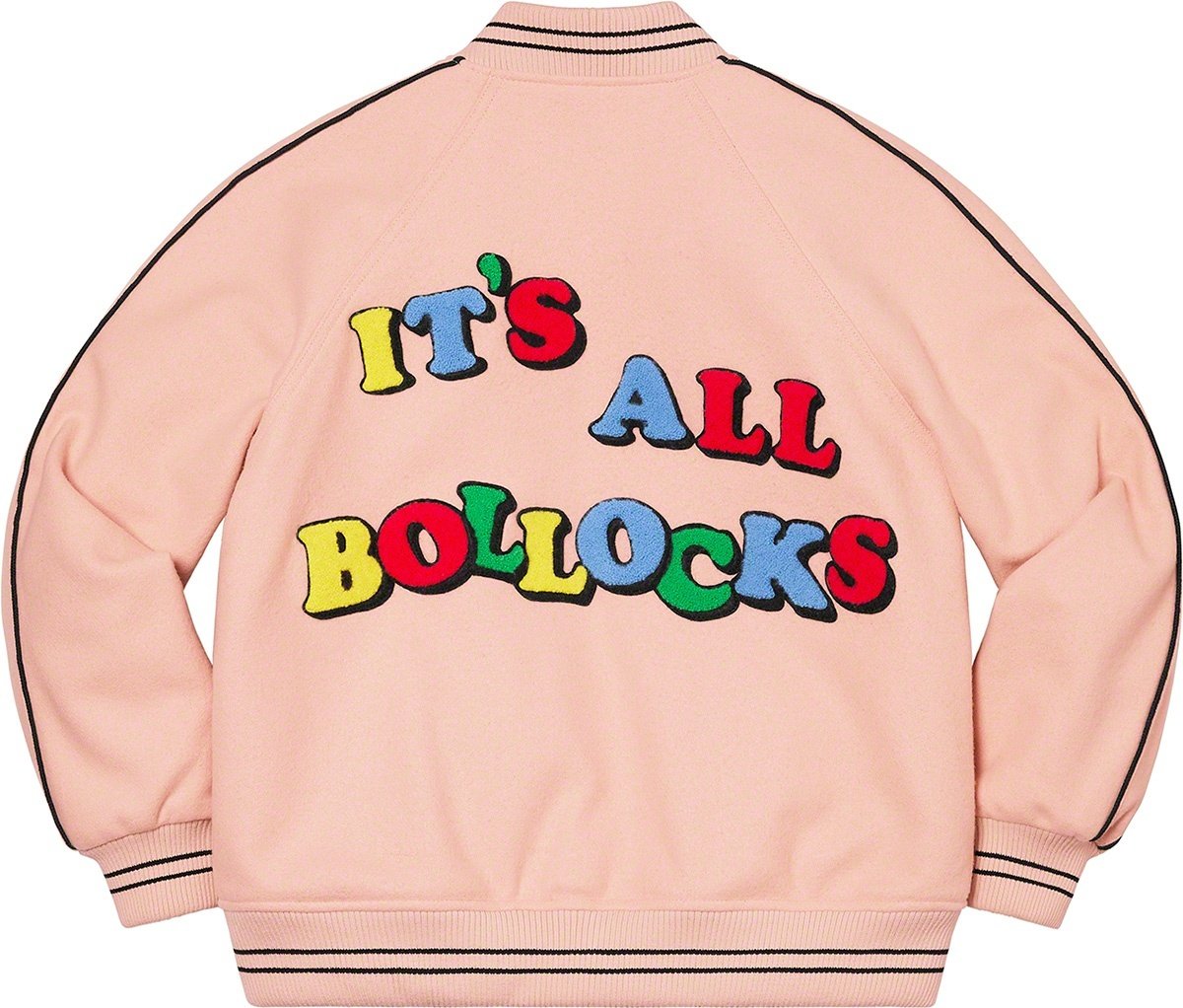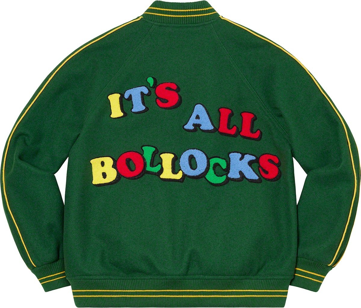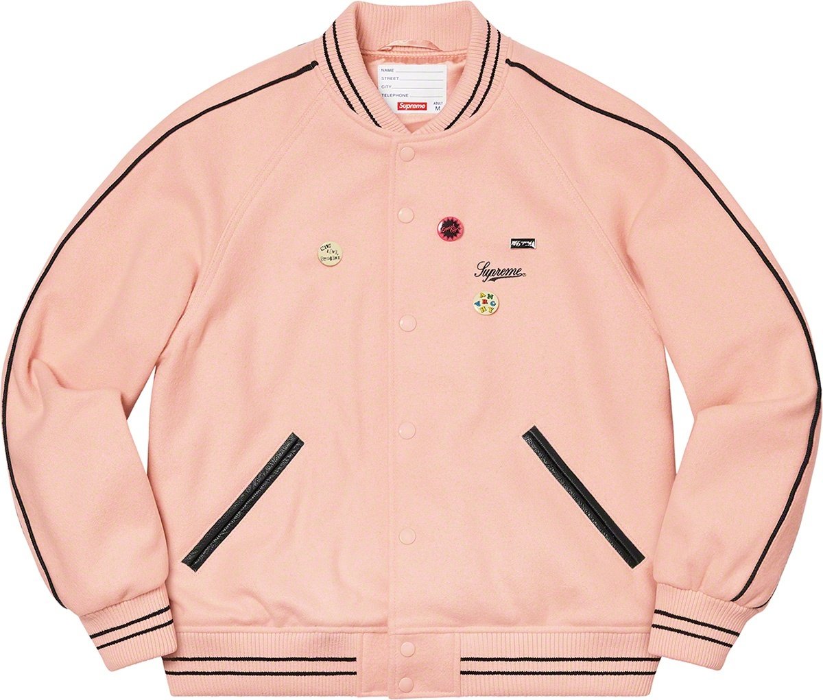 Wool with satin lining and snap front closure. Double welt leather hand pockets at lower front and interior chest pocket. Stripe rib collar, cuffs and hem with contrast piping at sleeves. Embroidered logo on chest with chenille graphic appliqué at bac...