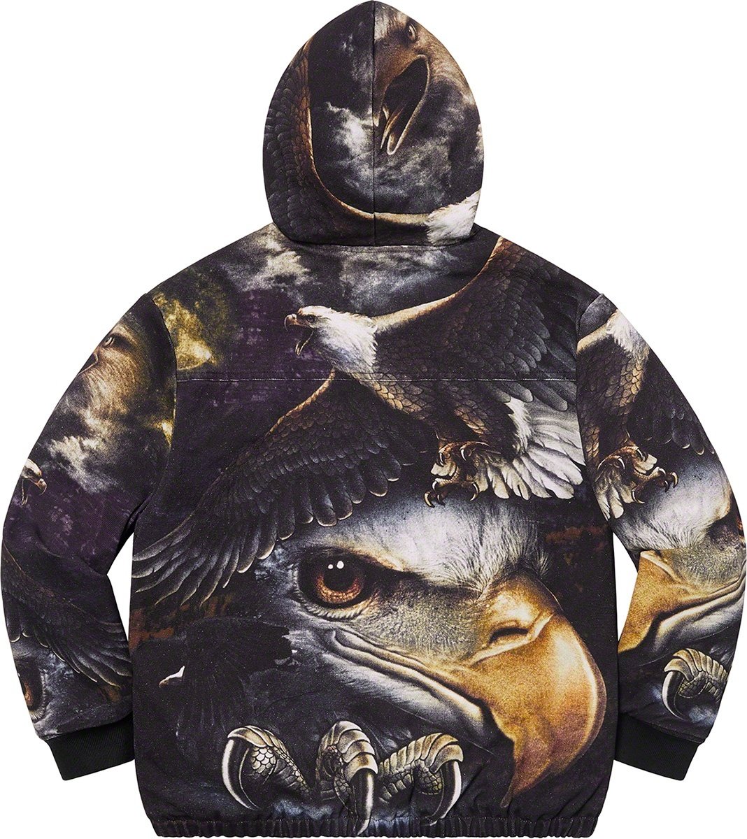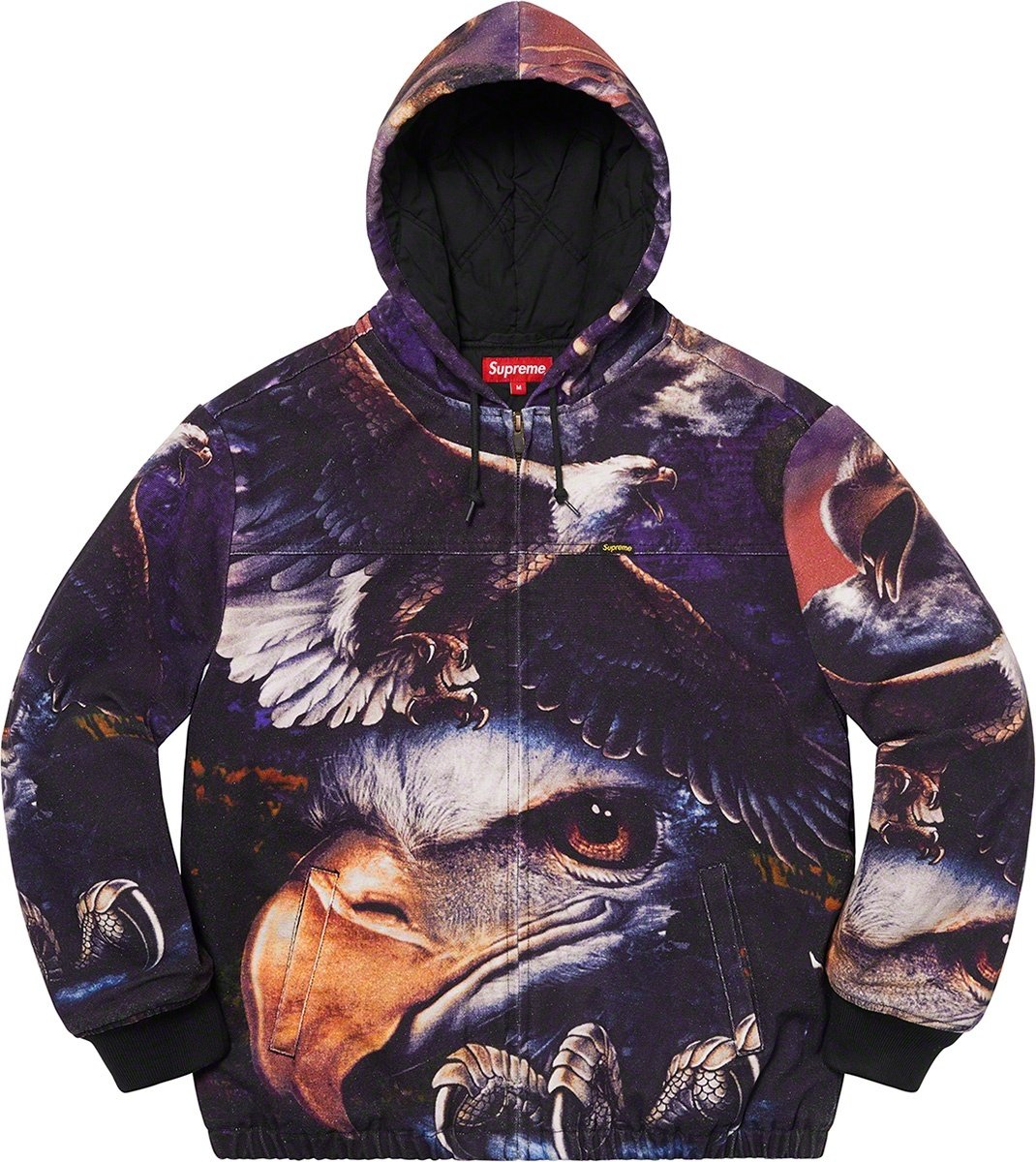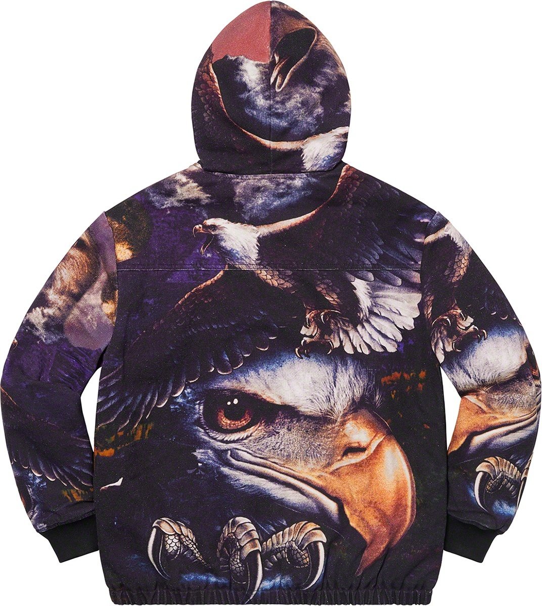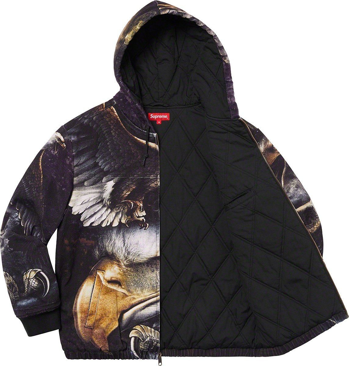 All cotton canvas with fill and quilted cotton poplin lining. Full zip closure with welt hand pockets at lower front and interior chest pocket. Interior drawcord at fixed hood with rib cuffs and elastic hem.