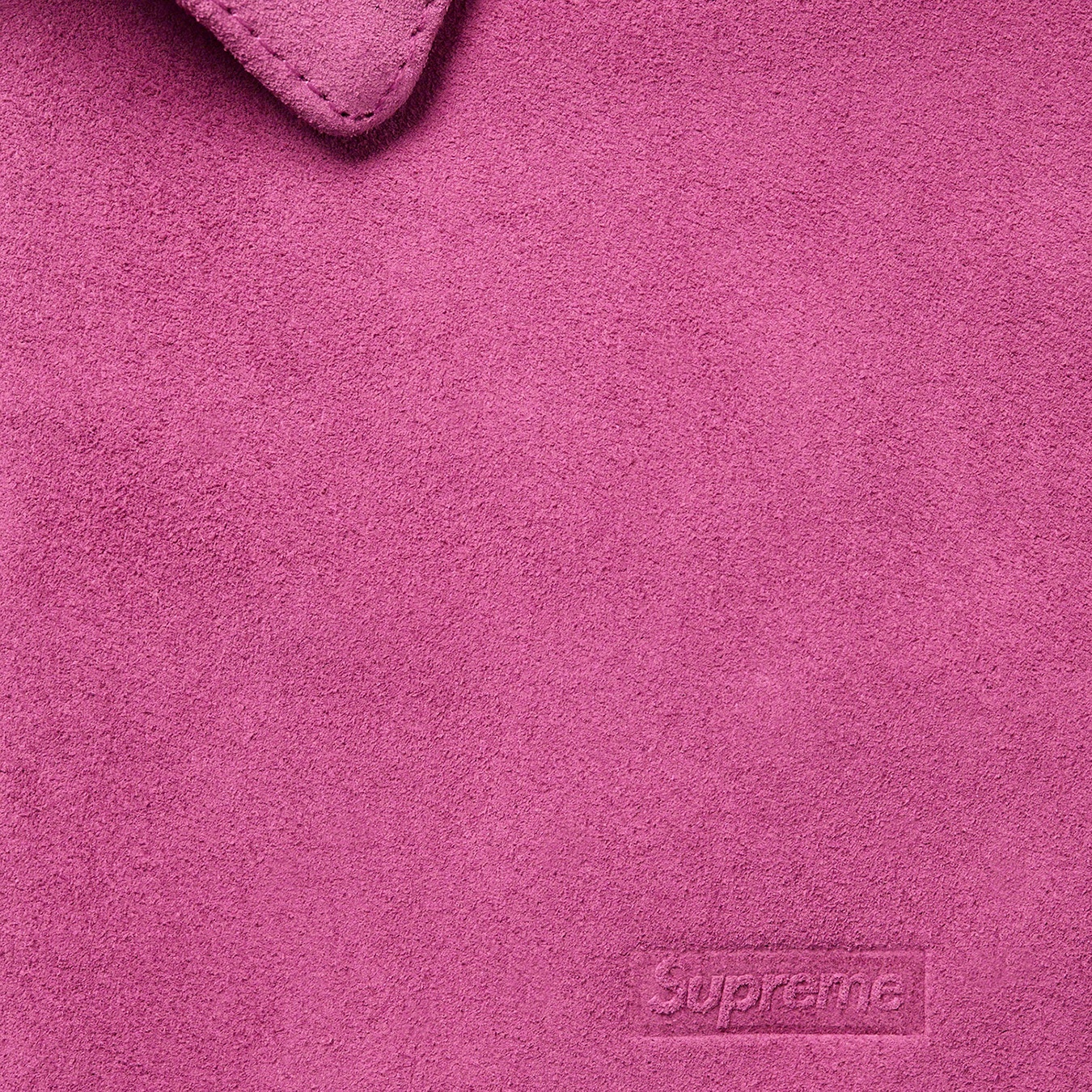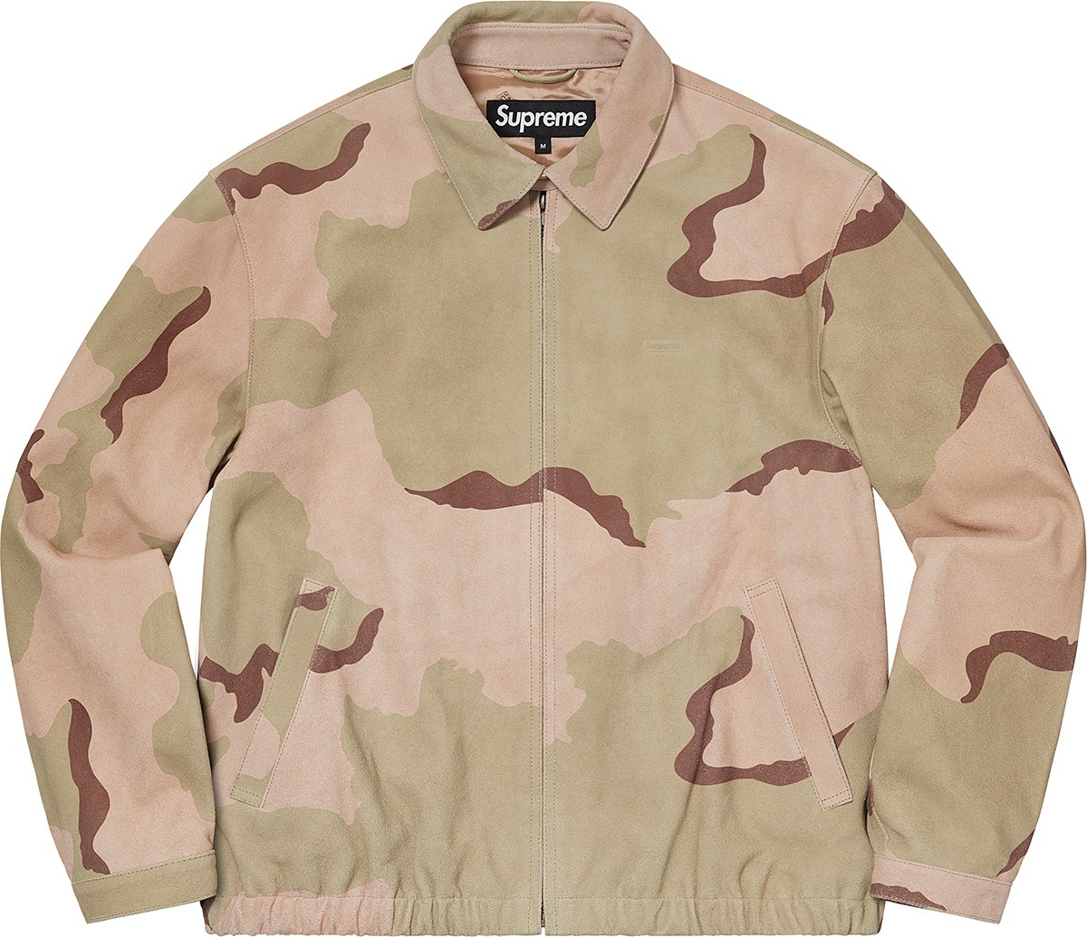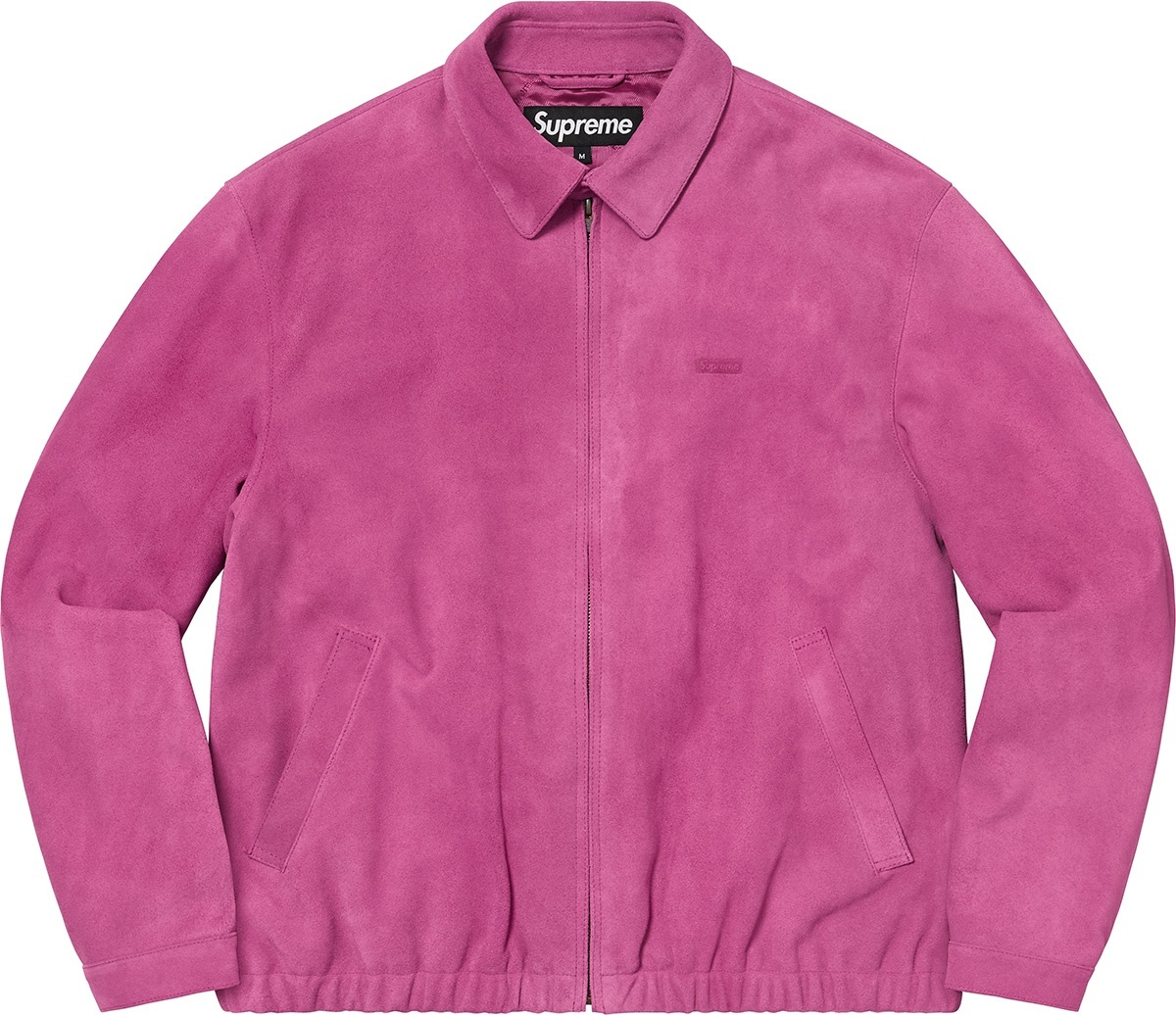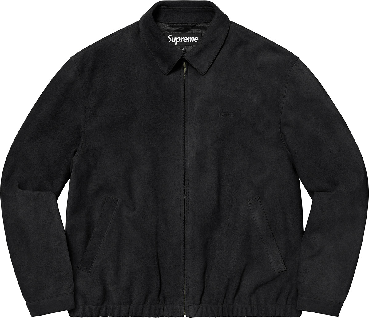Cowhide suede with jacquard logo viscose lining. Full zip closure with snap band closure at collar. Welt hand pockets at lower front and interior chest pocket. Snap adjusters at cuffs and elastic hem. Debossed logo at chest.