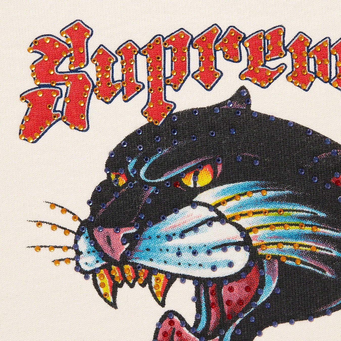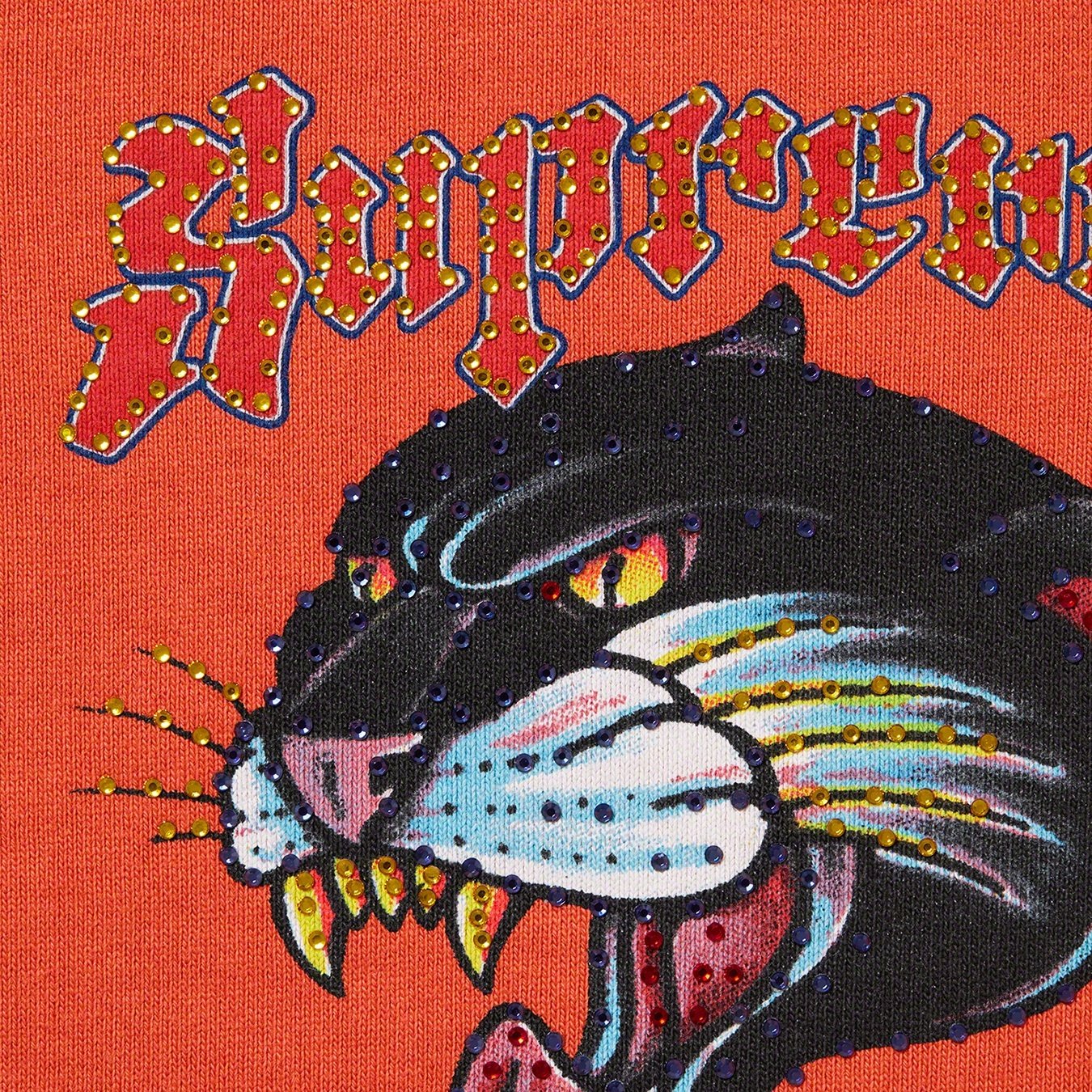 Cotton fleece with full zip closure and pouch pocket. Printed graphics and logos with rhinestones on hood, chest, sleeves and back.