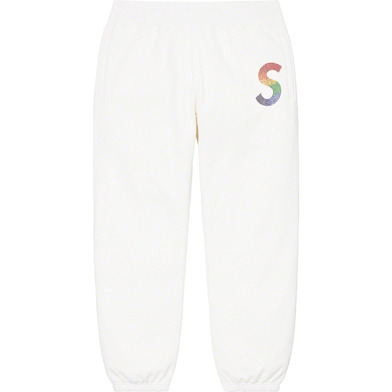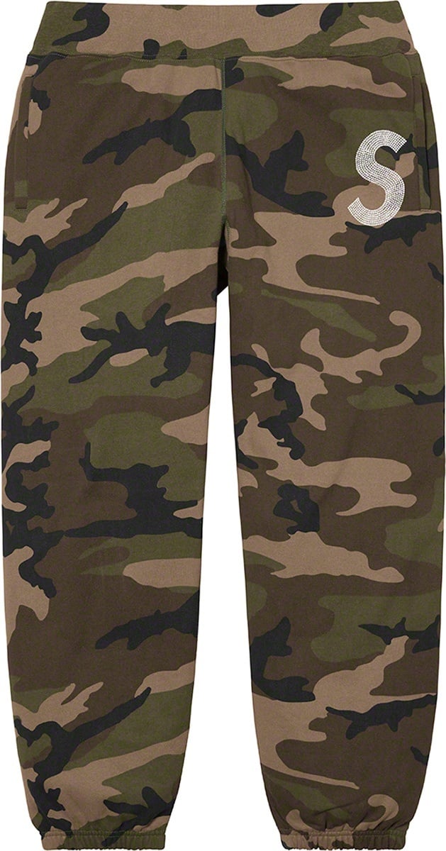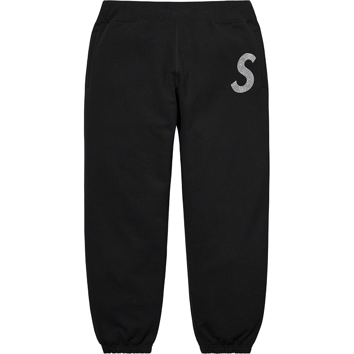Cotton fleece with welt hand pockets and single back patch pocket. Elastic cuffs and knit rib waistband with interior drawcord. Swarovski® crystal logo appliqué on thigh with embroidered logo on back pocket.