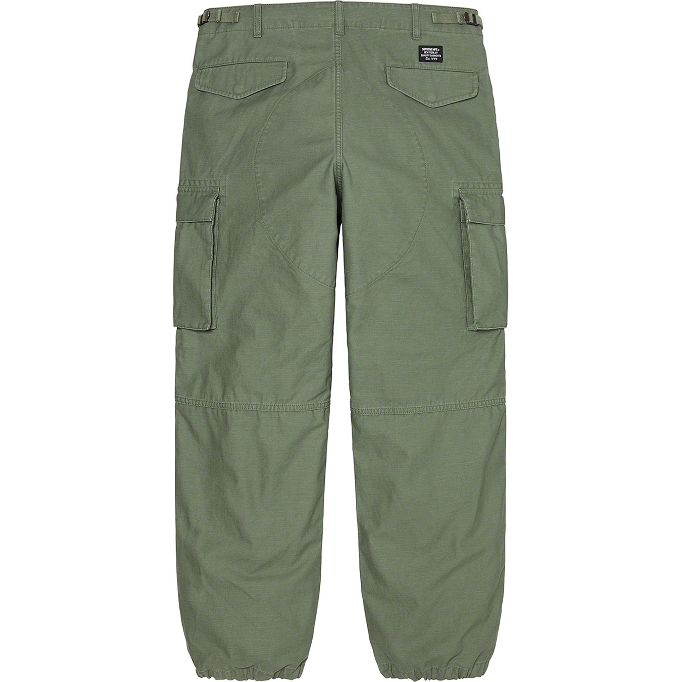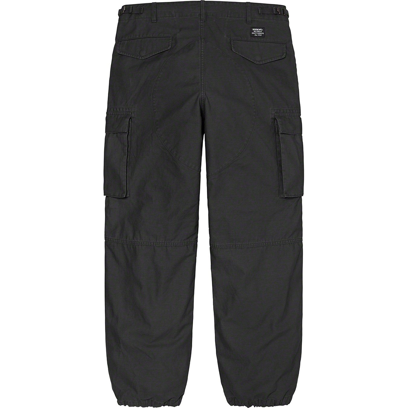 All cotton with enzyme wash. Slanted front pockets with snap flap closures, snap back pockets and snap cargo pockets on thigh. Button fly closure, twill tape size adjusters at waist and drawstring at cuffs.