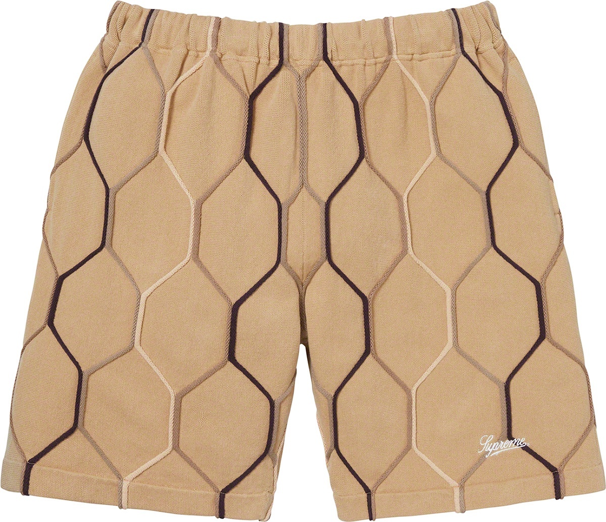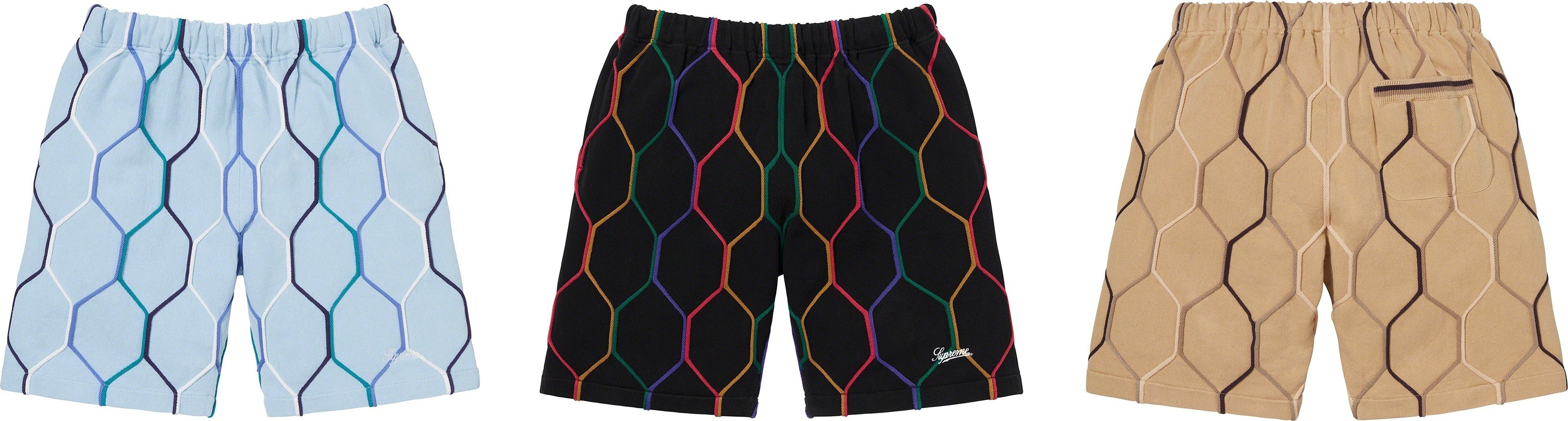 All cotton with knit pattern. On seam hand pockets and single back patch pocket. Elastic waistband with interior drawcord. Embroidered logo on lower leg.