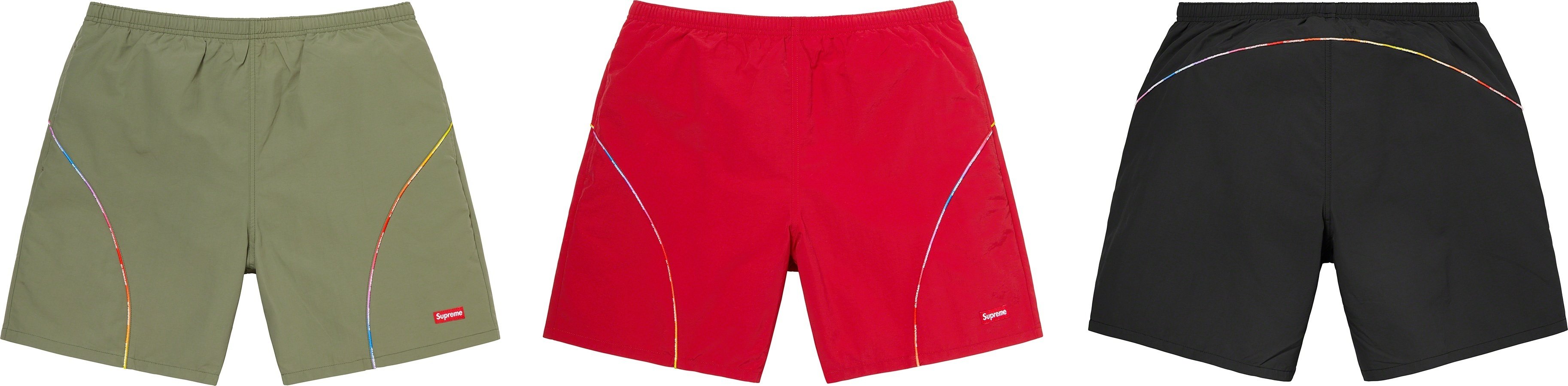 Supplex® nylon taslan with mesh lining. On seam hand pockets and elastic waistband with interior drawcord and interior hanging key pocket. Jacquard logo piping at front and seat. Woven logo label at left leg.