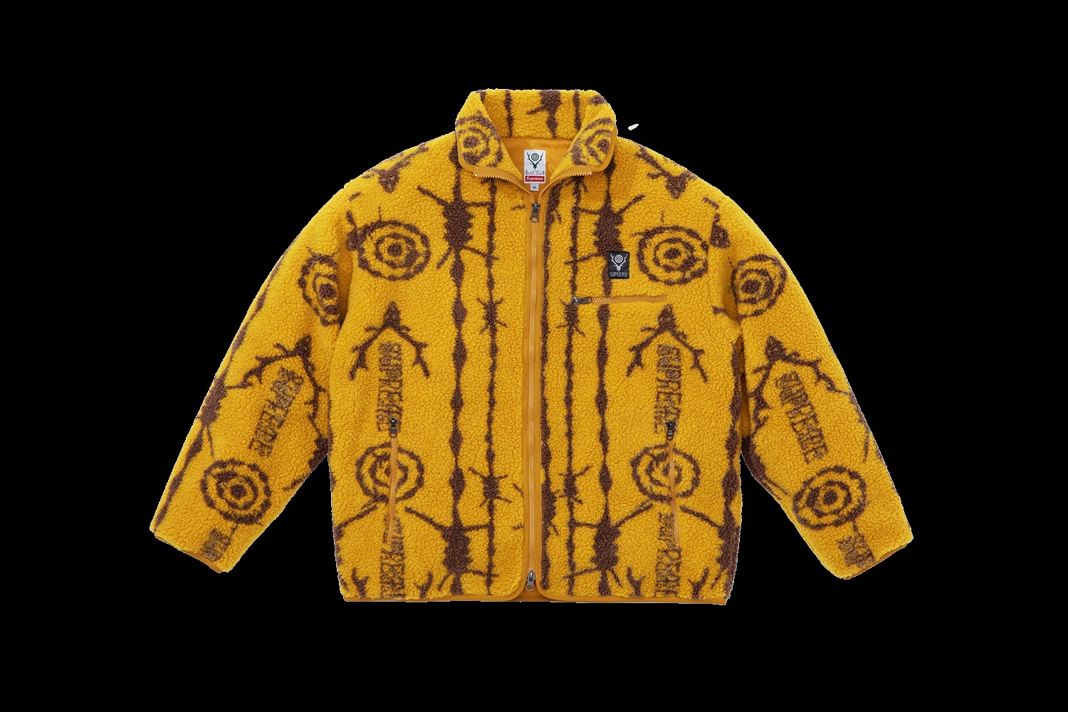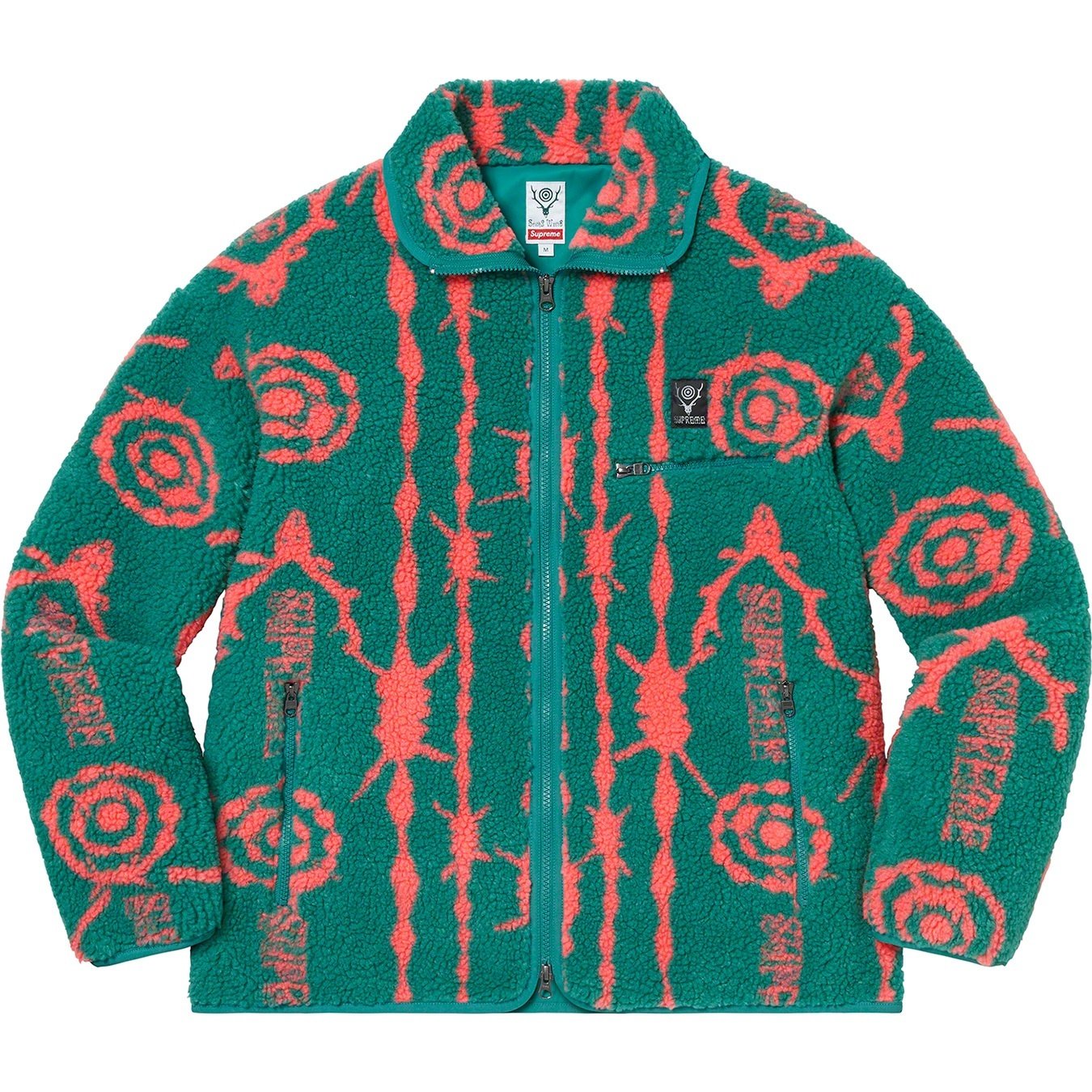 Sherpa fleece with satin lining and jacquard logo pattern. Full zip closure with zip pockets at lower front and chest. Woven logo label at chest pocket. Made exclusively for Supreme.