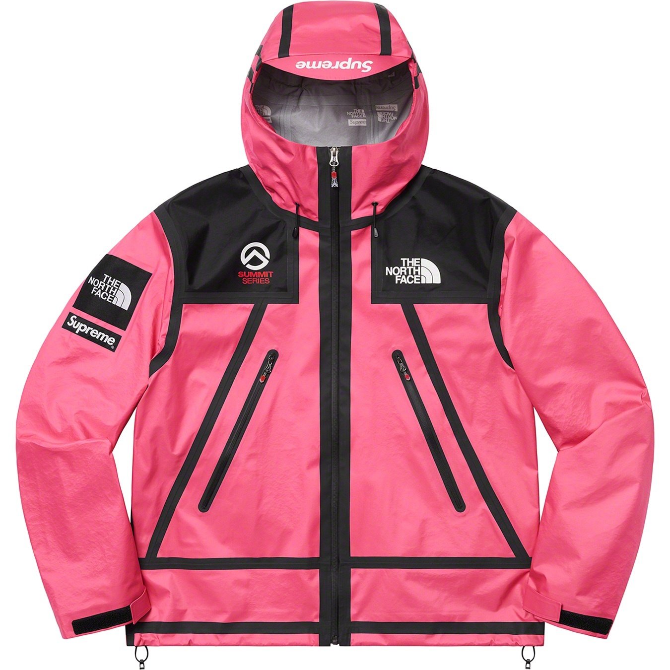 Water resistant nylon shell with printed logo tricot backing and taped seams. Waterproof full zip closure with waterproof zip Alpine pockets. Interior elastic shockcords at fixed hood and hem with velcro closures and D-Ring tabs at cuffs. Logo patches...