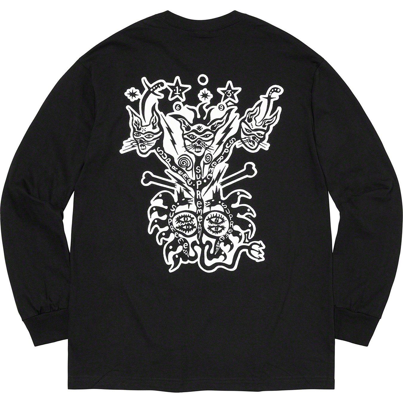 All cotton classic Supreme long-sleeve t-shirt with printed logos on sleeves and printed graphic on back. Original artwork by Clayton Patterson.