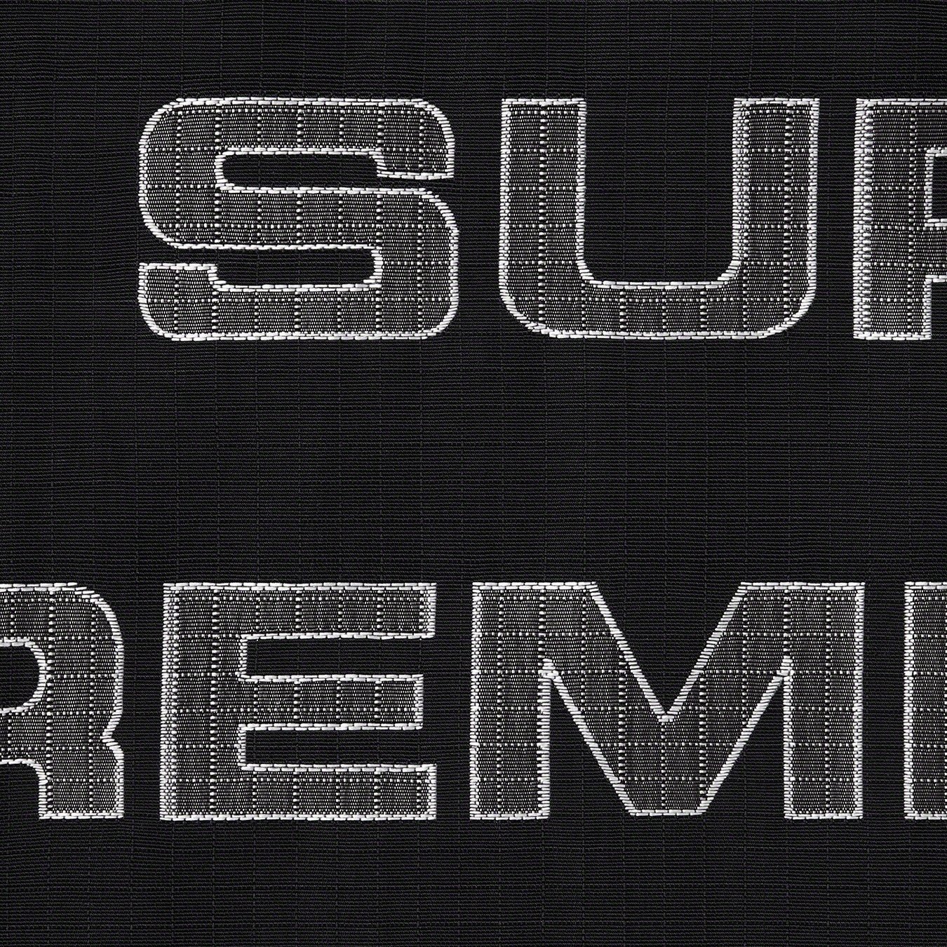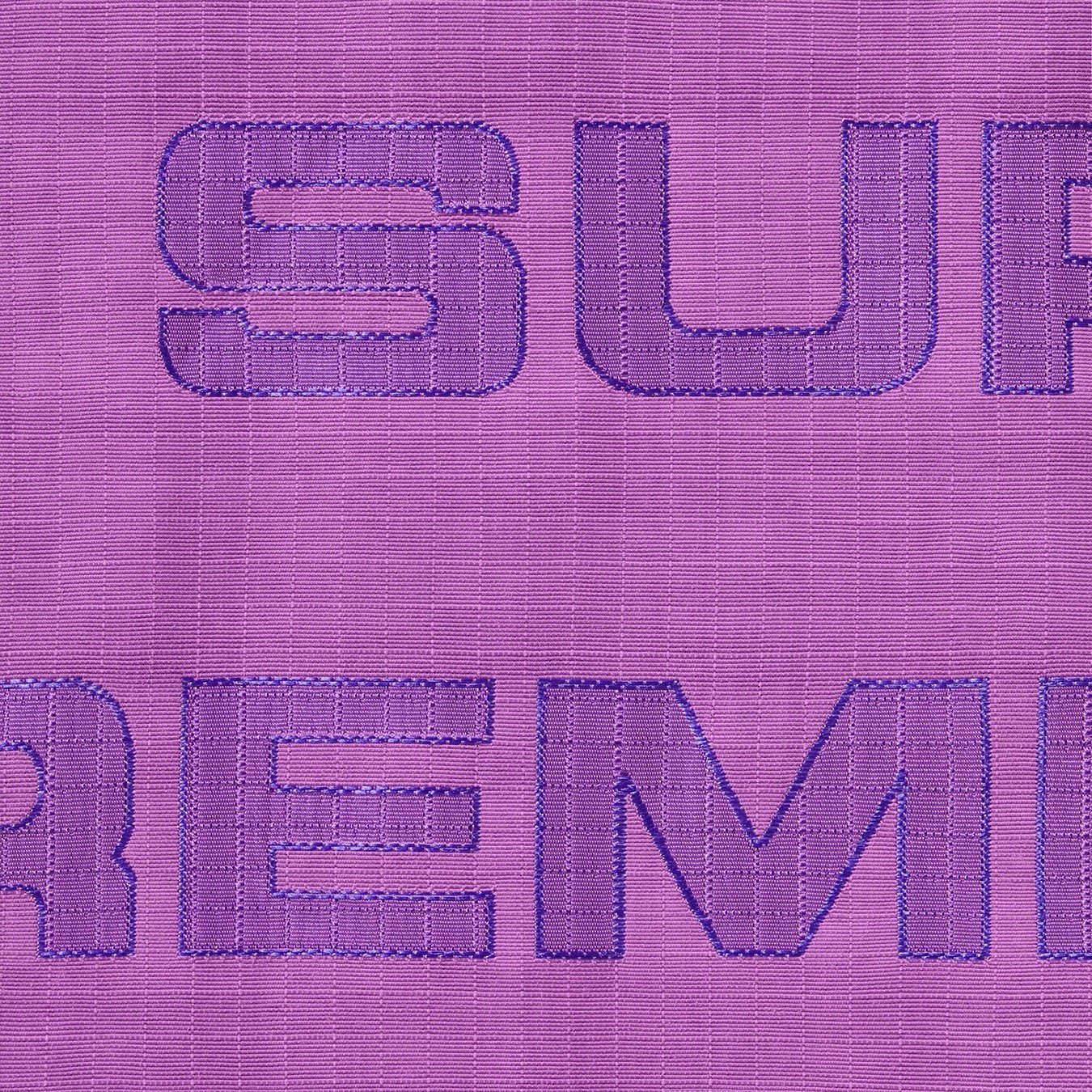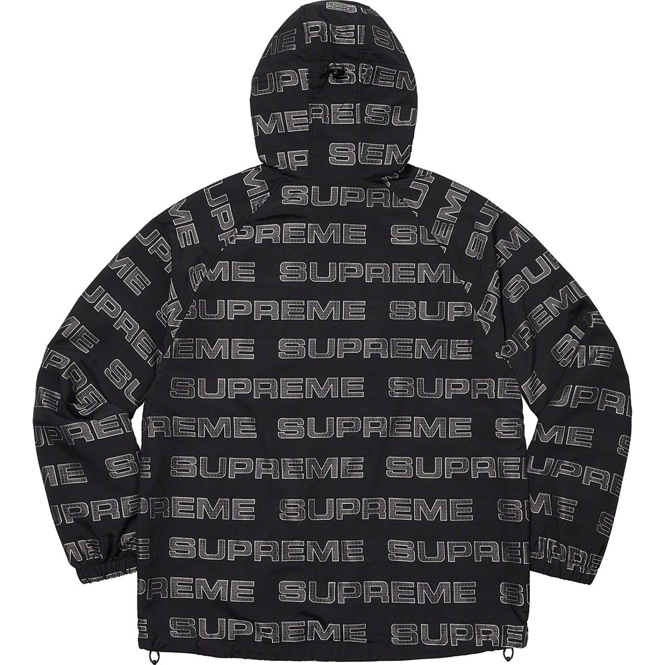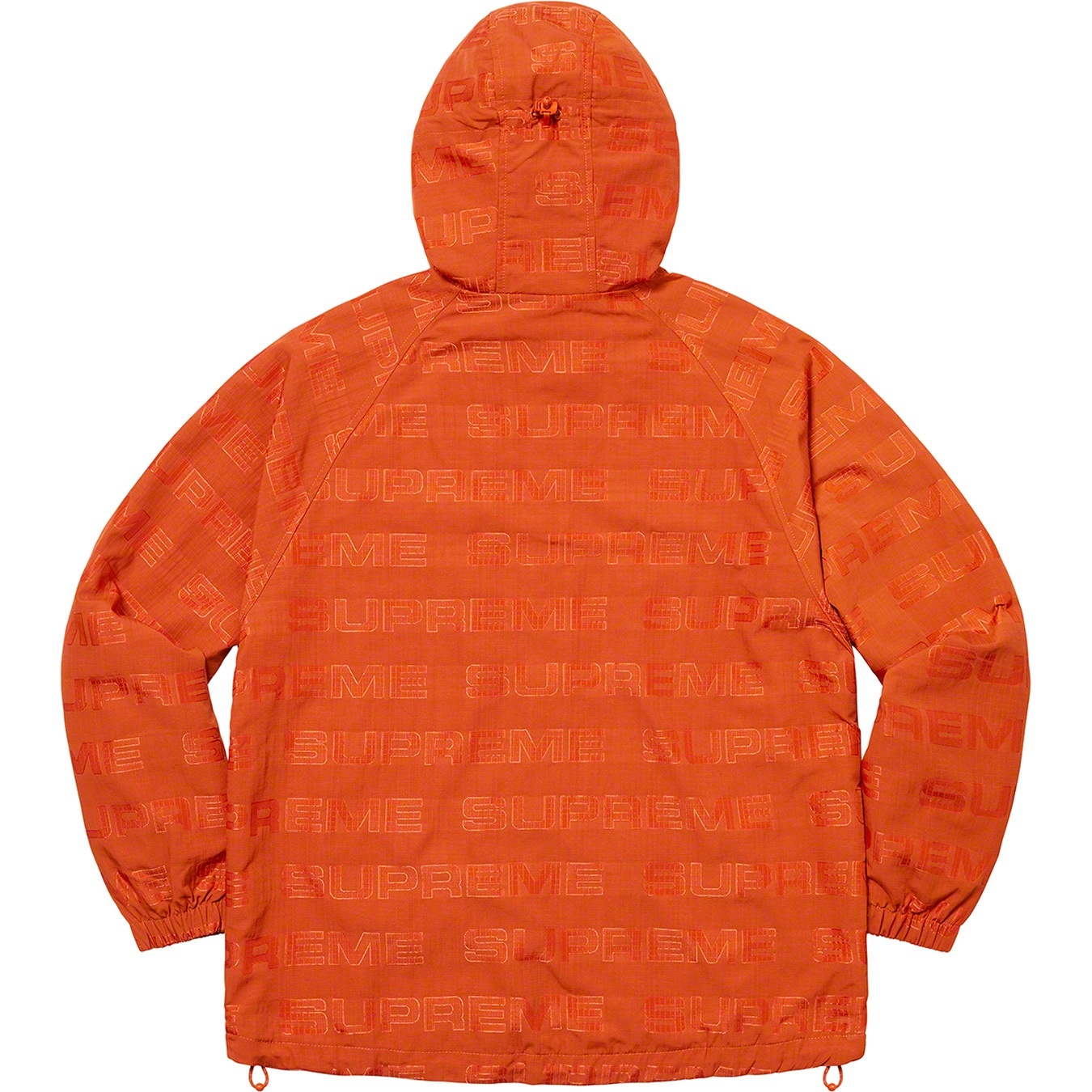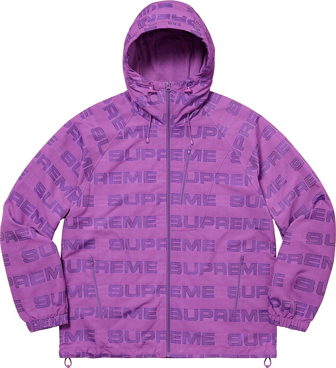 Water resistant Supplex® nylon ripstop with jacquard logo pattern, cotton jersey lining and taffeta sleeve lining. Zip hand pockets at lower front and zip chest pocket. Interior elastic shockcord at fixed hood and hem with elastic cuffs.