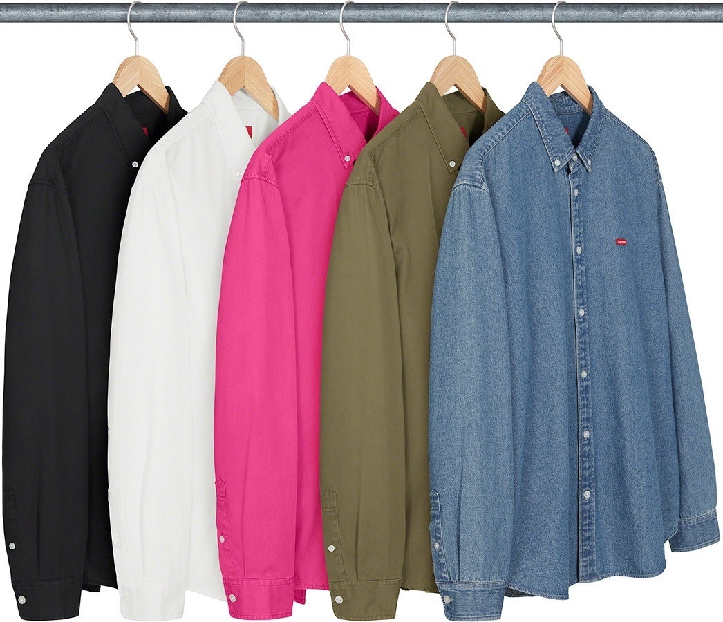 All cotton twill with button down collar and embroidered logo patch on chest.