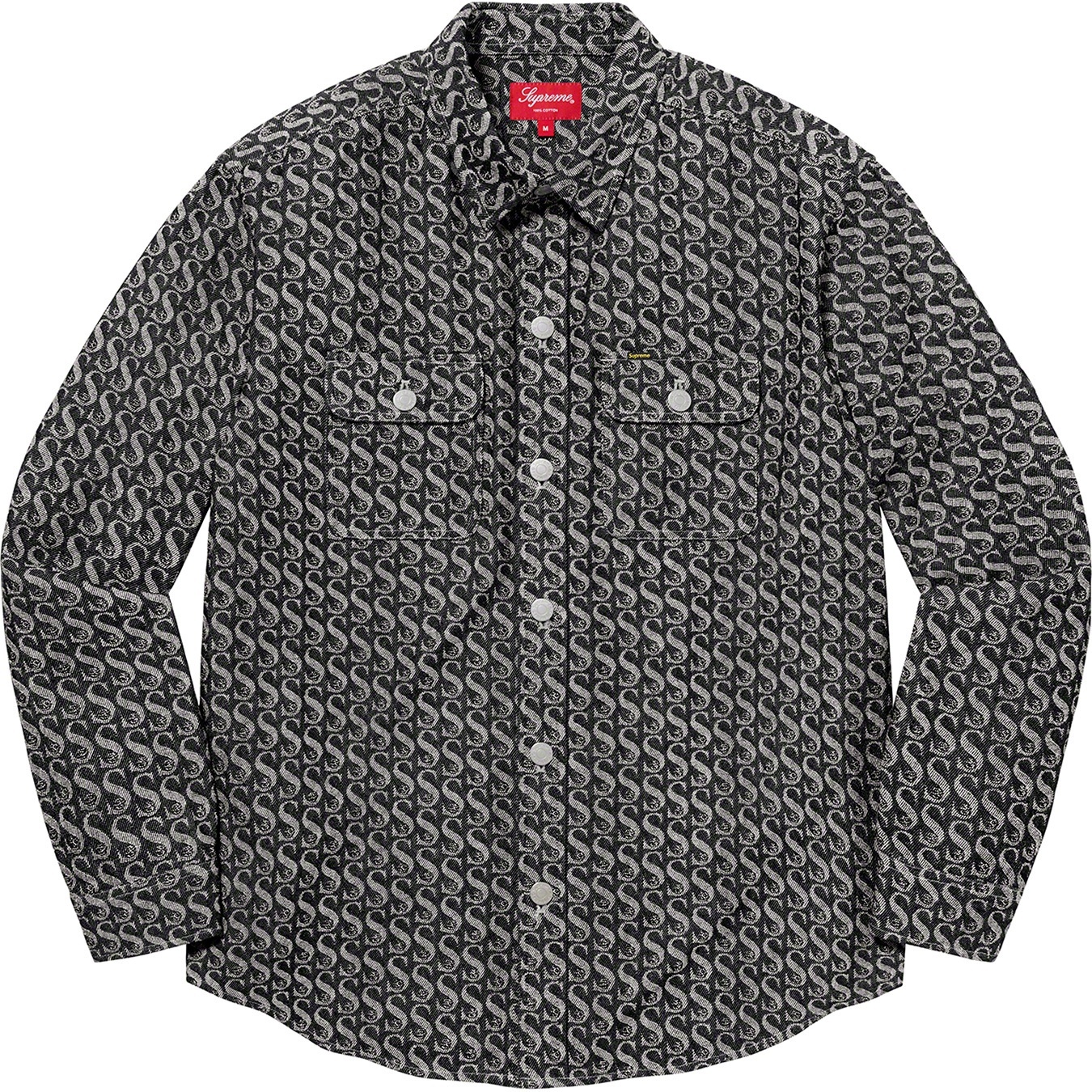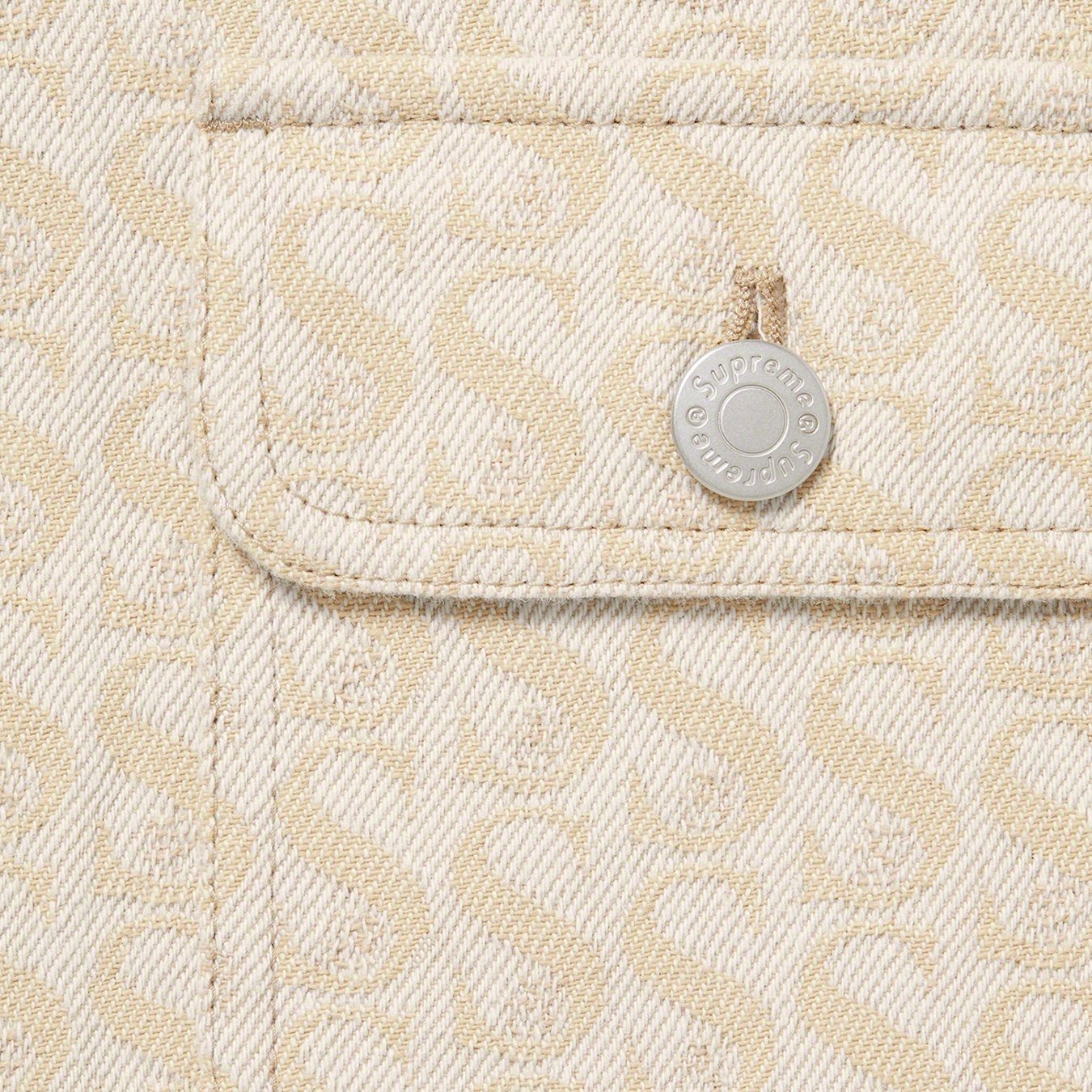All cotton denim with jacquard logo pattern and button flap patch pockets at chest.