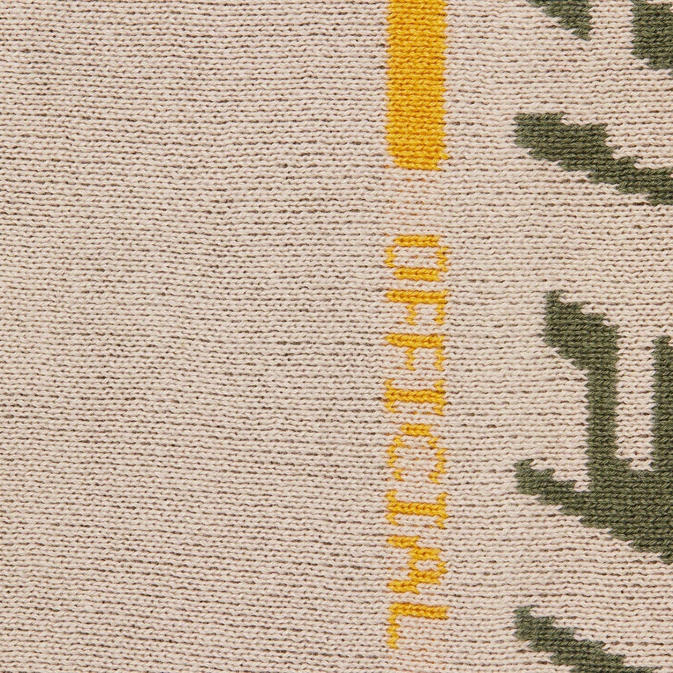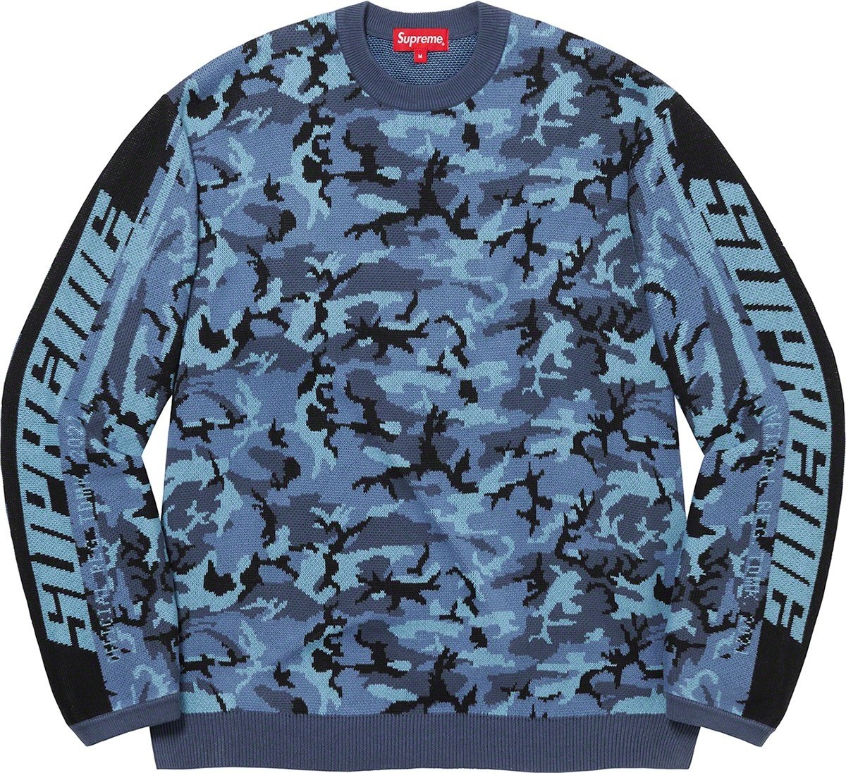 All cotton with jacquard knit logos at sleeves.