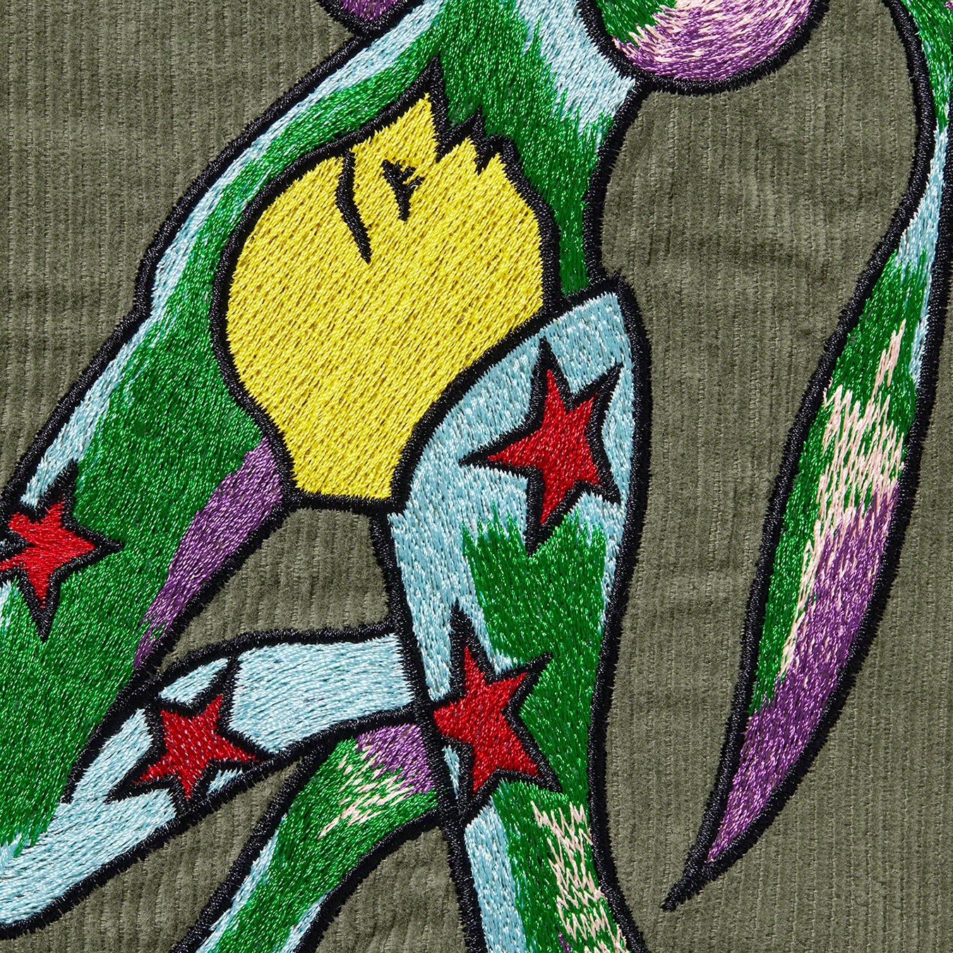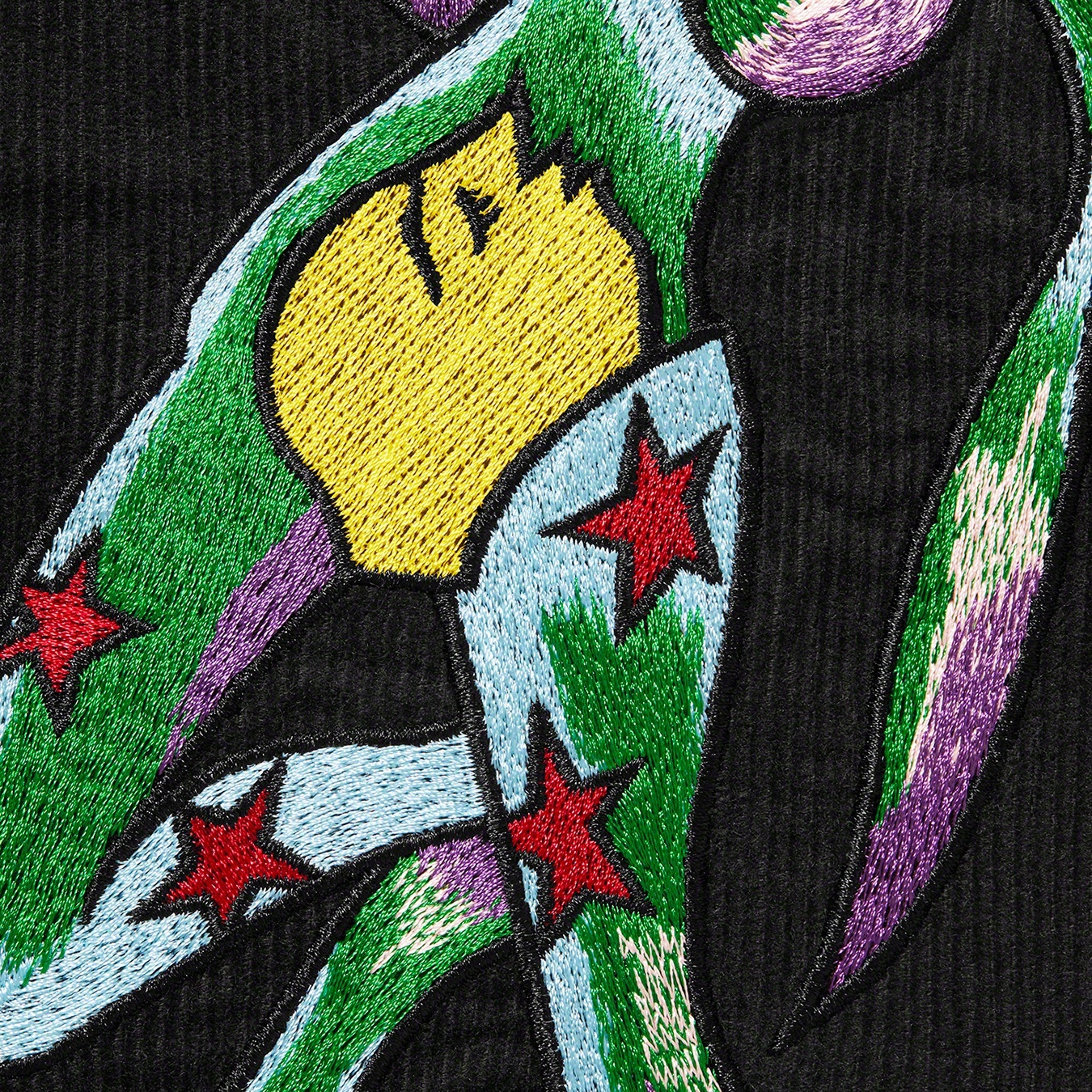 All cotton corduroy. Relaxed fit with on seam hand pockets, welt back pockets and button fly closure. Embroidered graphics at lower leg and back pocket. Original artwork by Mark Gonzales.