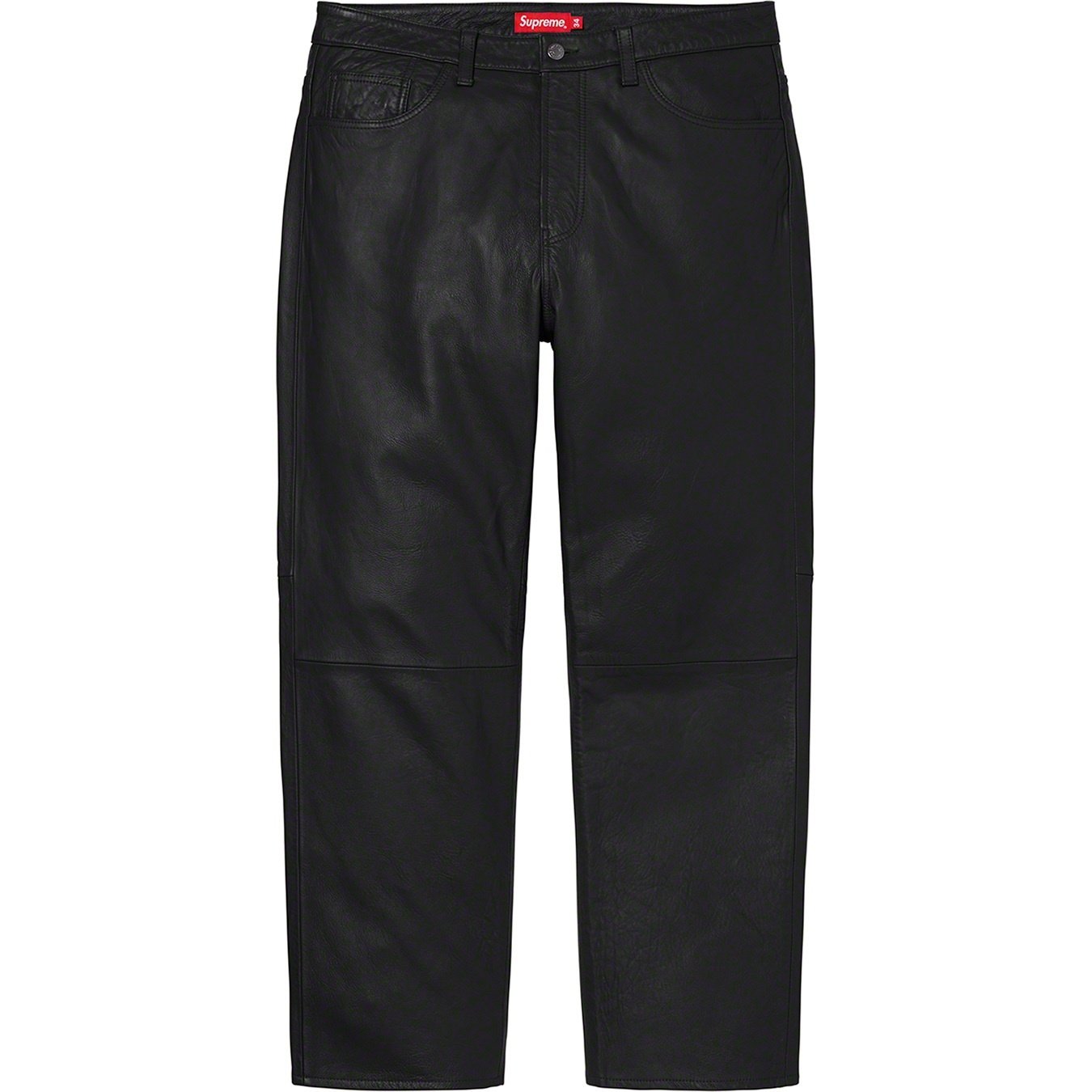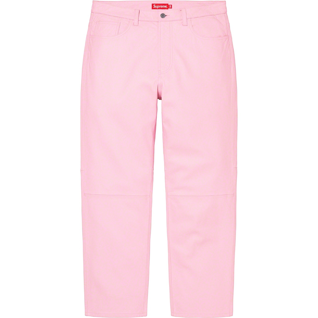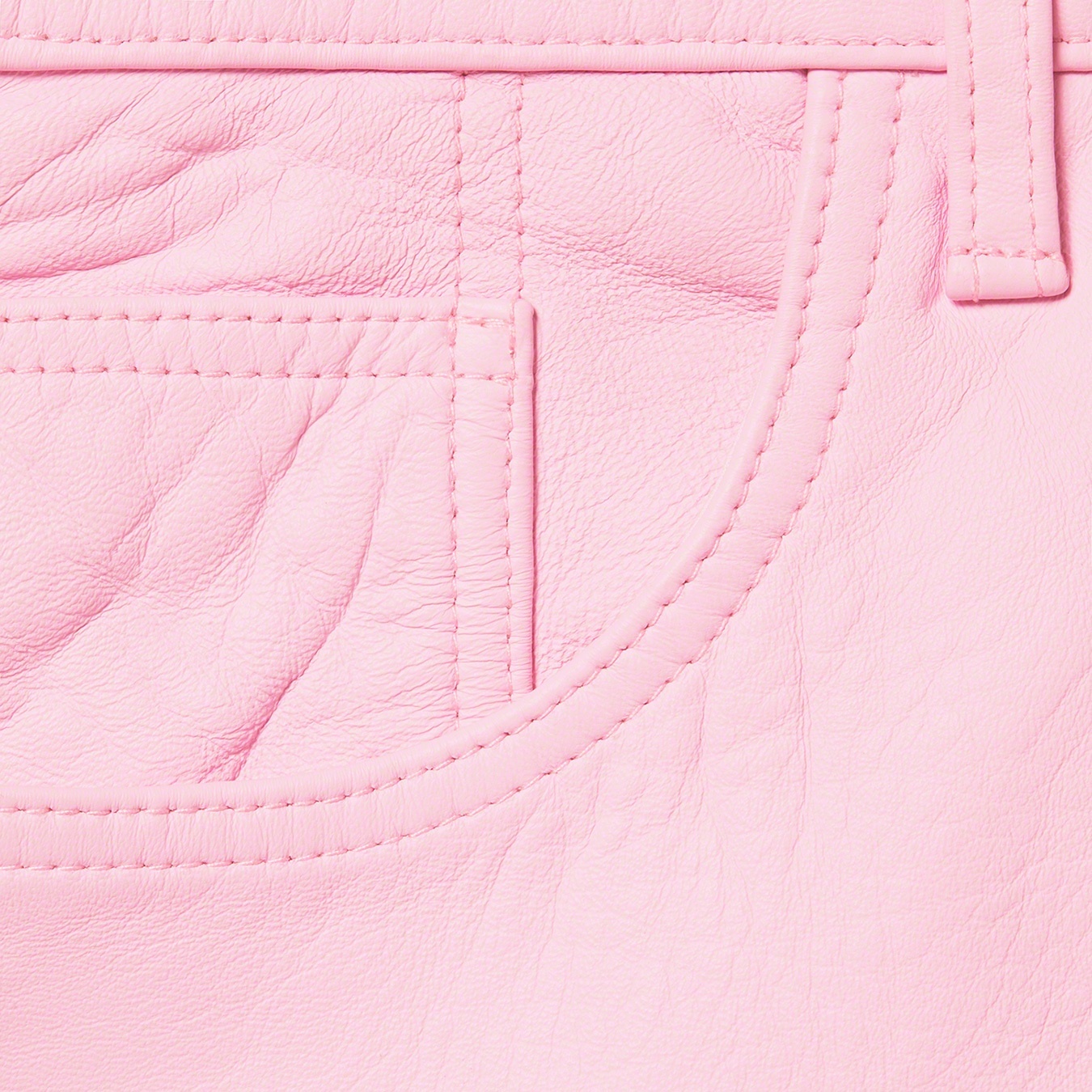Lambskin leather with taffeta lining. Classic 5-pocket style with zip fly, single coin pocket and leather logo patch on back.