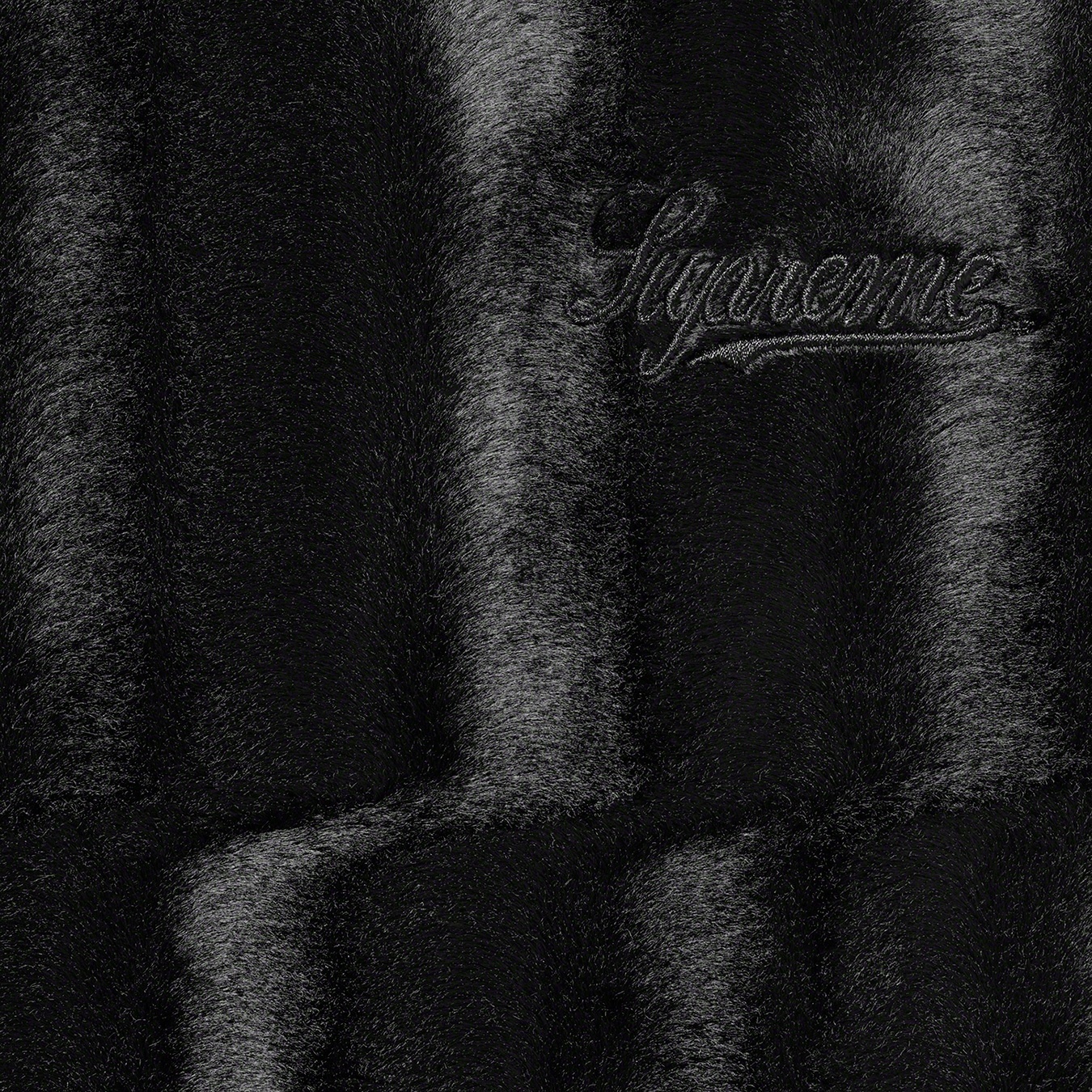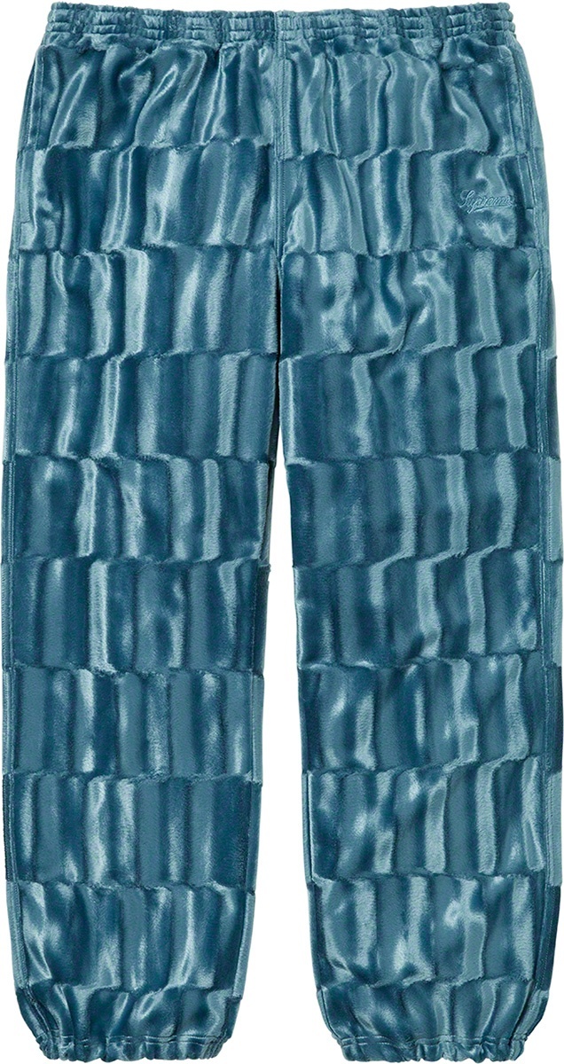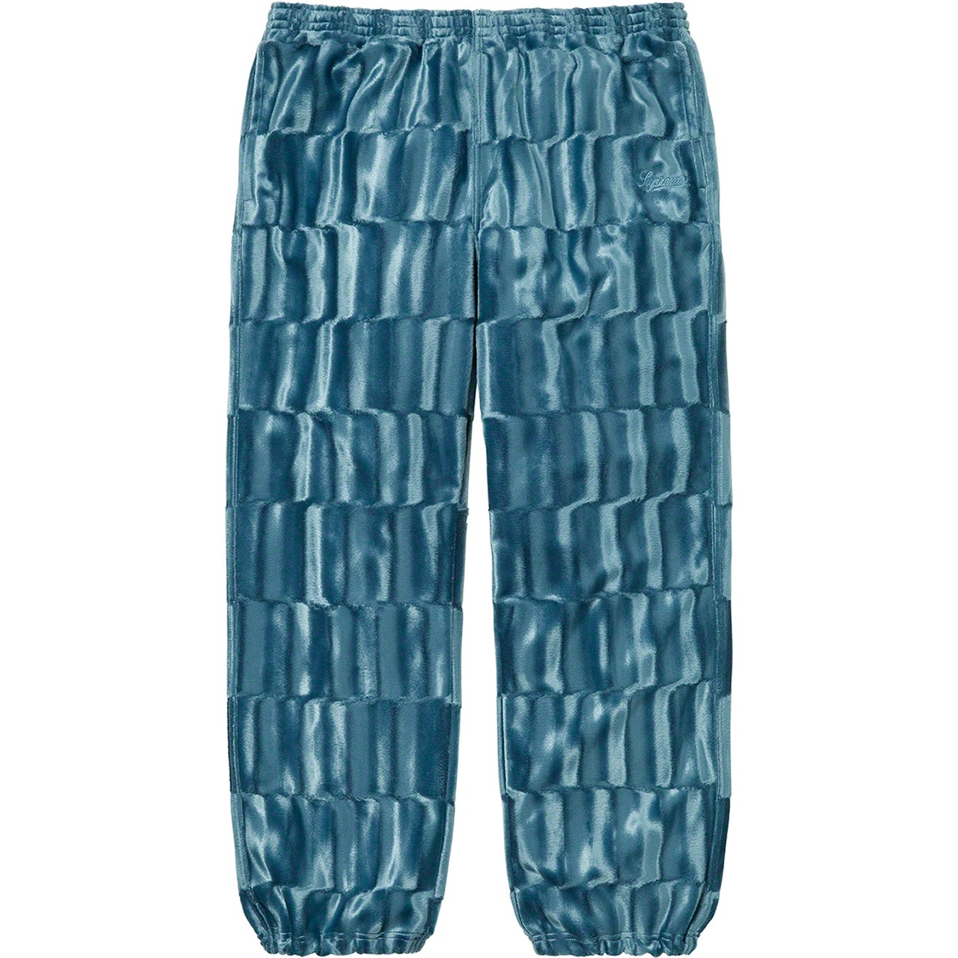 Poly velour with stamped pattern. On seam hand pockets and single back zip pocket. Elastic waistband with interior drawcord and interior elastic shockcord at cuffs. Embroidered logo at thigh.